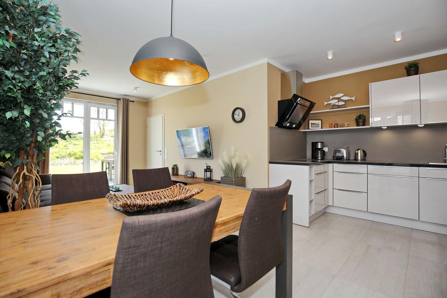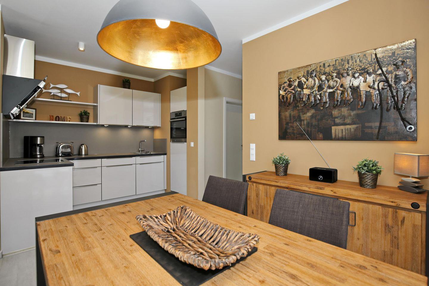 Die moderne Küchenzeile ist mit einem 4-Zonen-Cerankochfeld, einem Backofen, einem Geschirrspüler sowie einem Kühlschrank mit Gefrierfach voll ausgestattet. Technische Kleingeräte wie ein Wasserkocher, ein Toaster sowie ein Kaffeeservice stehen dir auf Knopfdruck zur Verfügung.
