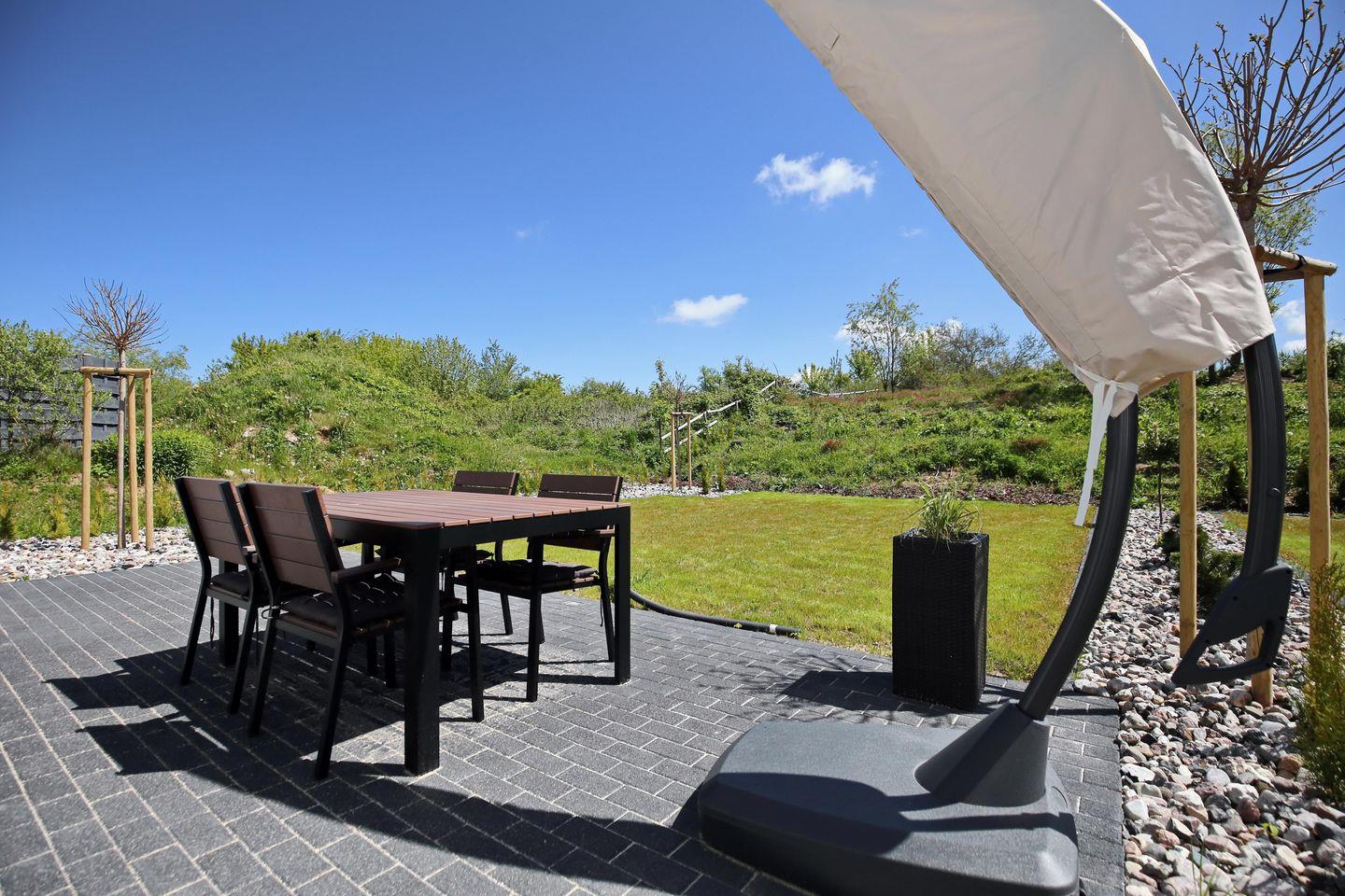 In einer ruhigen Wohngegend befindet sich das neu gebaute Haus mit 4 Bereichen auf einem 700 m² großen Grundstück. Die Süd-Ost-Ausrichtung des Hauses bietet bei schönem Wetter viel Sonne auf der großen 14 m² Terrasse mit Blick ins Grüne. Gartenmöbel und eine Sonnenliege stehen dir zur Verfügung. Ein Spaziergang zum ca. 3 km entfernten Ostseestrand lohnt sich bei jedem Wetter.
