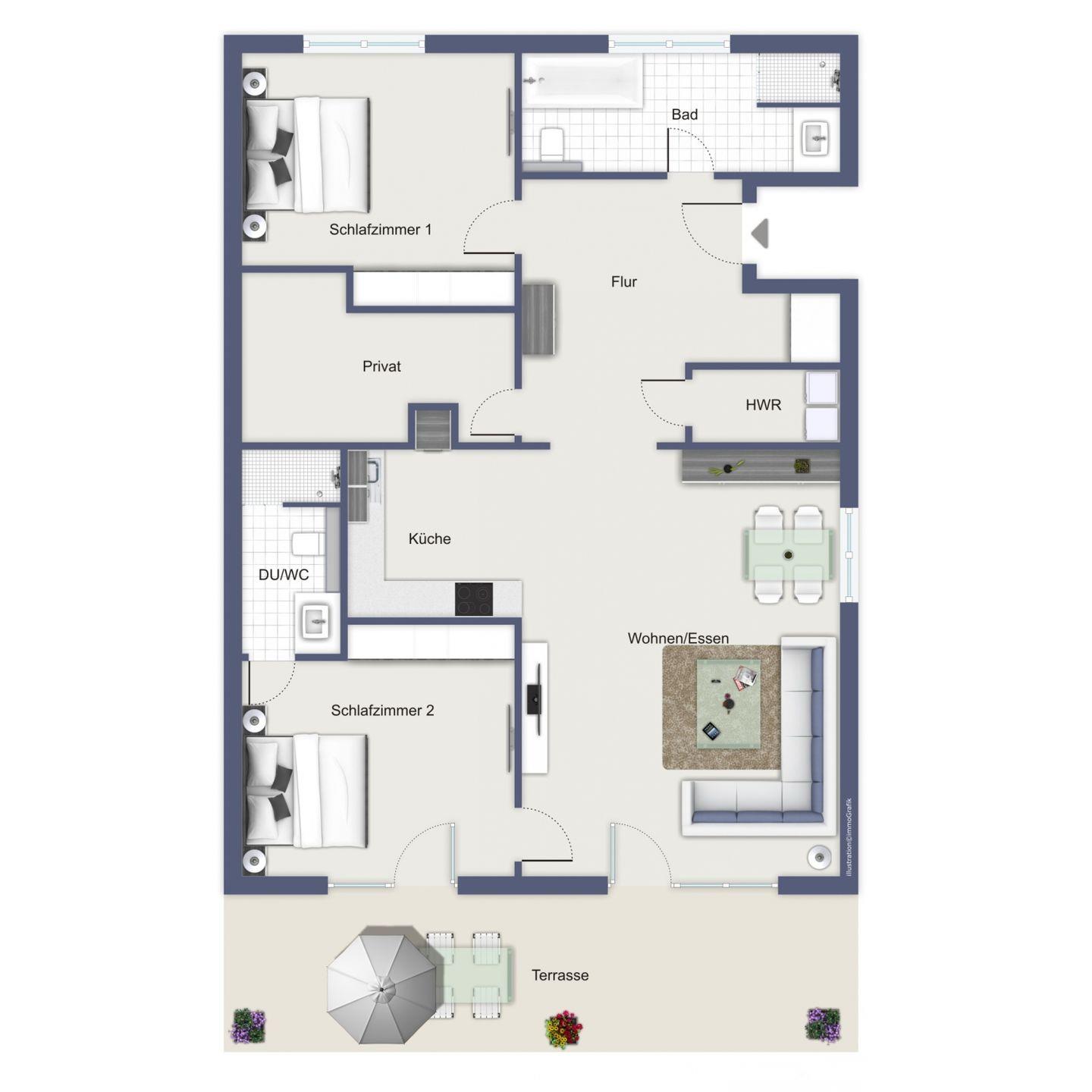 Der Bereich Sommer in dem "Haus am Wald" ist eine 3-Zimmer-Wohnung mit einer Größe von etwa 80 m². Zu dem Bereich gehört eine Terrasse.