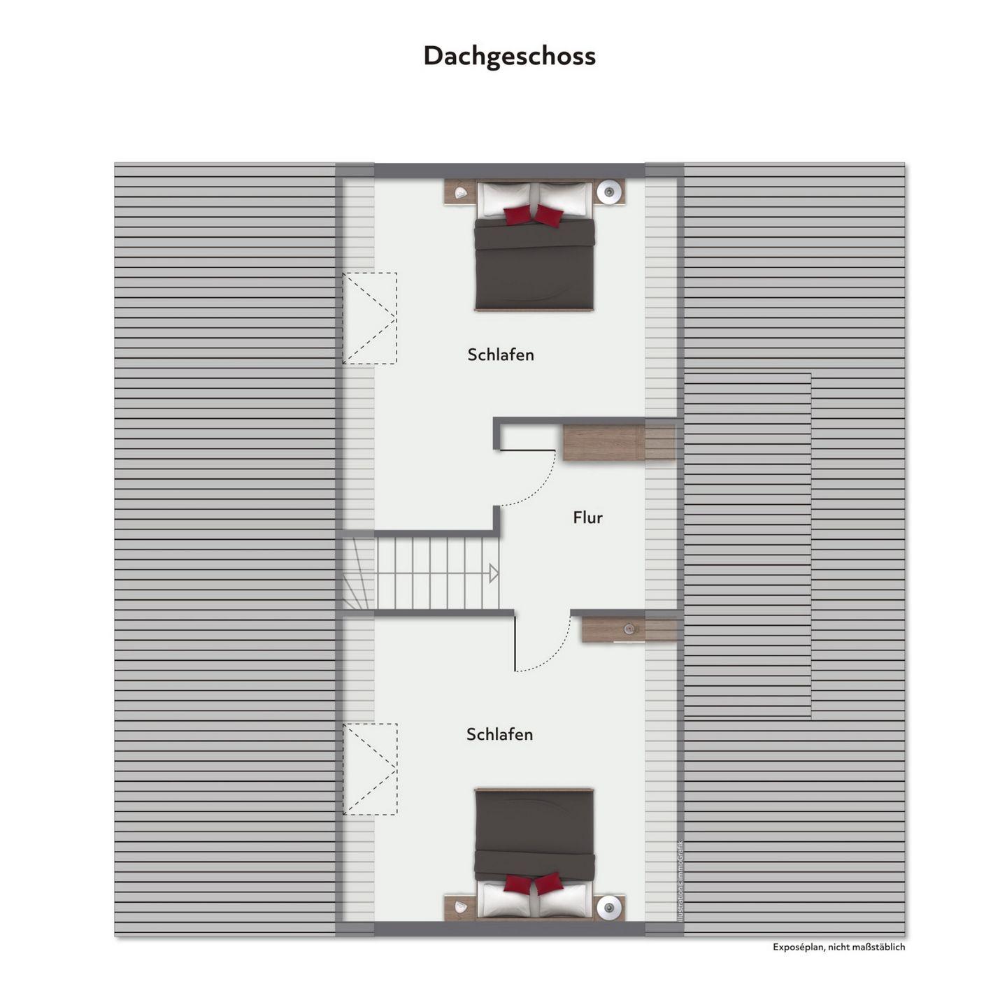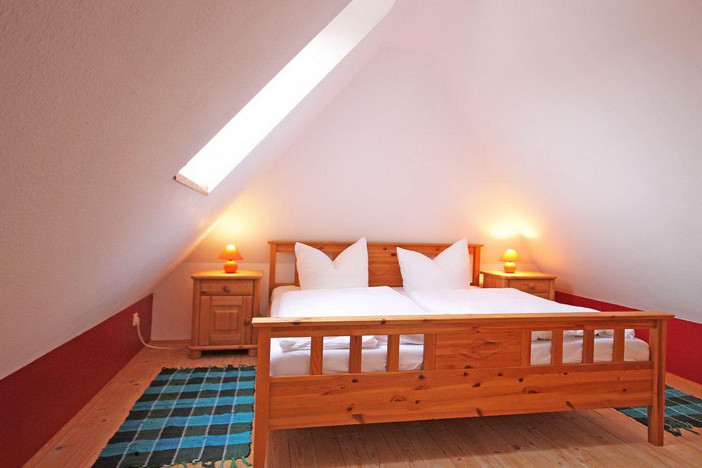 In der oberen Etage, über eine Raumspartreppe erreichbar, befinden sich 2 Schlafzimmer. Beide Schlafzimmer sind für Sie mit einem komfortablen Doppelbett (2 x 90 x 200 cm) und einem Kleiderschrank eingerichtet.