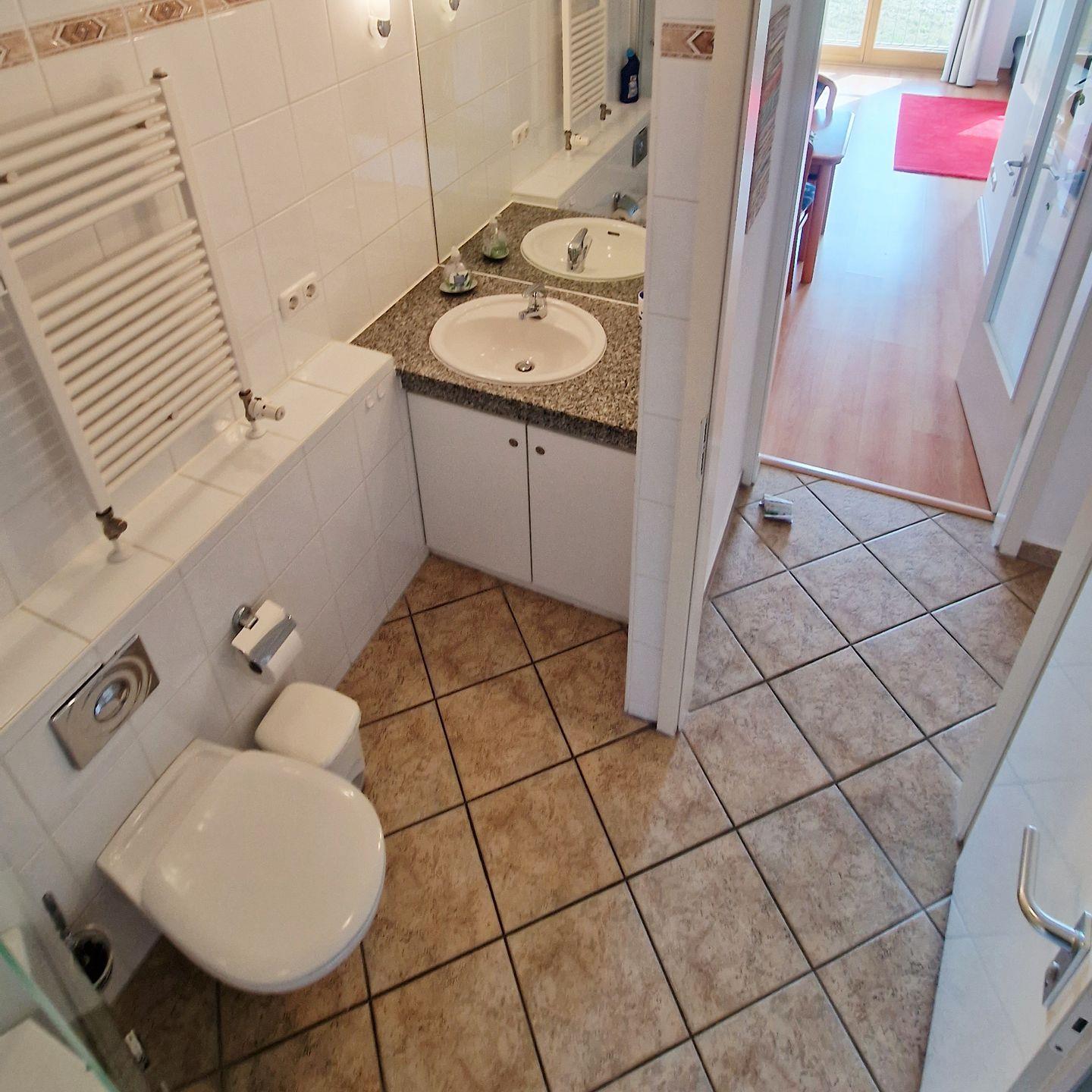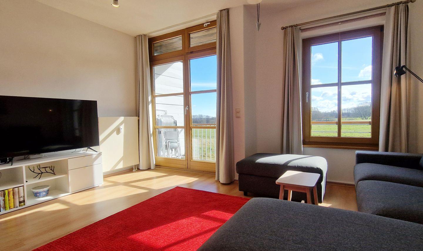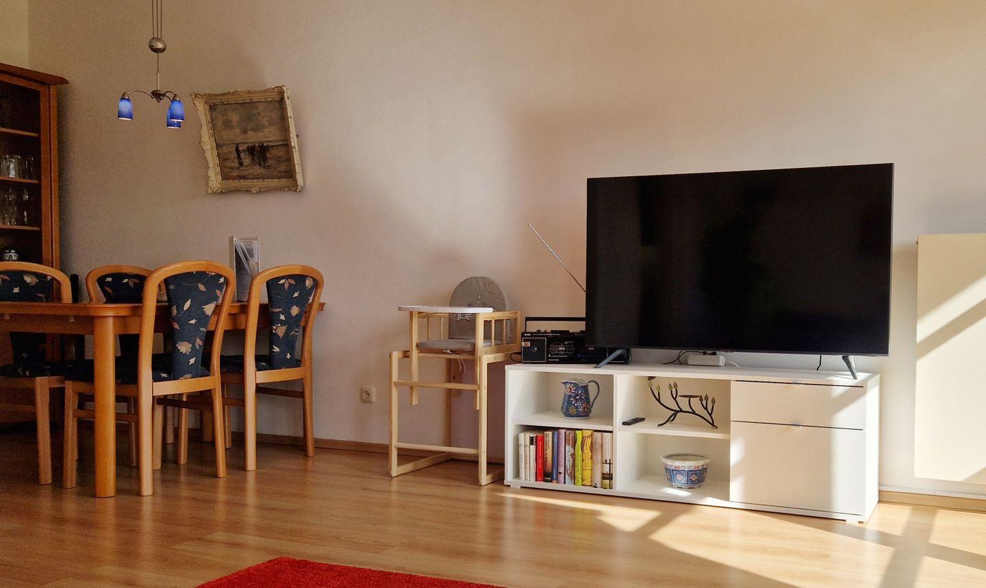 Im Wohnzimmer befindet sich eine bequeme Sitzecke mit Smart-TV (ARD ist verfügbar; für weitere Sender wird ein Stick benötigt) sowie Zugang zum Ostbalkon.