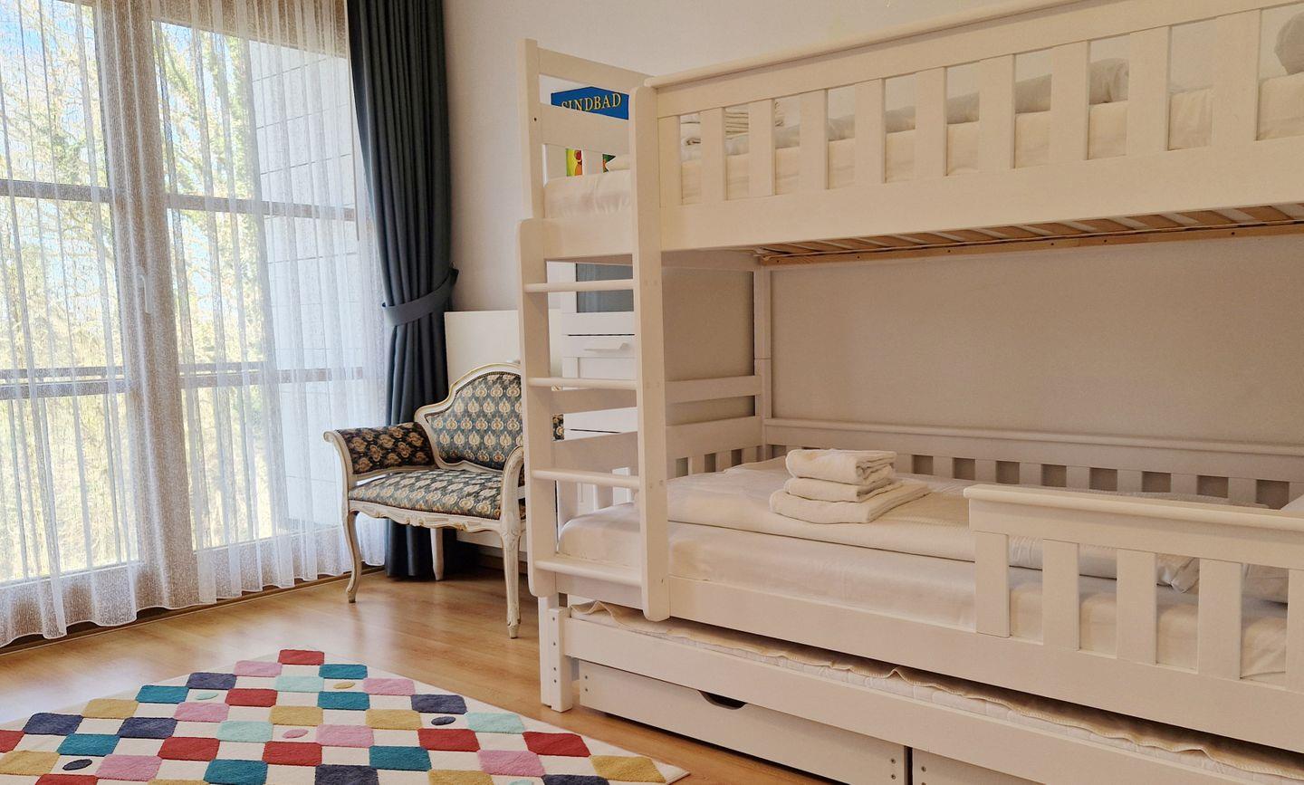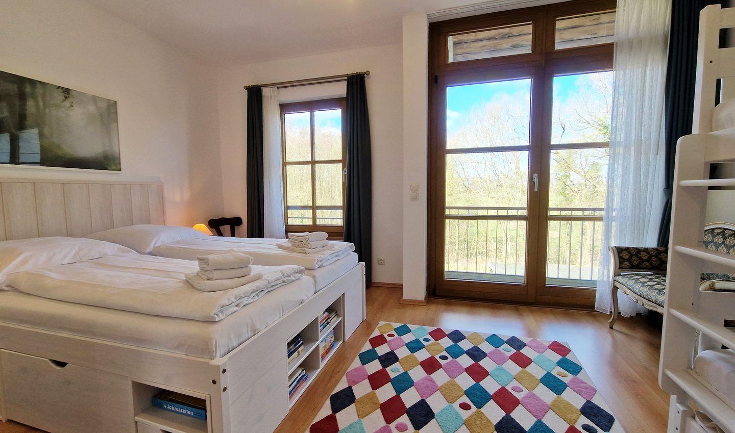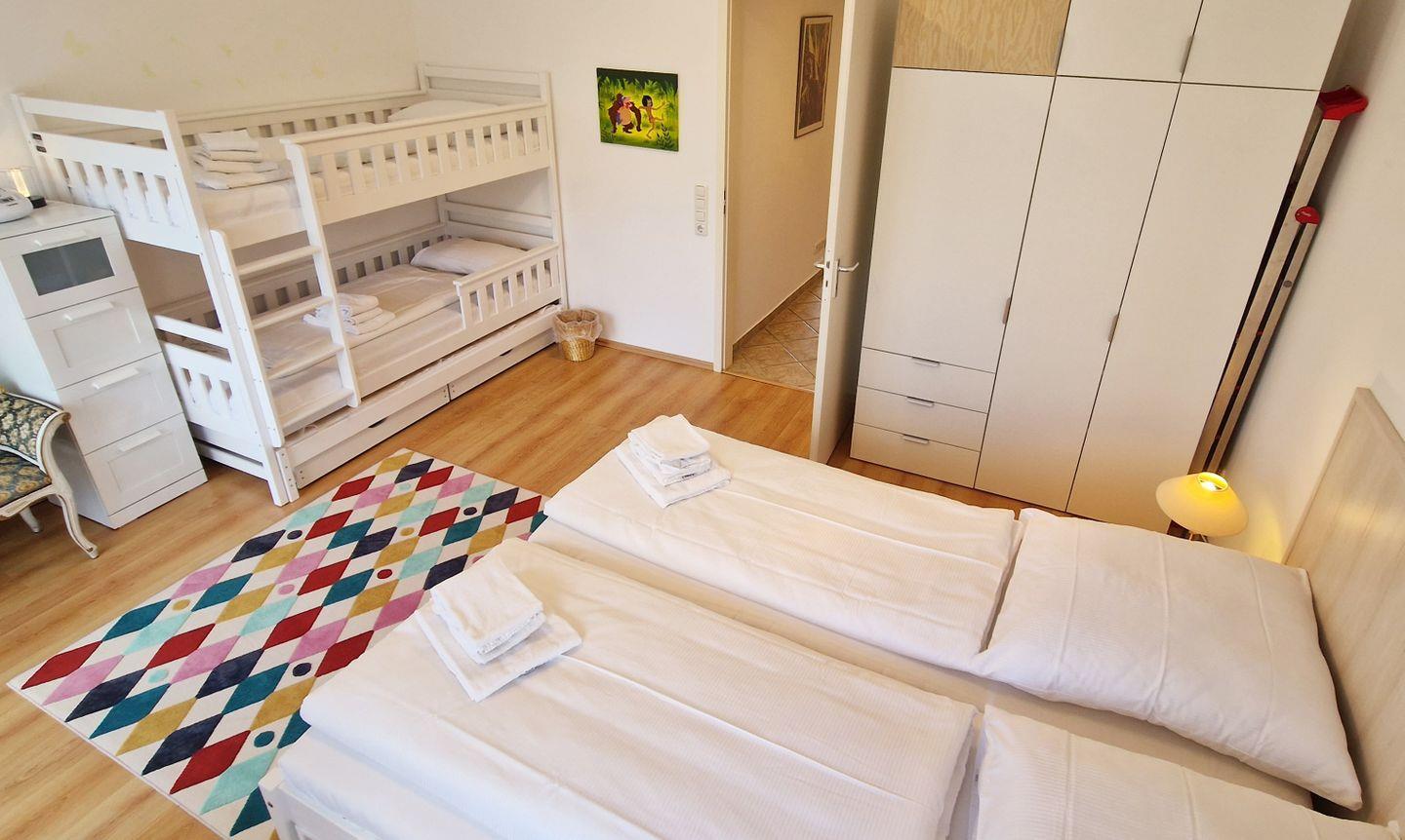Im Schlafzimmer befindet sich ein gemütliches Doppelbett, sowie ein Etagenbett für bis zu 3 Personen. Ein großzügiger Kleiderschrank bietet Platz für alle.