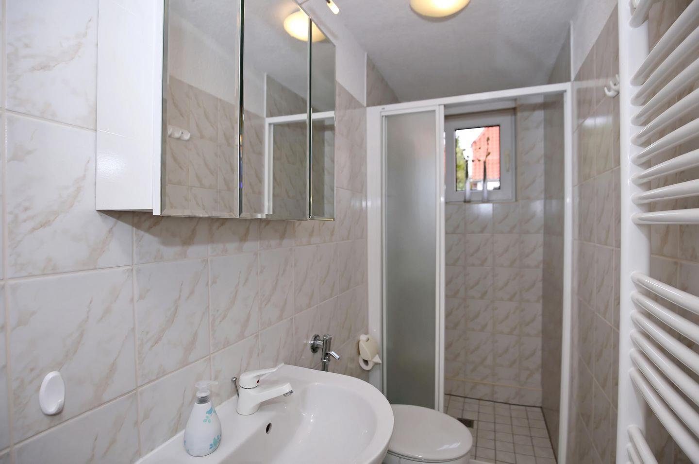 Zum Tageslichtbad mit Dusche und WC gehören ein Waschtisch mit beleuchtetem Spiegel sowie ein Föhn. Im Flur, in der Küche und im Badezimmer sind Bodenfliesen verlegt. Der Schlafraum und das Schlafzimmer sind mit Laminat ausgestattet.
