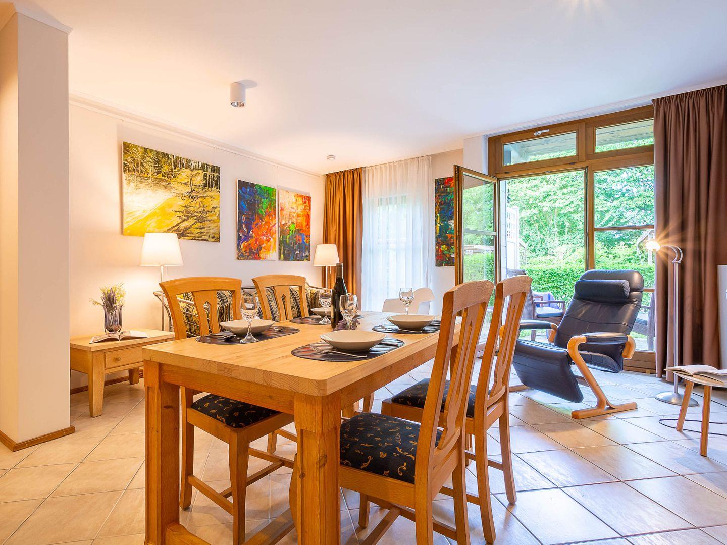 Der mit viel Liebe und individuellen Details gestaltete Wohnbereich lädt mit einem bequemen Sofa, einem gemütlichen Schwingsessel und einem modernen TV zum Entspannen ein. Gleich daneben befindet sich der stilvolle Essbereich, an dem Sie Ihre Mahlzeiten genießen können. Für die passende Atmosphäre sorgt zudem ein Radio.