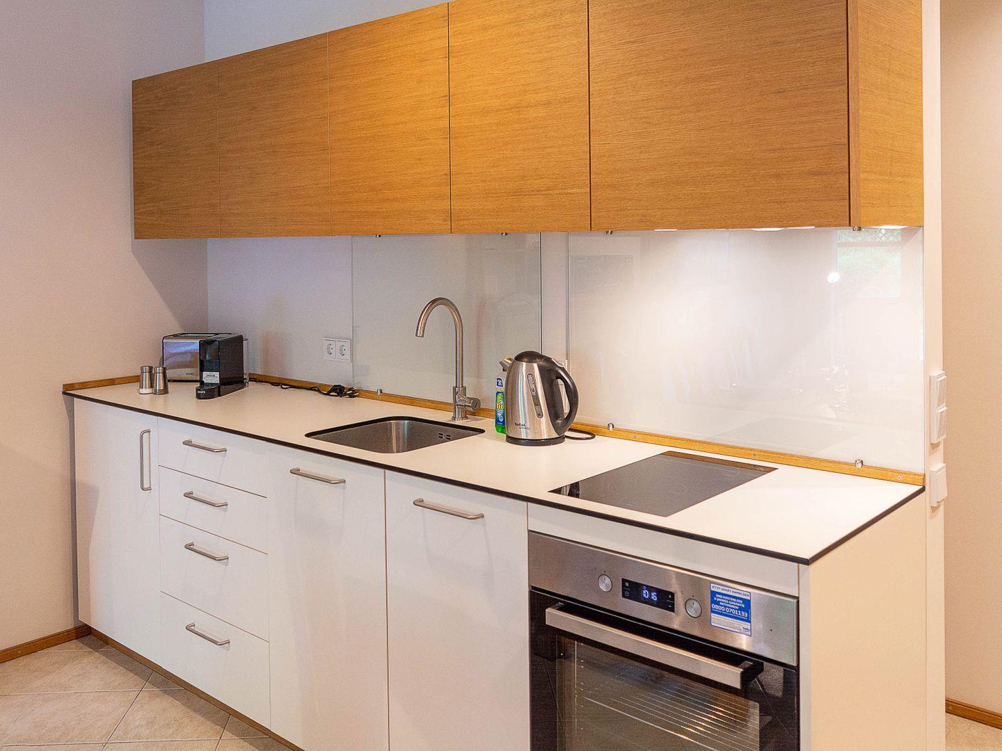 Die offene Küche ist voll ausgestattet und lässt keine Wünsche offen: Neben einem Induktionsherd, einem Backofen und einem Geschirrspüler stehen Ihnen auch eine Kaffeepadmaschine, ein Wasserkocher und ein Toaster zur Verfügung. Der Kühlschrank bietet zudem ein kleines Gefrierfach.