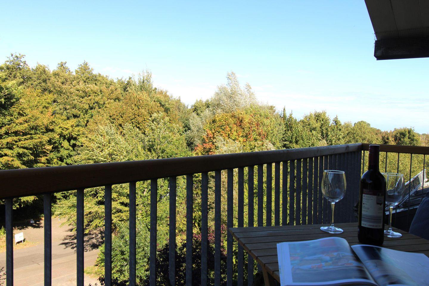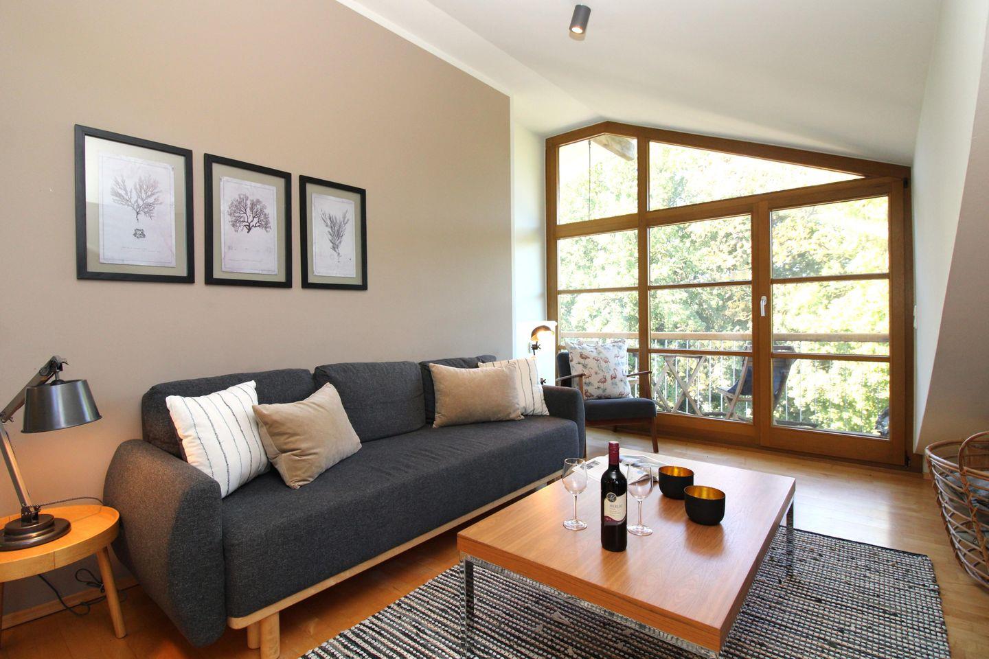 Das lichtdurchflutete und moderne Wohn-/Esszimmer mit großen bodentiefen Fenstern verfügt über eine separate Sitzgruppe mit bequemer ausziehbarer (Schlaf)-Couch, Sessel und Couchtisch, einen separaten Esstisch mit 4 Stühlen sowie verschiedene Regale. Vom Wohnzimmer aus haben Sie direkten Zugang zu den 2 großen und teilweise überdachten Balkonen (nach Nord-Osten bzw. Süd-Westen ausgerichtet) mit Balkonmöbeln. Hier sitzen Sie entspannt und gemütlich mitten im Grünen und können abends bei einem guten Glas Wein in Ruhe die lauen Sommernächte genießen!