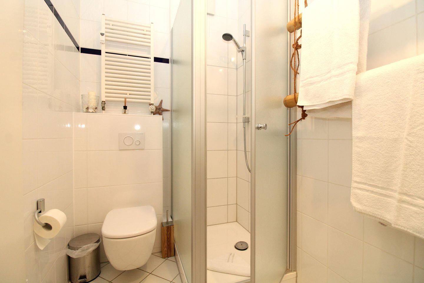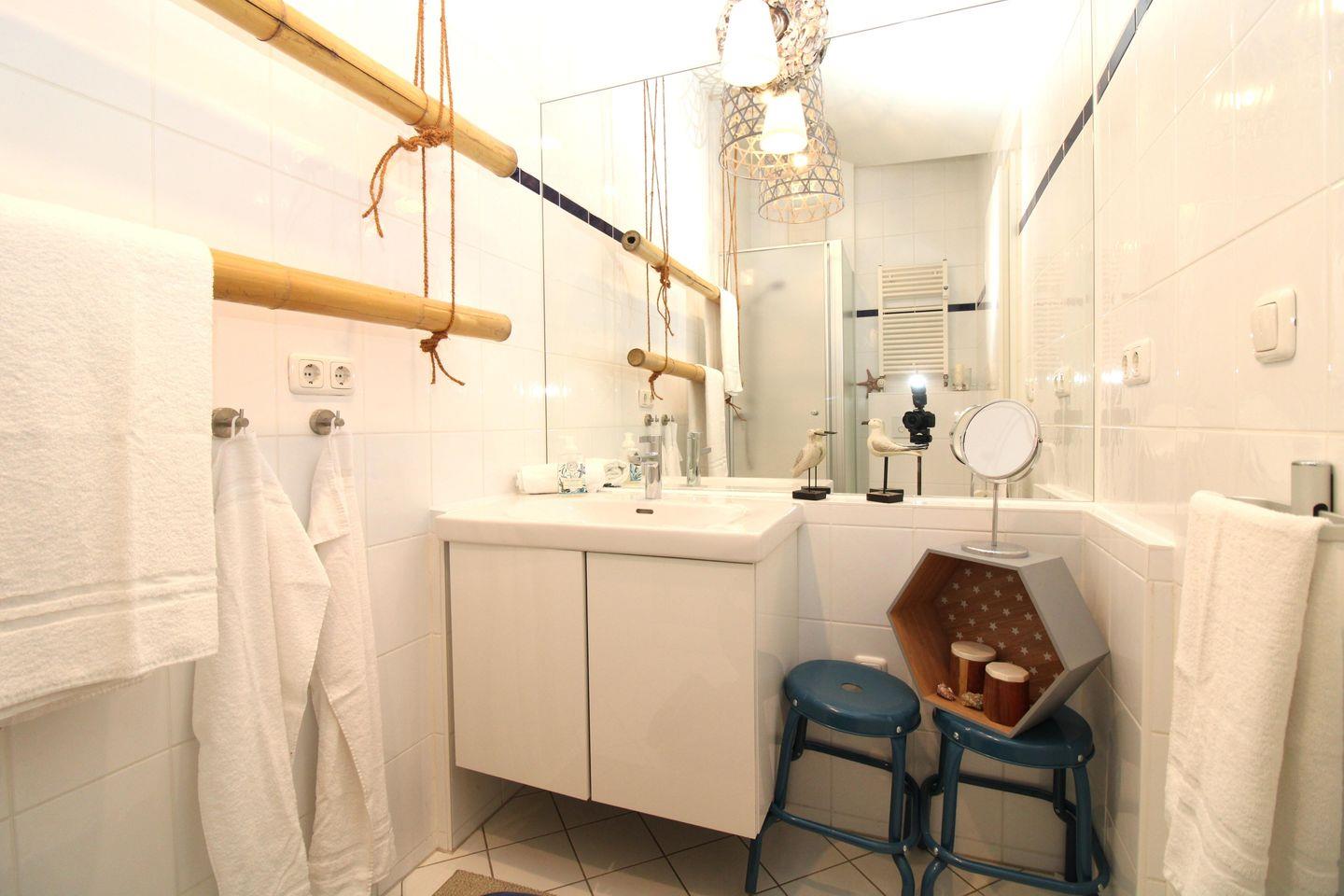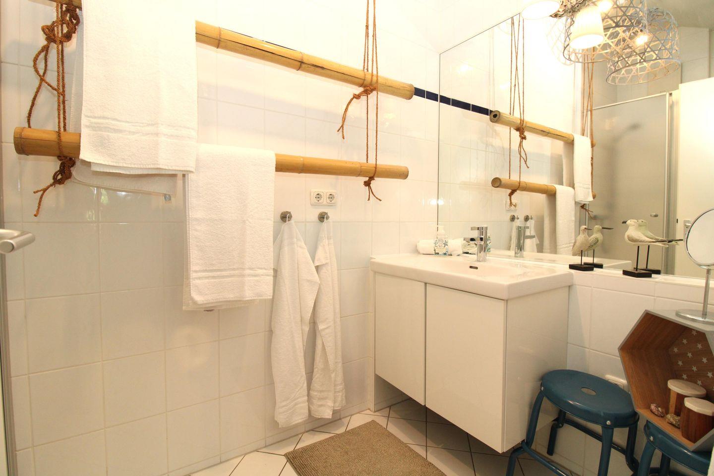 Das moderne Badezimmer verfügt über eine Dusche mit niedrigem Einstieg, Waschbecken mit geräumigem Unterschrank und großem Wandspiegel, WC, Föhn, Kosmetikspiegel, 2 Hocker, einen Handtuch-Heizkörper sowie ausreichend Ablagemöglichkeiten.