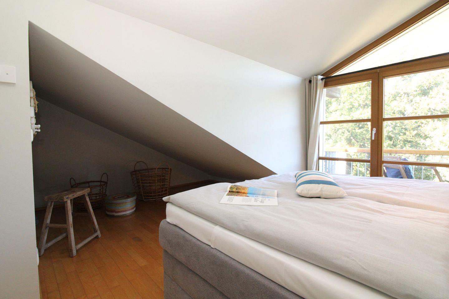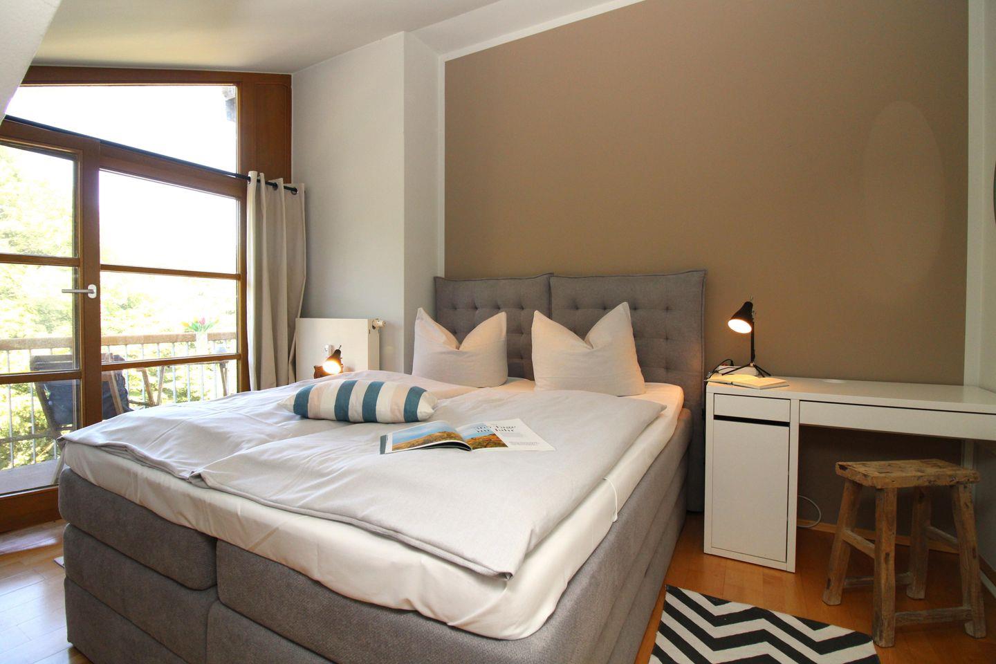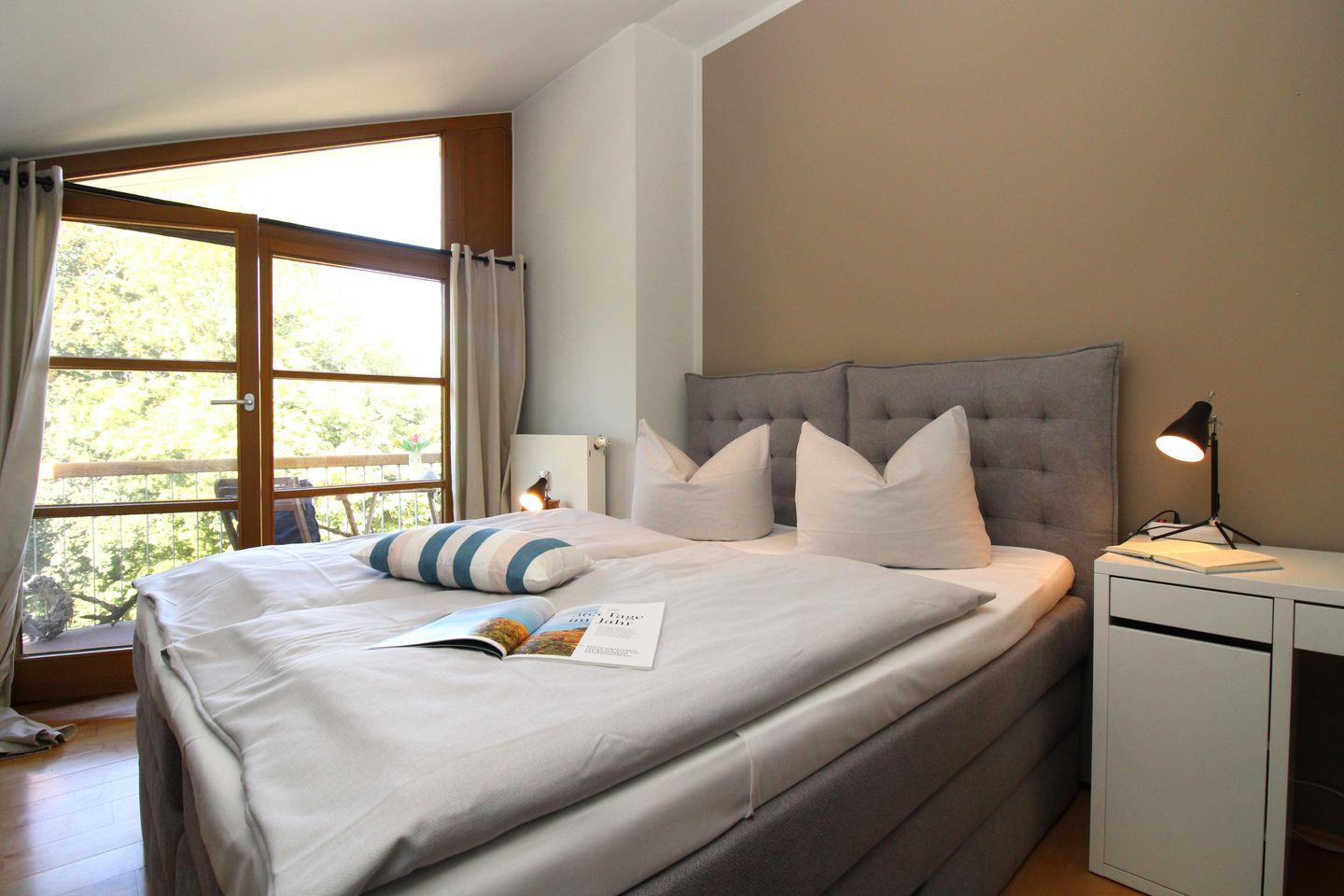 Das gemütliche Schlafzimmer ist mit einem bequemen Boxspring-Doppelbett (160 cm x 200 cm), Nachttischen mit Nachttischlampen, einem Schreibtisch mit Hocker sowie einem geräumigen Kleiderregal eingerichtet und hat ebenfalls direkten Zugang zu dem großen und überdachten Süd-West-Balkon. Für einen guten Schlafkomfort verfügt das Schlafzimmer über Verdunkelungsvorhänge.