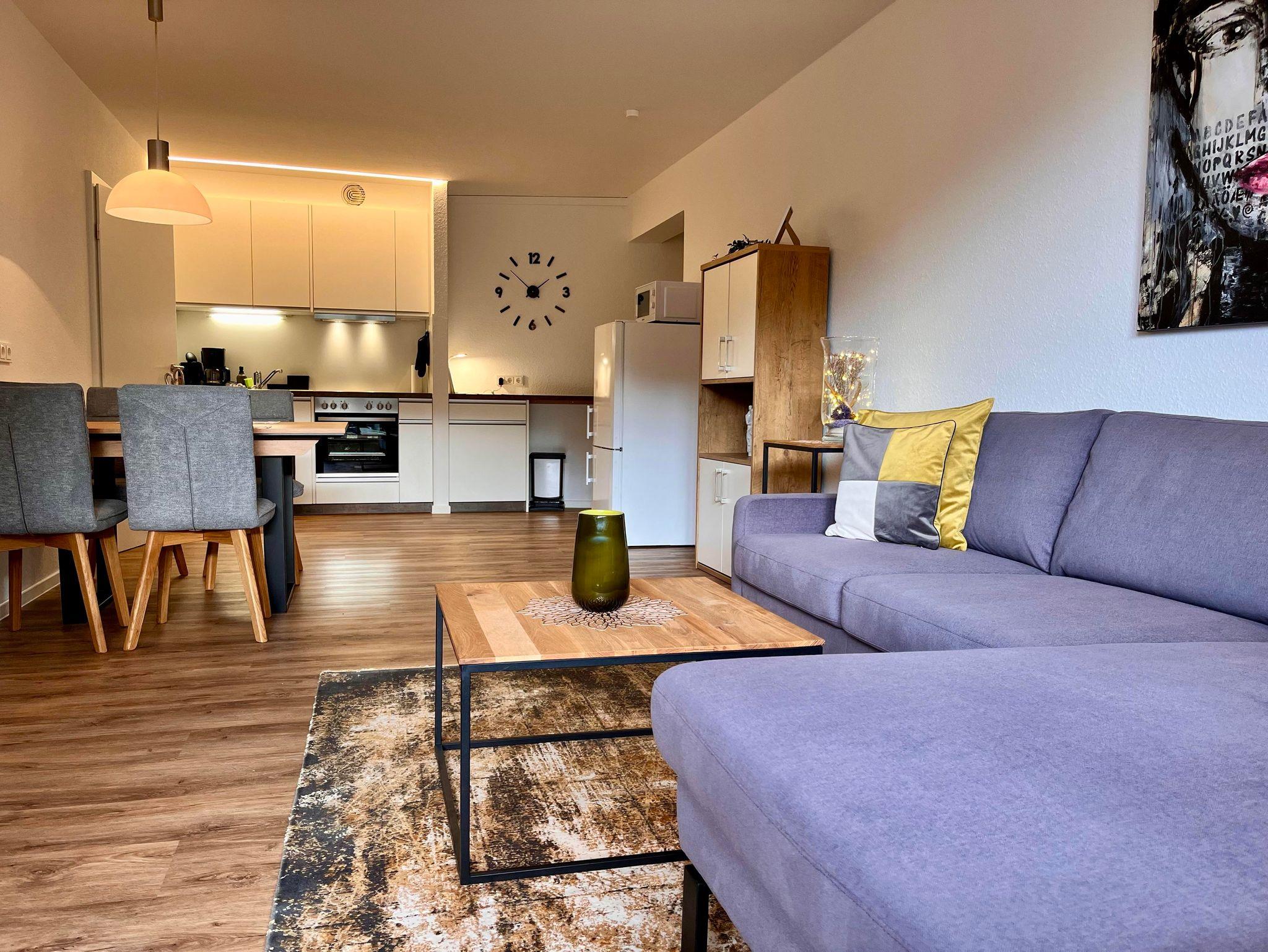 Dabei haben wir auf natürliche Materialien und ein harmonisches Farbkonzept geachtet. Der Wohnraum mit offener Küche sorgt für ein gutes Raumgefühl. Damit Sie sich sofort wohl fühlen und Ihren Aufenthalt von Beginn an genießen, stehen Ihnen bei Ihrer Ankunft ausreichend Parkplätze direkt am Haus zur Verfügung und im Ferienapartment warten Mineralwasser, Tee und Kaffee auf Sie.