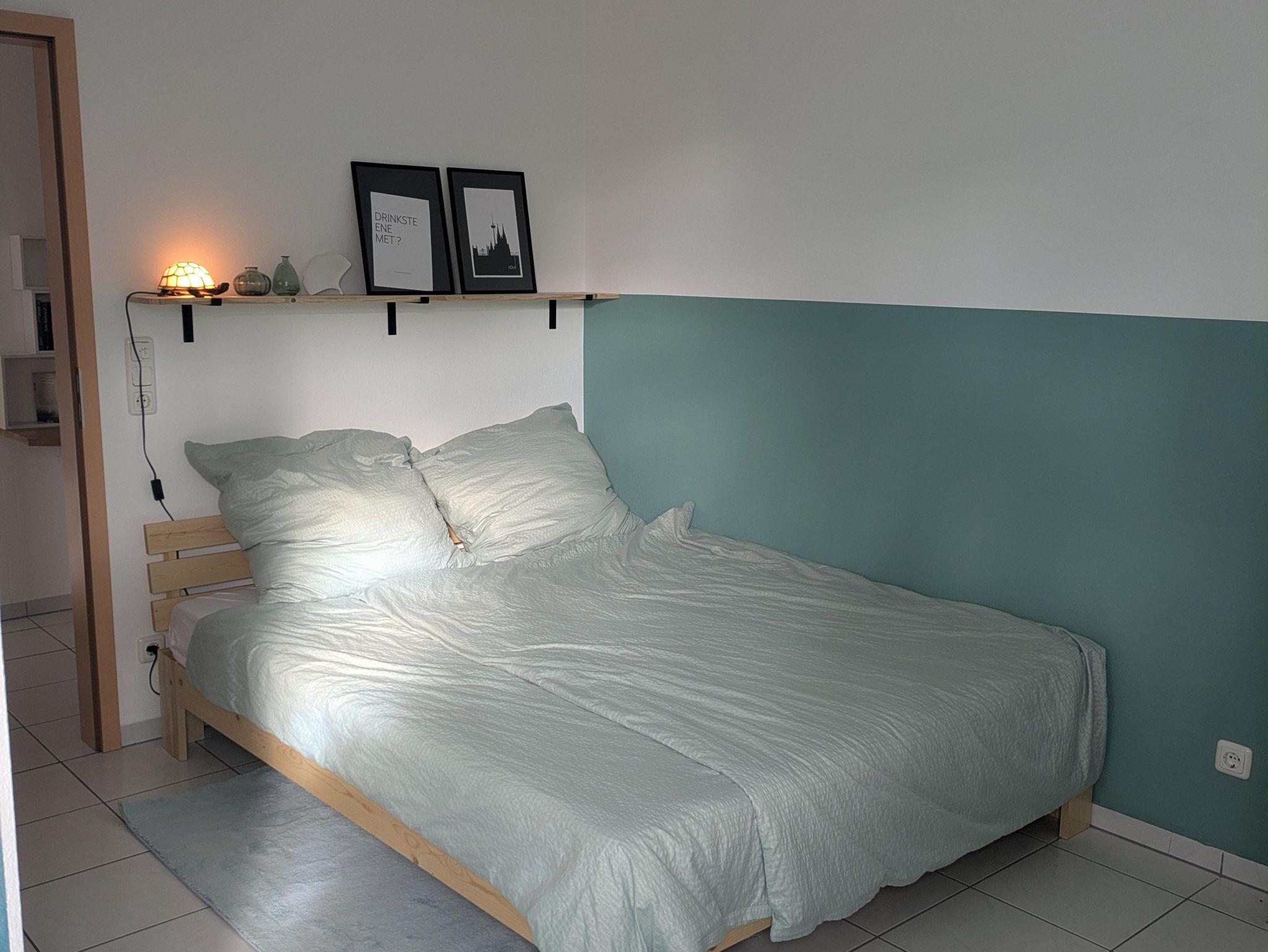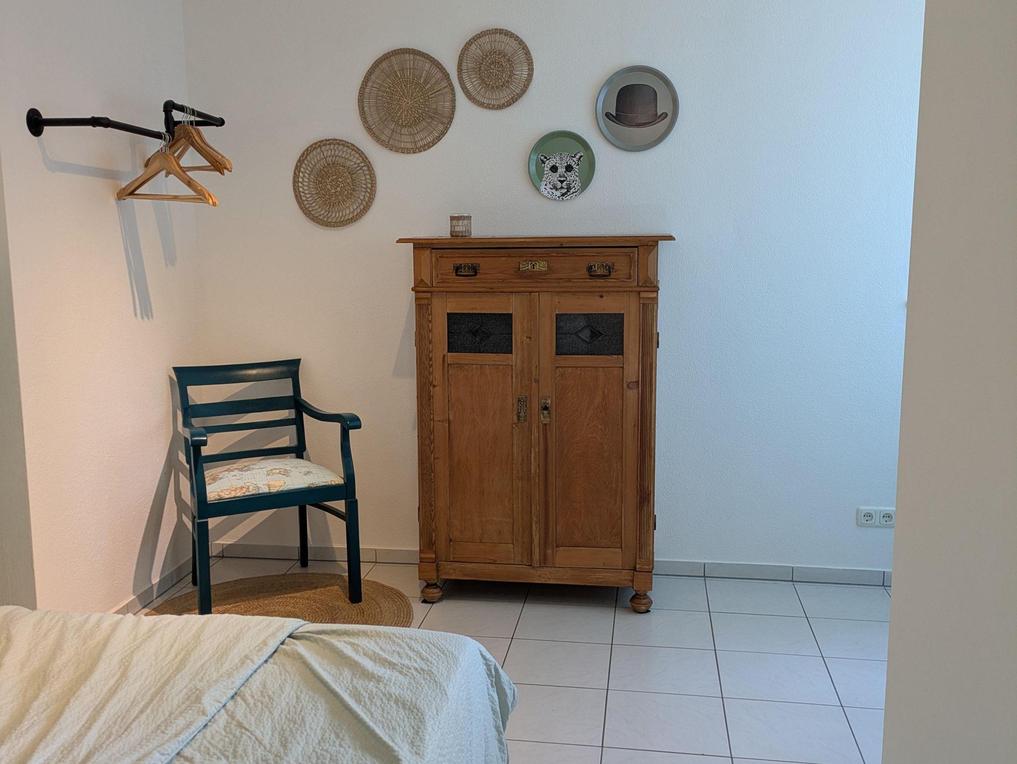 Sie verfügt über ein Schlafzimmer mit einem komfortablen Doppelbett (160 x 200 cm) und einer geschmackvollen Mischung aus modernem Ambiente und einem alten Vertiko, das dem Raum besonderen Charme verleiht.