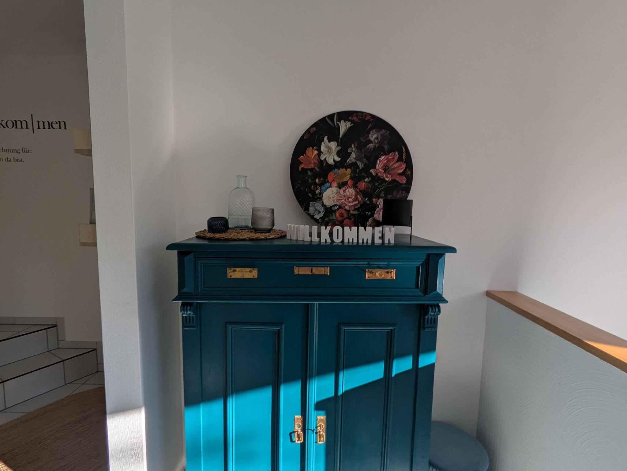 Wohnzimmer und Küche bilden einen offenen, sehr hellen Wohnbereich, der durch ein weiteres altes Vertiko charmant ergänzt wird. Die Küche ist gut ausgestattet und der gesamte Bereich gemütlich eingerichtet, sodass man sich sofort wohlfühlt. Ein zusätzlicher Abstellraum bietet praktischen Stauraum für ihre Koffer. Staubsauger, Besen und andere Utensiliensind hier gut verstaut und sorgt gleichzeitig für Ordnung.