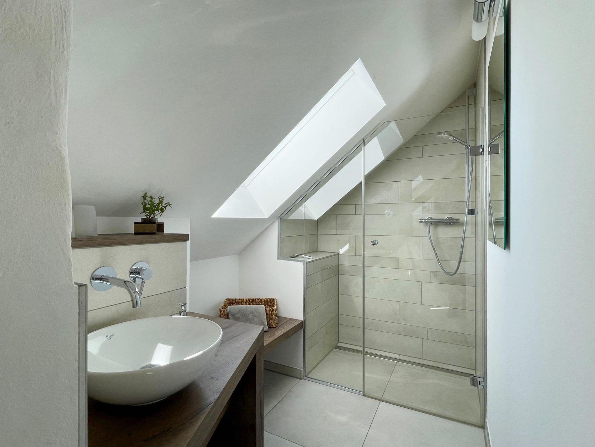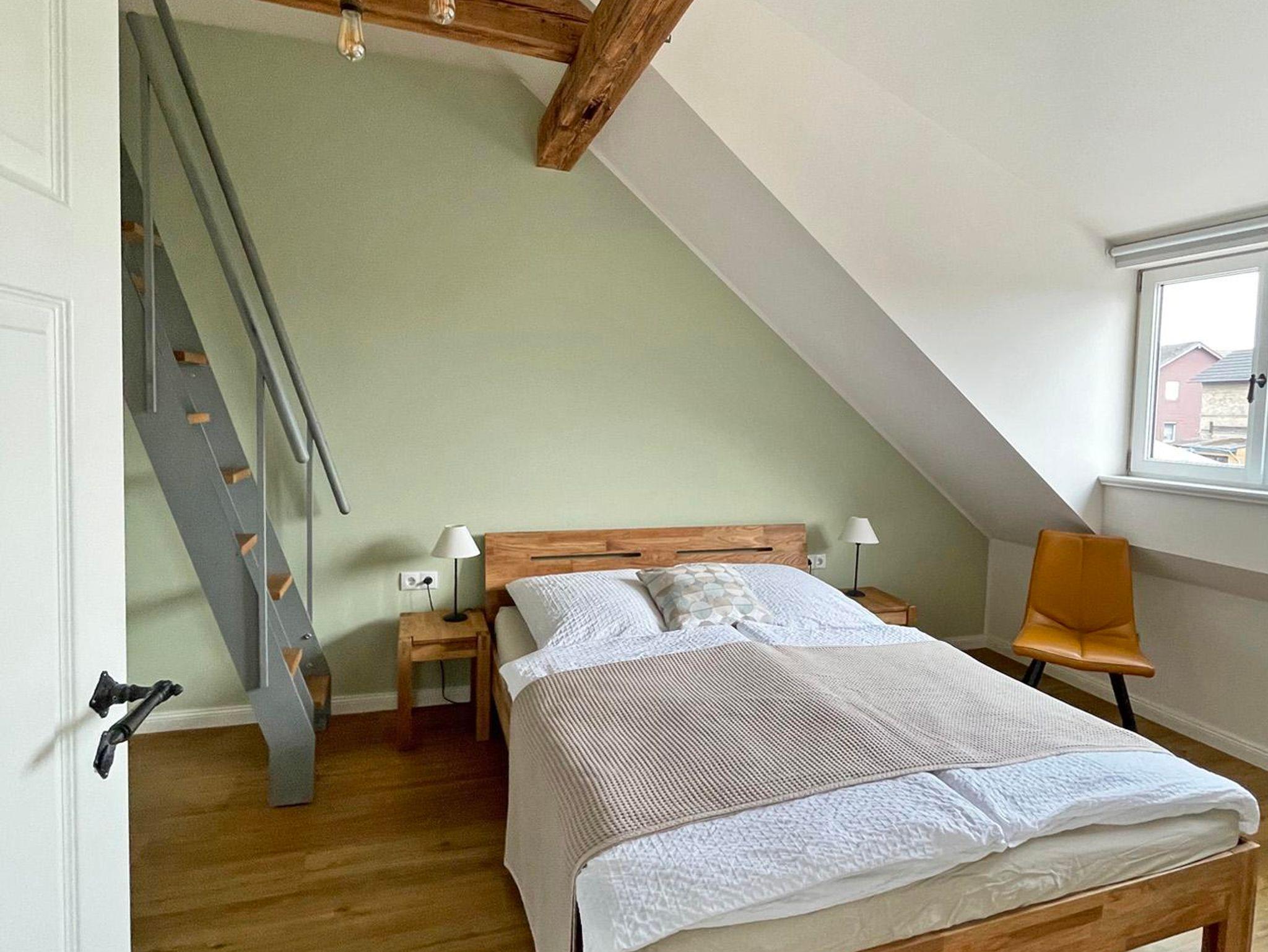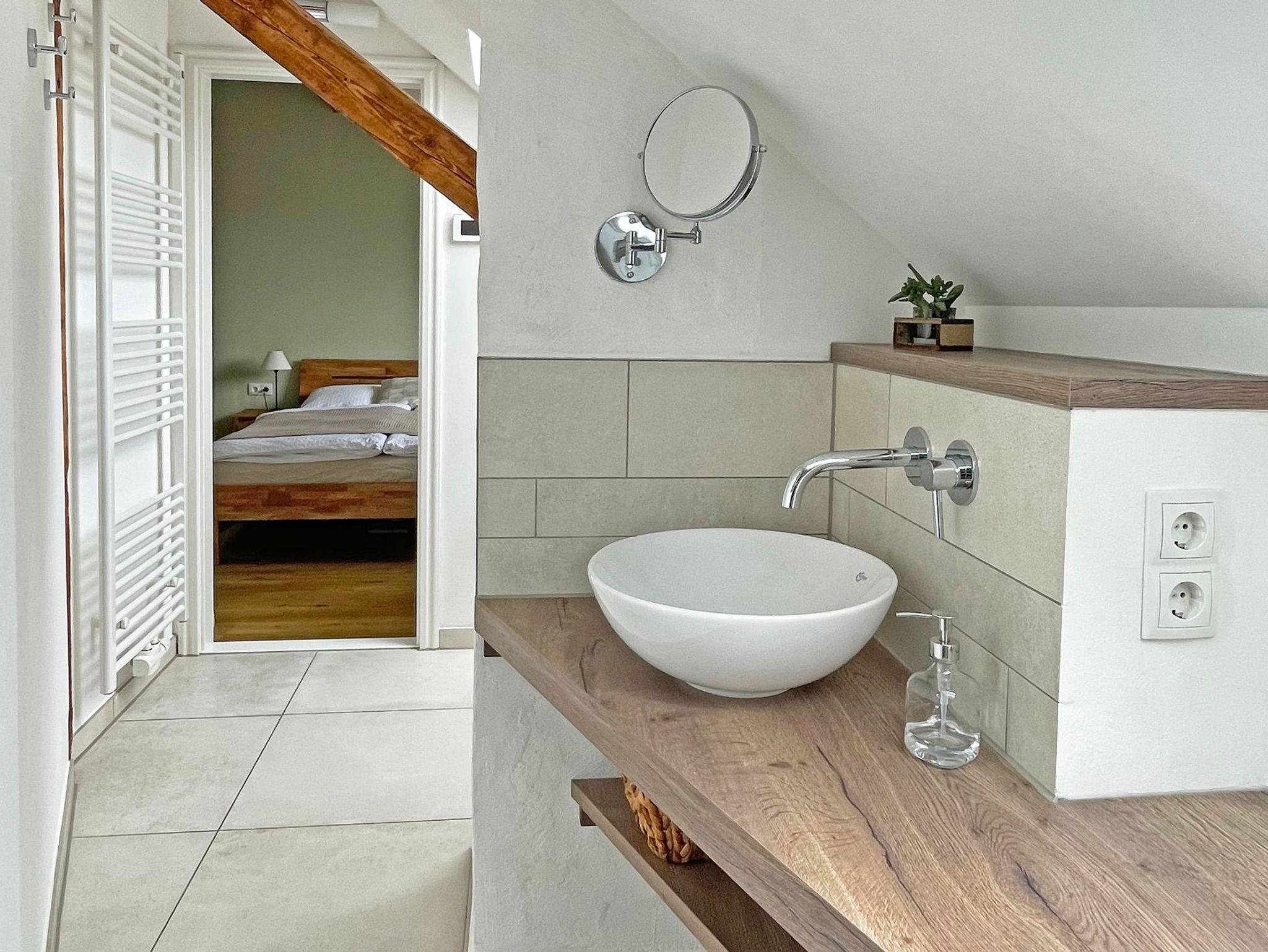 Im Obergeschoss befinden sich drei Schlafräume und zwei moderne Bäder. Das Gartenzimmer mit einem Doppelbett hat ein eigenes Bad und zudem einen Chillbereich im Spitzboden als Rückzugsort mit einem weiteren Fernseher. Das Bismarckzimmer verfügt über ein Boxspringbett, im Eisenbahnzimmer sind zwei Einzelbetten. Die beiden Bäder sind je mit einem Waschbecken, WC und einer Dusche ausgestattet und verfügen über Dachflächenfenster zur Be- und Entlüftung. Die Betten sind bezogen, für jeden Gast liegt ein Handtuchset bereit.