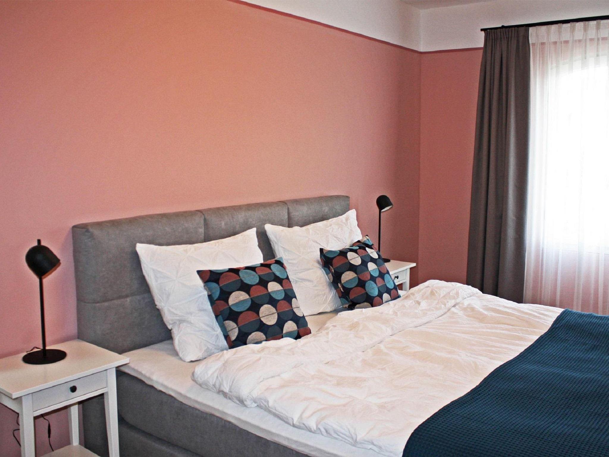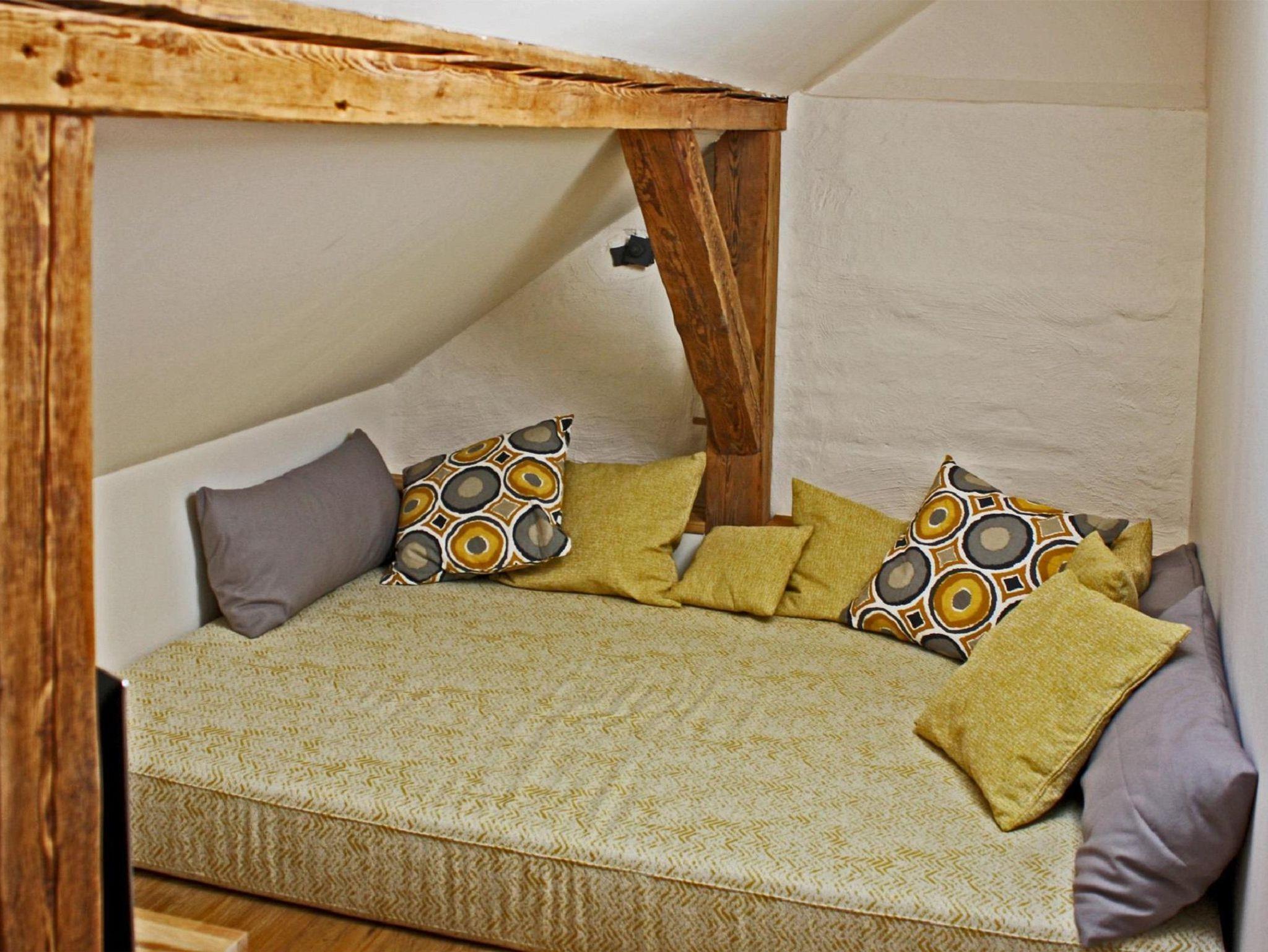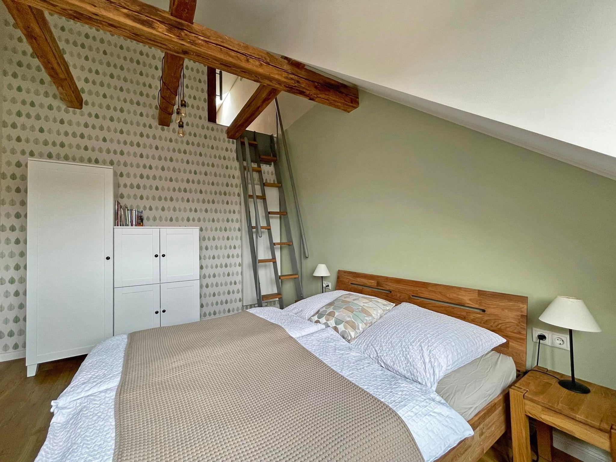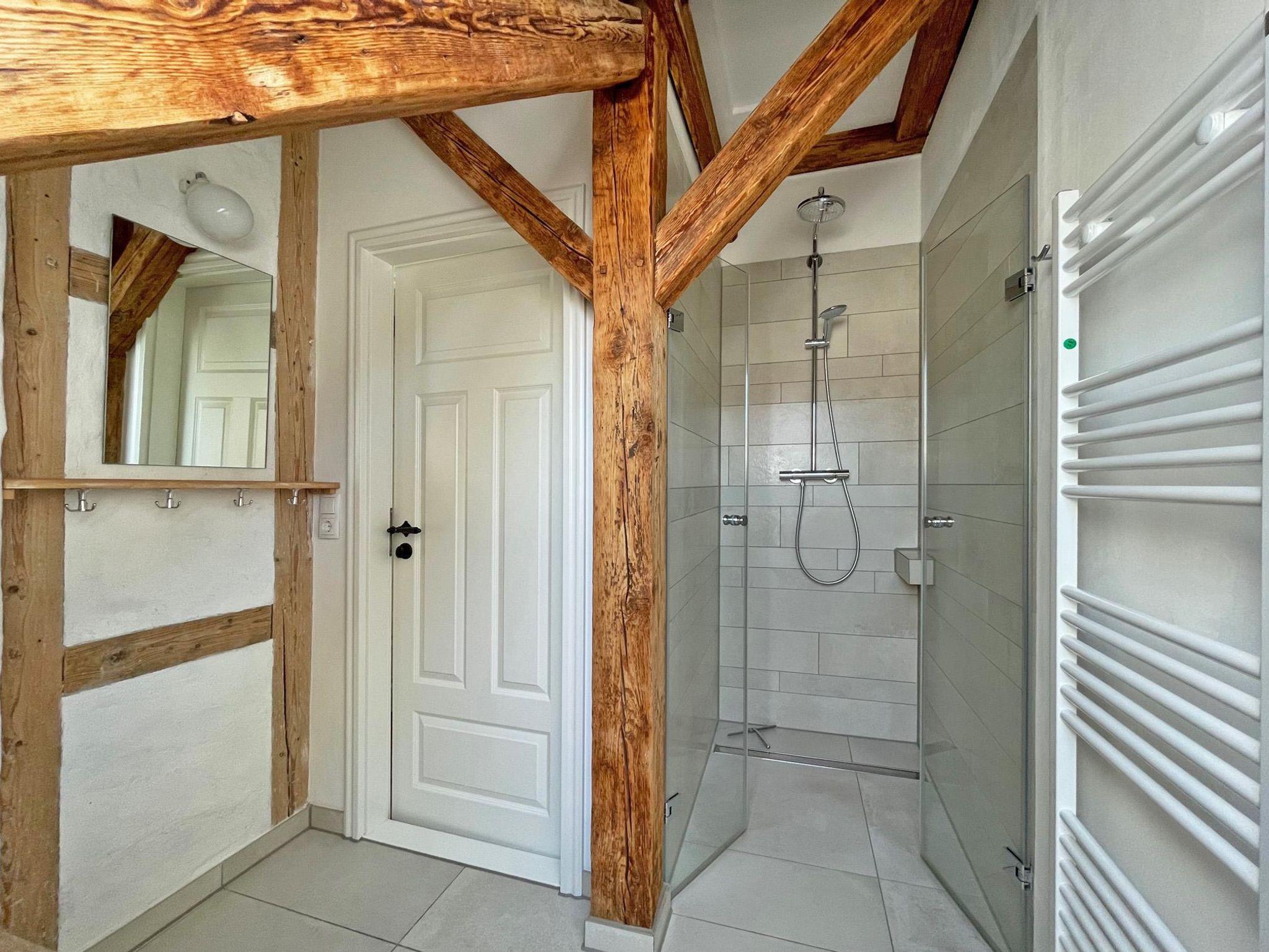 Im Obergeschoss befinden sich drei Schlafräume und zwei moderne Bäder. Das Gartenzimmer mit einem Doppelbett hat ein eigenes Bad und zudem einen Chillbereich im Spitzboden als Rückzugsort mit einem weiteren Fernseher. Das Bismarckzimmer verfügt über ein Boxspringbett, im Eisenbahnzimmer sind zwei Einzelbetten. Die beiden Bäder sind je mit einem Waschbecken, WC und einer Dusche ausgestattet und verfügen über Dachflächenfenster zur Be- und Entlüftung. Die Betten sind bezogen, für jeden Gast liegt ein Handtuchset bereit.