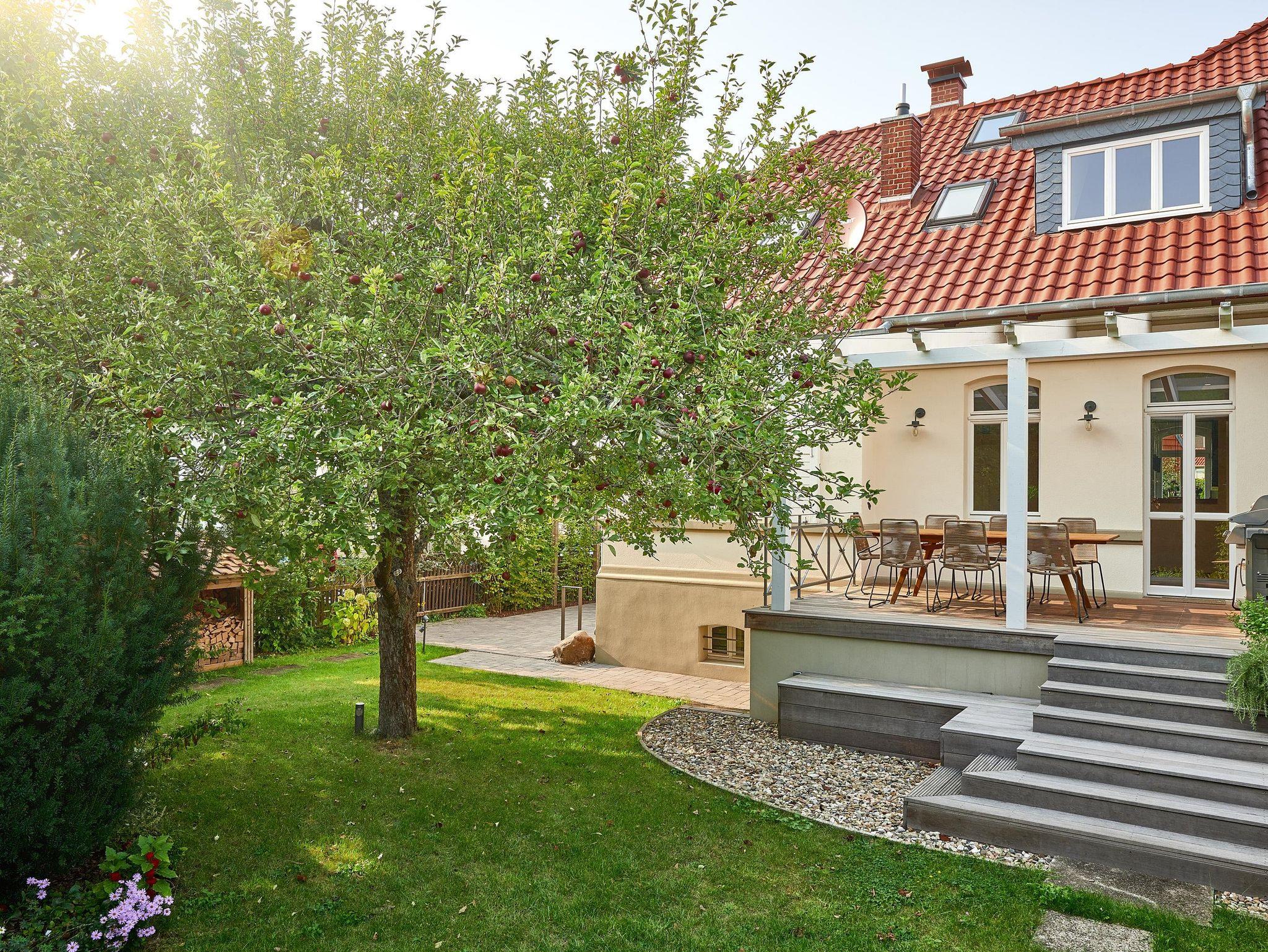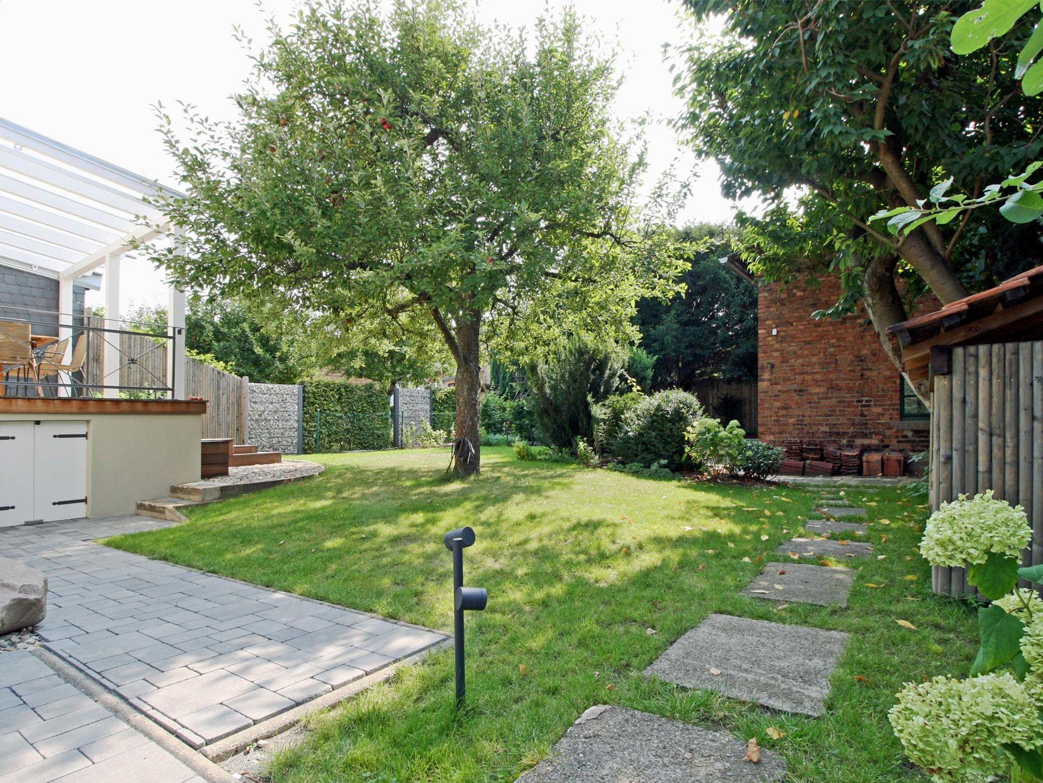 Von der großen Holzterrasse aus gelangt man über eine Freitreppe in den Garten sowie zur Sauna. An das Nebengebäude grenzt eine weitere Terrasse zum Aufenthalt im Garten. Im Schatten großer Eiben sind weitere Sitzgelegenheiten. Zwei Liegen laden zum Entspannen ein.