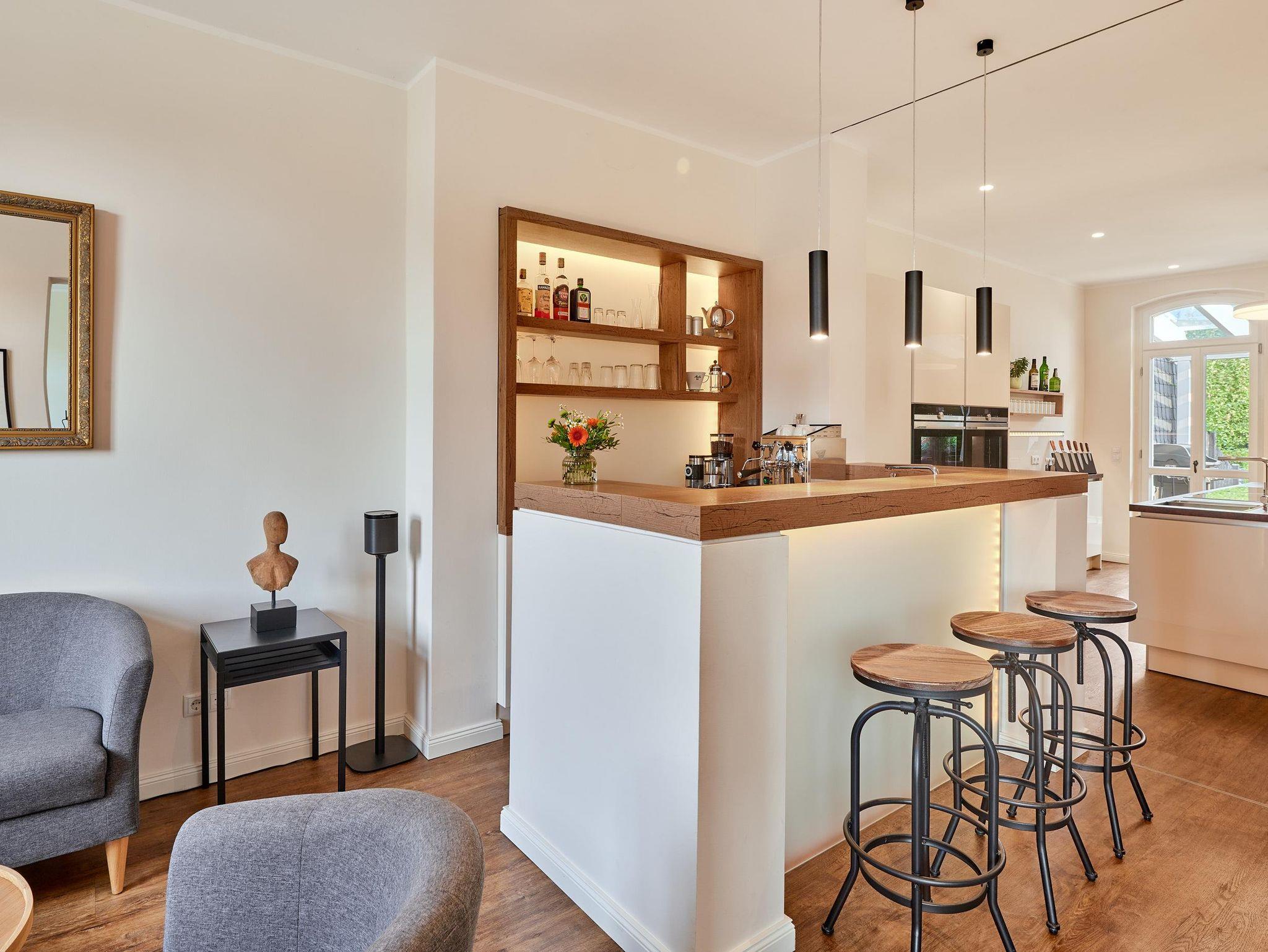 Die Café-Bar mit einer Siebträgermaschine und einem Lounge-Bereich steht in offener Verbindung zur Küche und zum Esszimmer, in dem bis zu 10 Personen an einem großen Tisch Platz finden. Hier steht auch ein gusseiserner Kaminofen für wohlige Wärme in der kalten Jahreszeit. Gegenüber dem Esszimmer befindet sich das Wohnzimmer mit einer großen Couch, einem Fernseher und Ausblick auf den Apfelbaum im Garten. An den Flur grenzt im Eingangsbereich ein kleines WC. Das Erdgeschoss ist komplett mit Sonos-Boxen ausgestattet. Für die Steuerung der Musik und einiger Hue-Leuchten steht ein iPad zur Verfügung – WLAN ist im gesamten Haus vorhanden und kann kostenfrei genutzt werden.