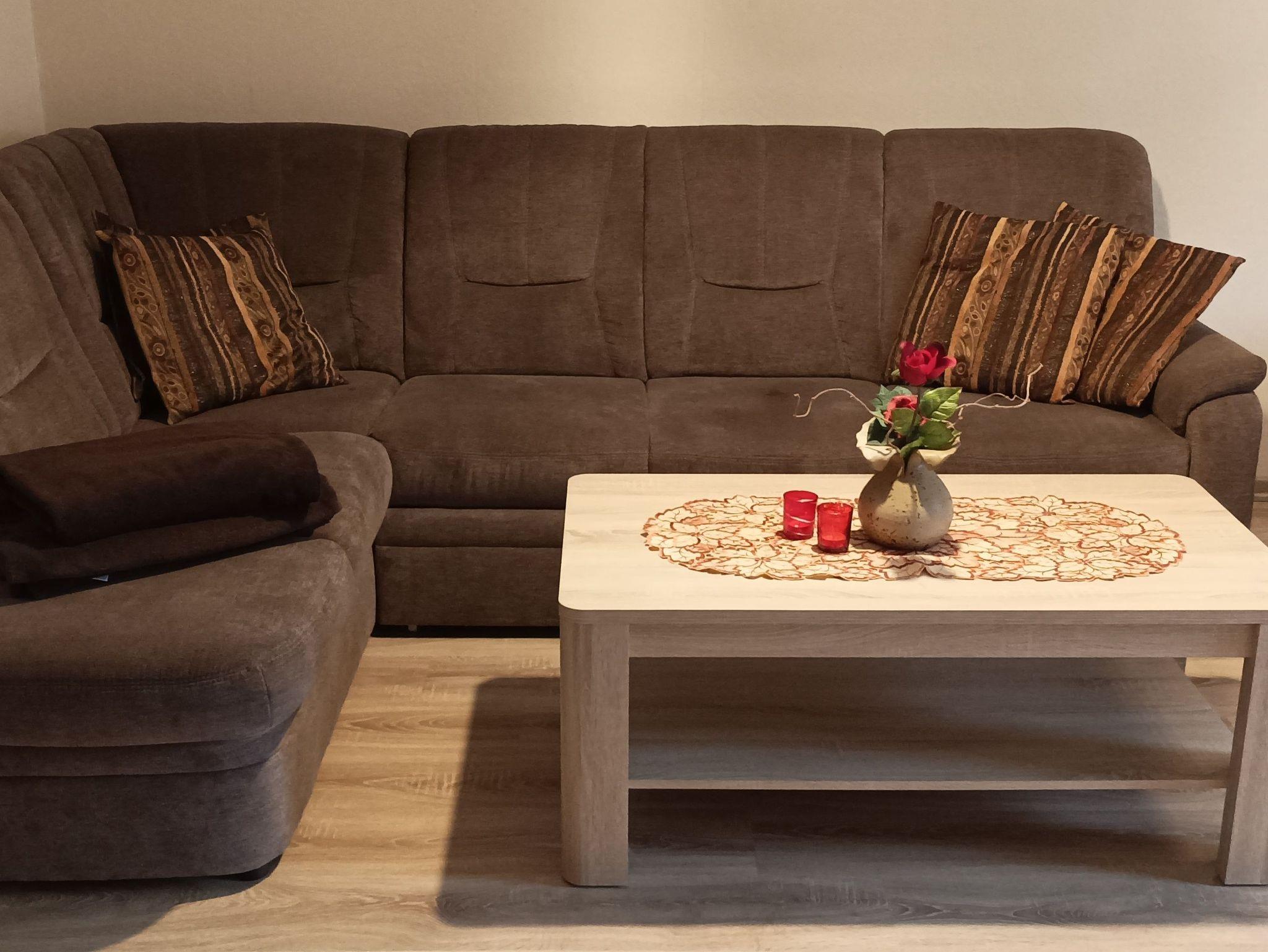 Wohnzimmer: Rollläden an den Fenstern, SAT-TV digital, Flachbild-Fernseher, Essbereich für 6 Personen, Ecksofa