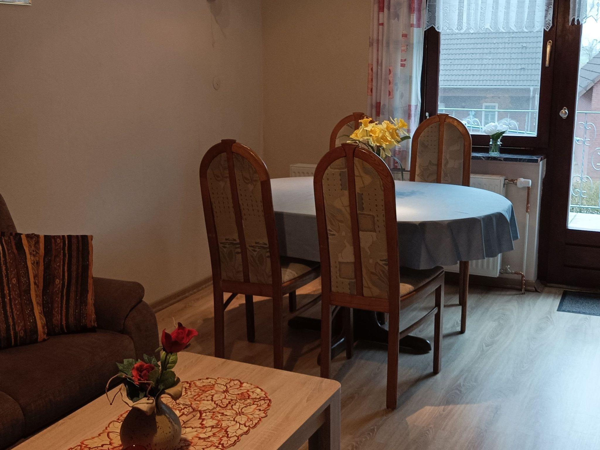 Allergiefreundlich; die Wohnung wurde Anfang 2005 neu renoviert; keine Teppichböden; keine Federbetten; 2 Schlafzimmer je 3 Betten und Zustellbett. 1 Wohnraum mit Essecke, Sitzecke, TV und Radio; Balkon mit Gartenmöbeln; Die Küche ist vollständig eingerichtet mit Spülmaschine, Backofen, Mikrowelle usw.; Dusche/WC; Bettwäsche und Handtücher gegen Entgelt erhältlich; pro Bett einmalig 6,-; Waschmaschine für alle Gäste pro Waschgang 2,50; Stromkosten nach Verbrauch.