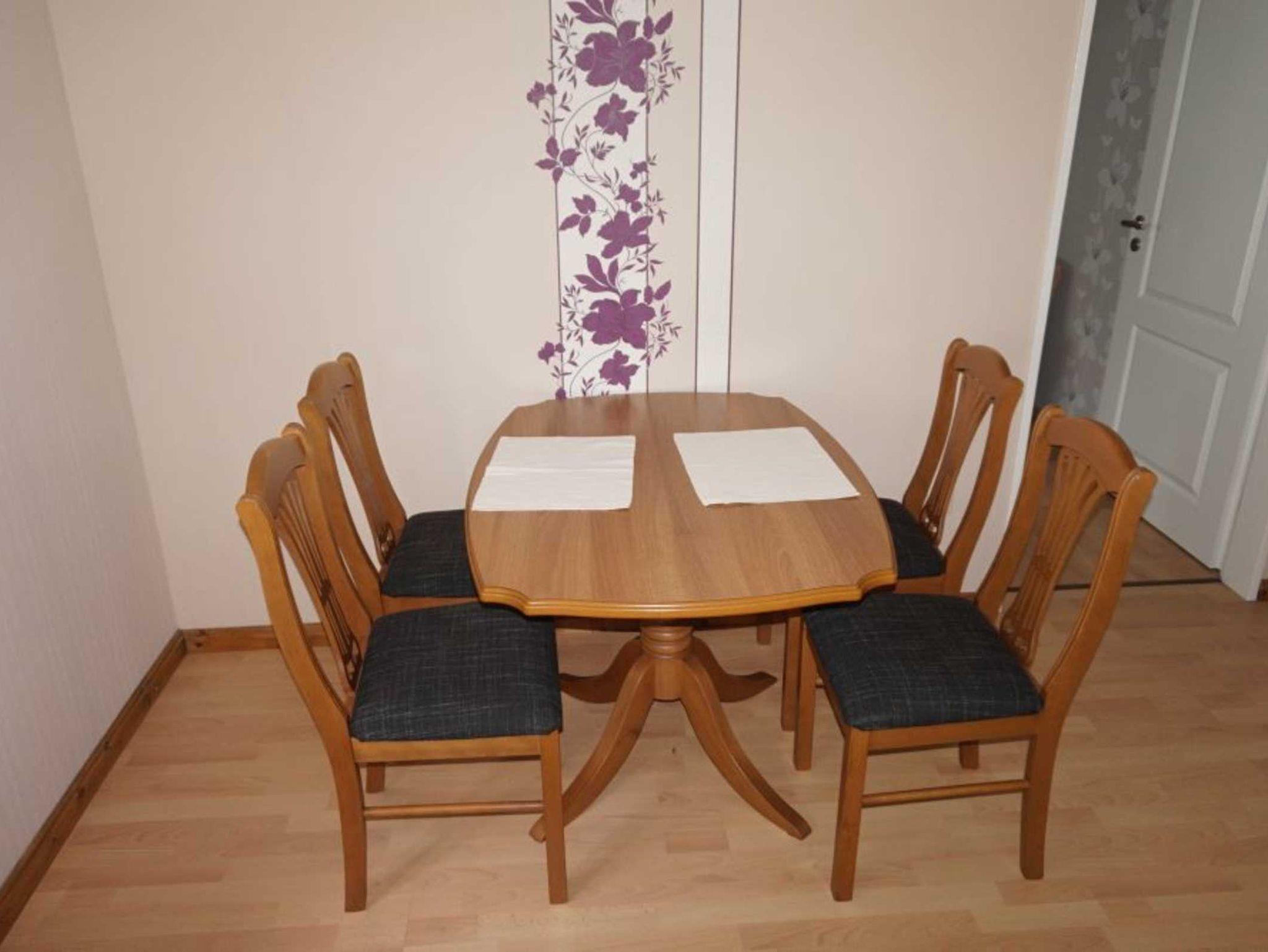 Küche: 2-Patten-Herd, Backofen, Mikrowelle, Kühlschrank, Wasserkocher, Kaffeemaschine; Essbereich für 2 Personen