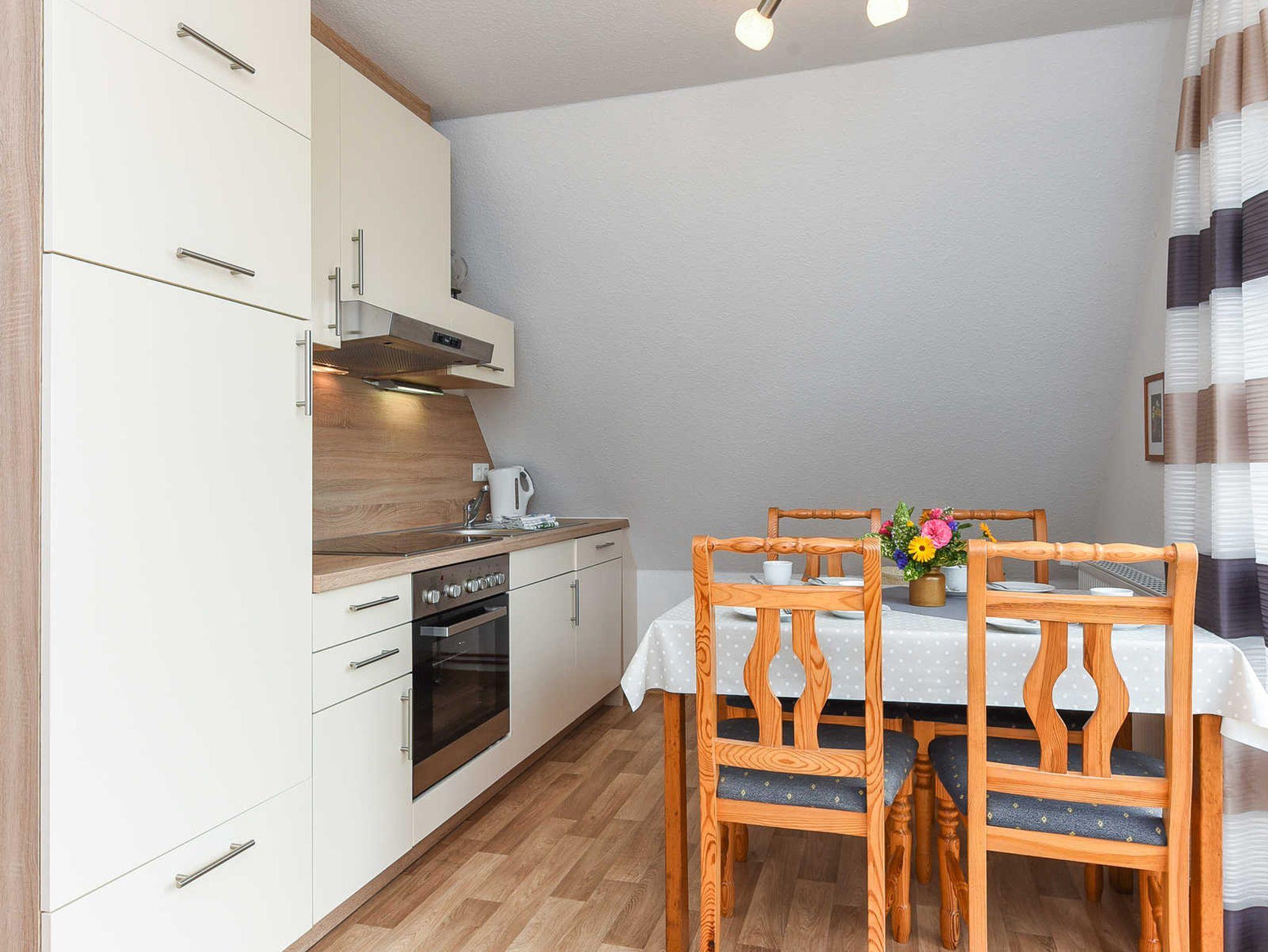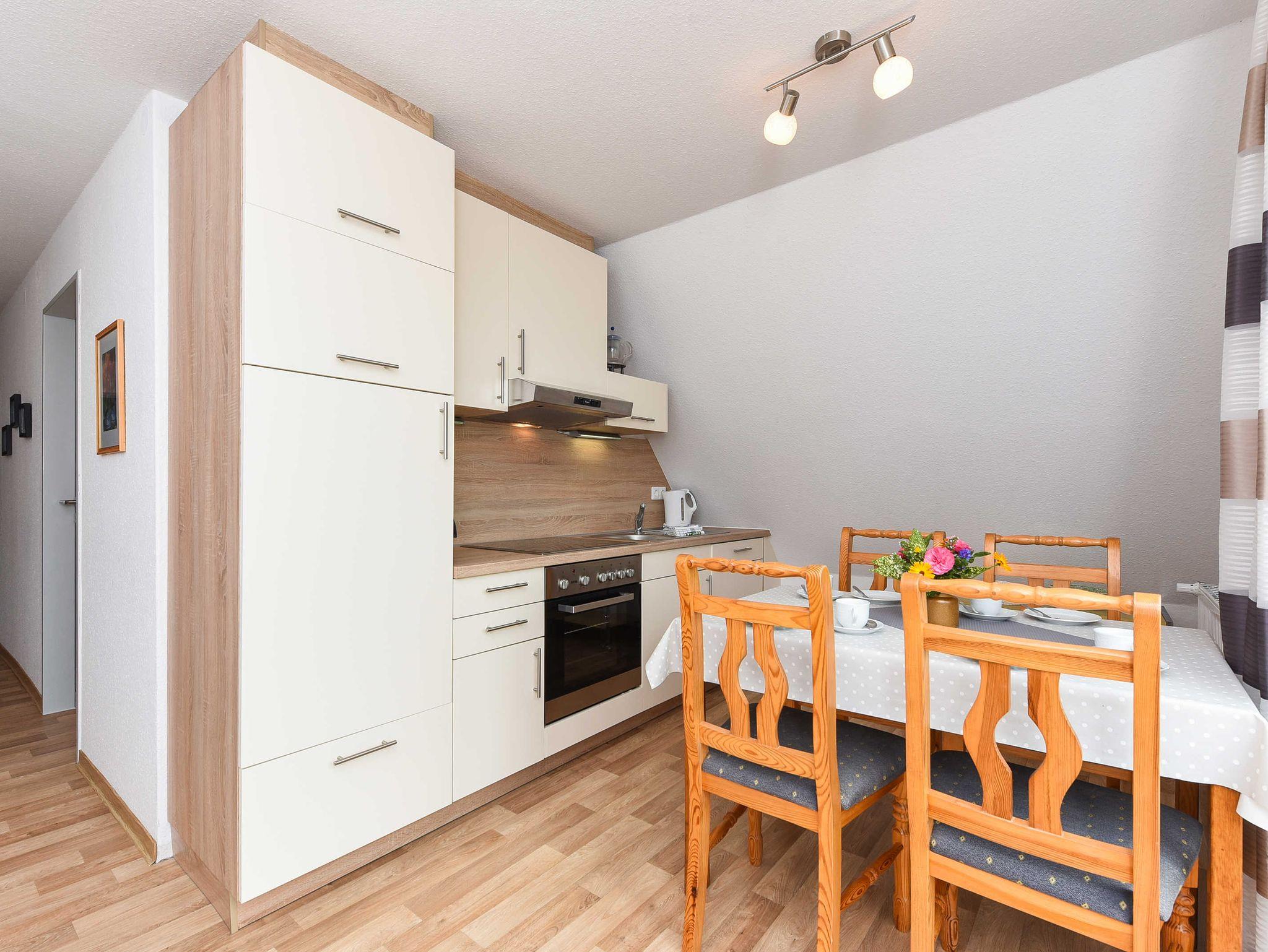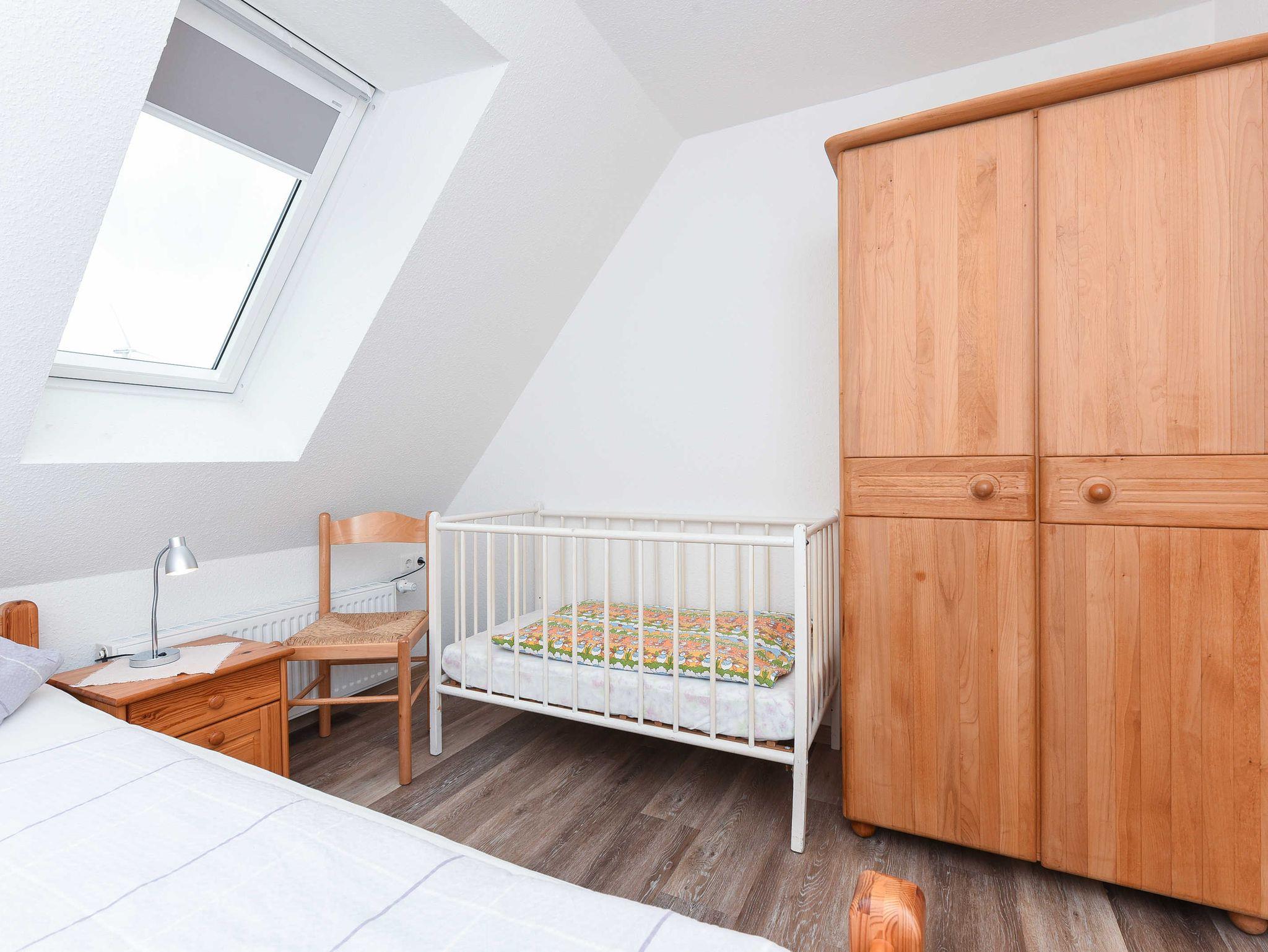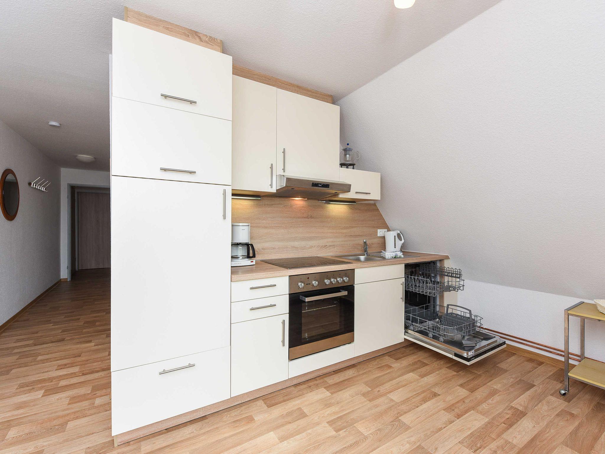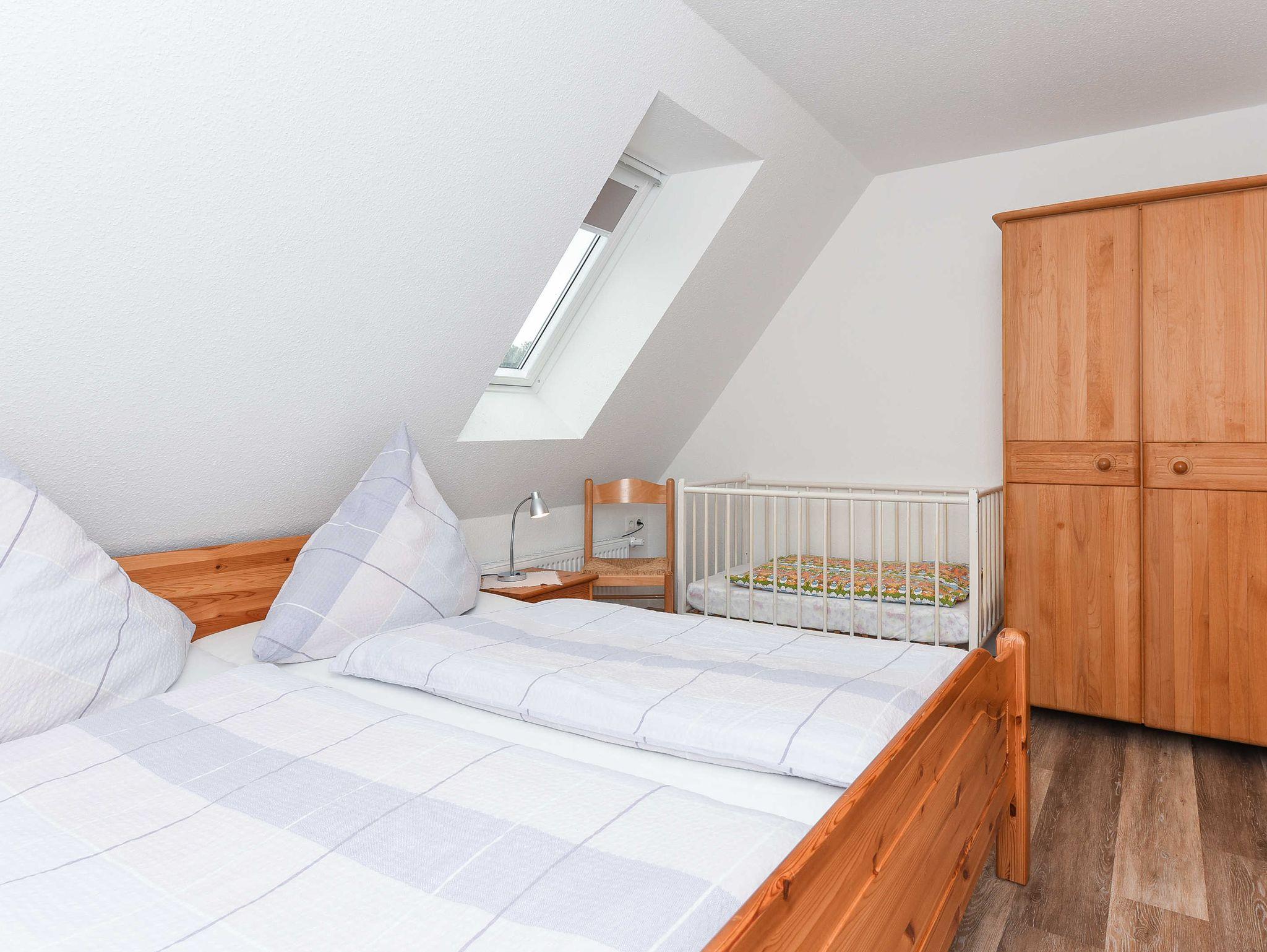 Größe ca. 50 Quadratmeter, Wohnraum mit integrierter Küche und Essgruppe, Schlafzimmer, zweites separates Schlafzimmer/Kinderzimmer, Badezimmer mit Badewanne und WC, Obergeschoss, optimal für 2 bis 5 Personen und zusätzlich ein Kleinkind.