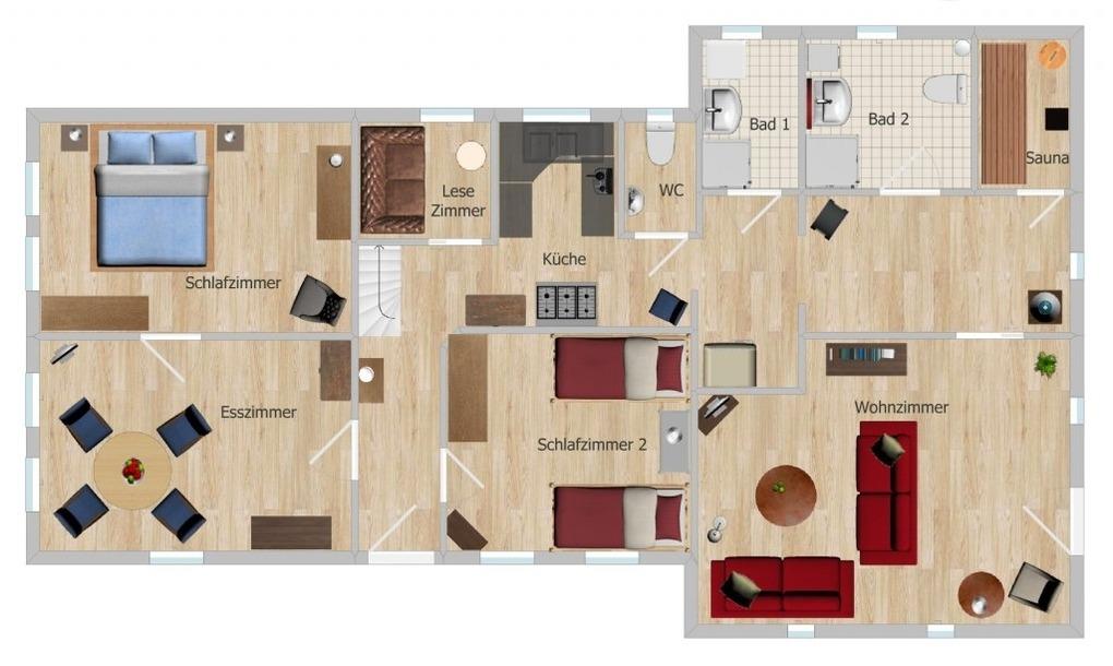 Der gesamte Wohnbereich befindet sich im Erdgeschoss. Im vorderen Bereich finden Sie zwei Schlafzimmer vor, die jeweils mit Doppelbetten oder auch Einzelbetten ausgestattet sind. So das bis zu 4 Erwachsene oder Kinder hier Platz haben.