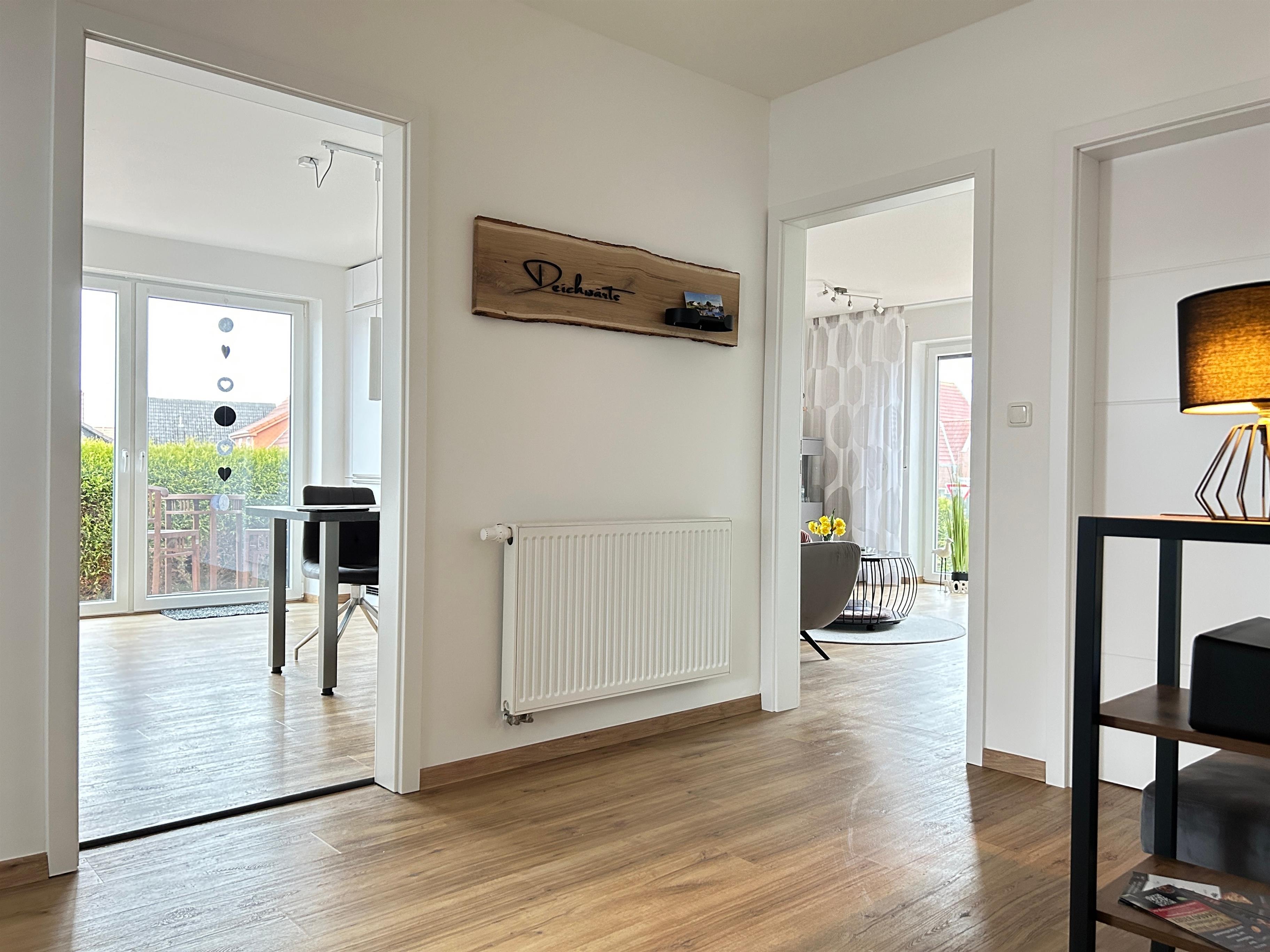 Die modern und hochwertig eingerichtete 4 Sterne Ferienwohnung befindet sich im Erdgeschoss, verfügt über 3 Zimmer und bietet mit über 80 qm Wohnfläche Platz für maximal 4 Personen. Eine komplett ausgestattete Küche mit Essbereich lädt zum Kochen und Verweilen ein. Vom Wohnzimmer haben Sie einen Blick durch das große Fenster in den Garten, den nur Sie benutzen. Auf der großen Terrasse können Sie die Tage unter dem Sonnenschirm genießen, oder auf dem Holzdeck in den Lounge-Sesseln die Seele baumeln lassen. Für ein leckeres und ausgiebiges Barbeque steht ein Grill für Sie bereit.