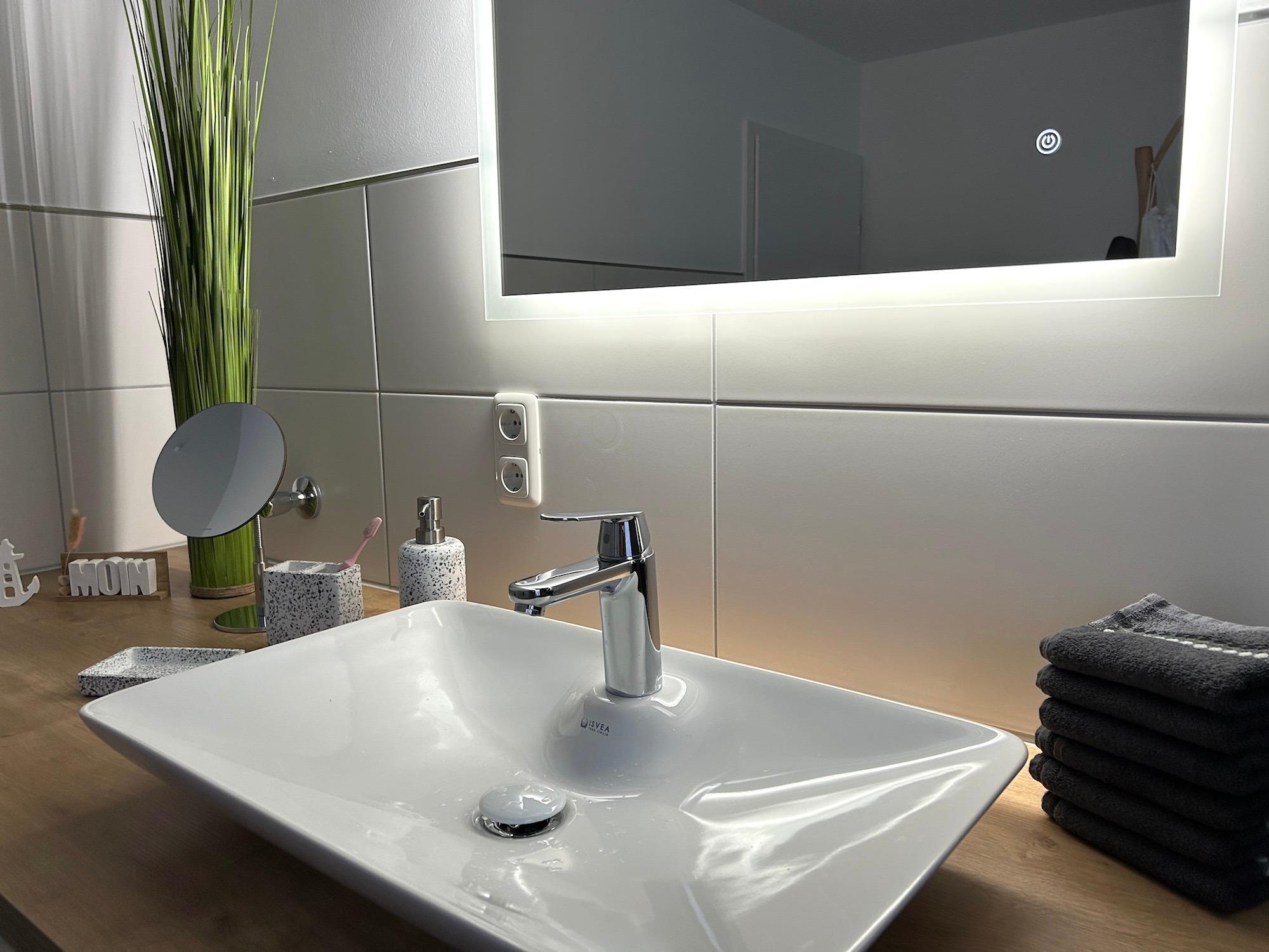 Im großzügigen Bad finden Sie eine ebenerdige Dusche mit Regenschauer-Funktion. Annehmlichkeiten wie ein beleuchteter Spiegel, Föhn, Schminkspiegel, genügend Stauraum und Ablagen sind für uns selbstverständlich. Ein Wasch-Trockner ist ebenfalls im Bad untergebracht und kann von Ihnen kostenfrei benutzt werden.