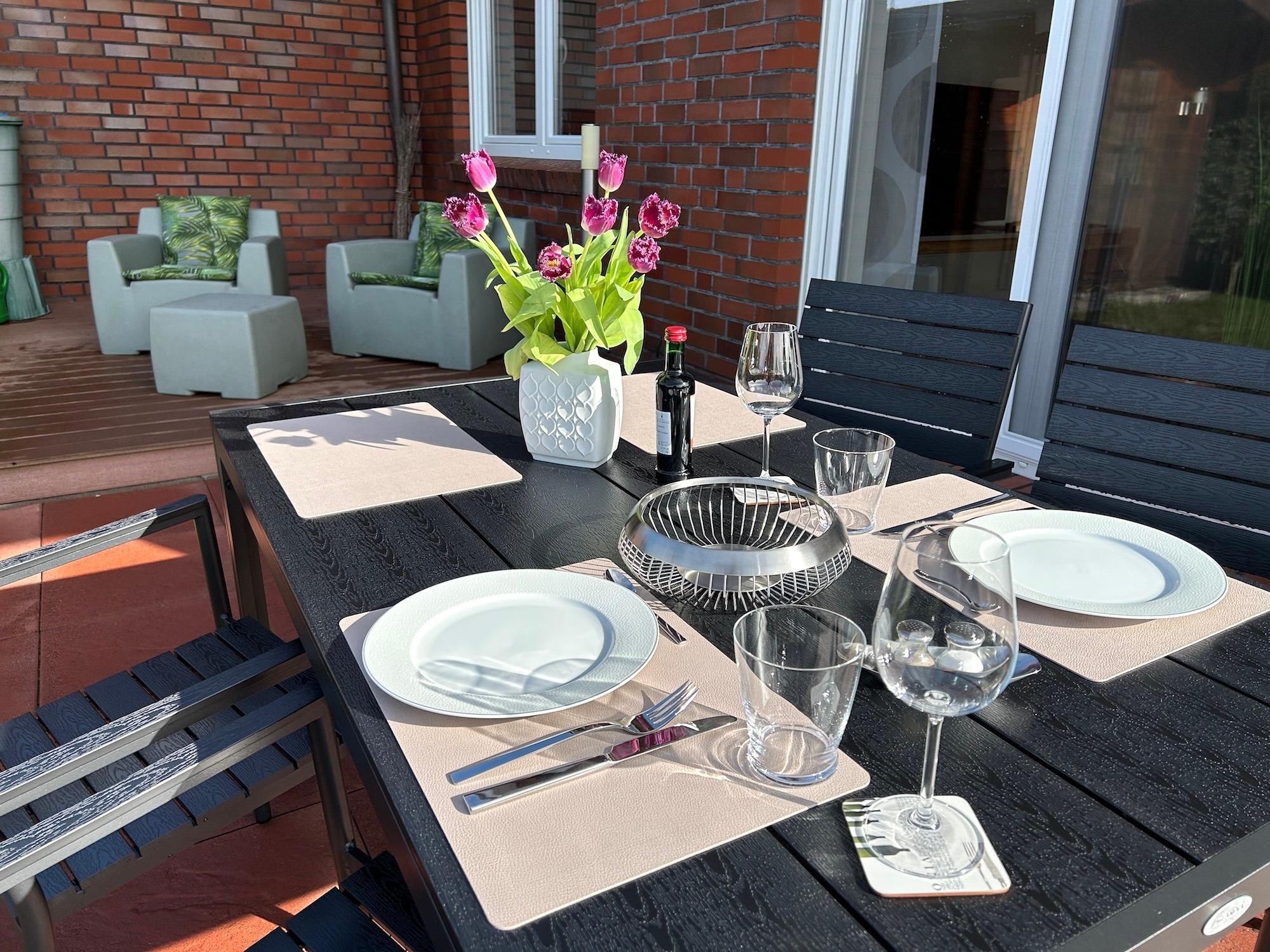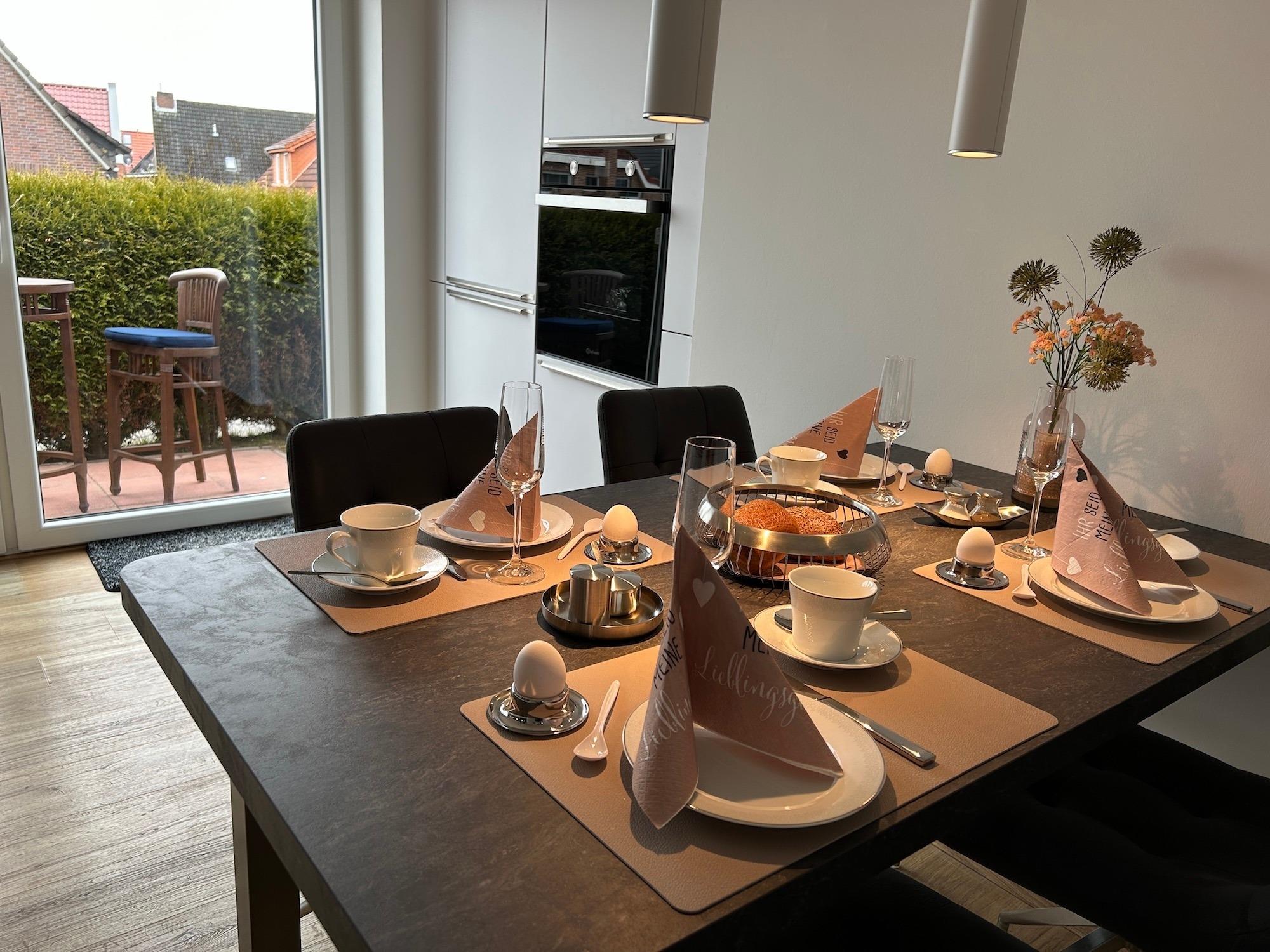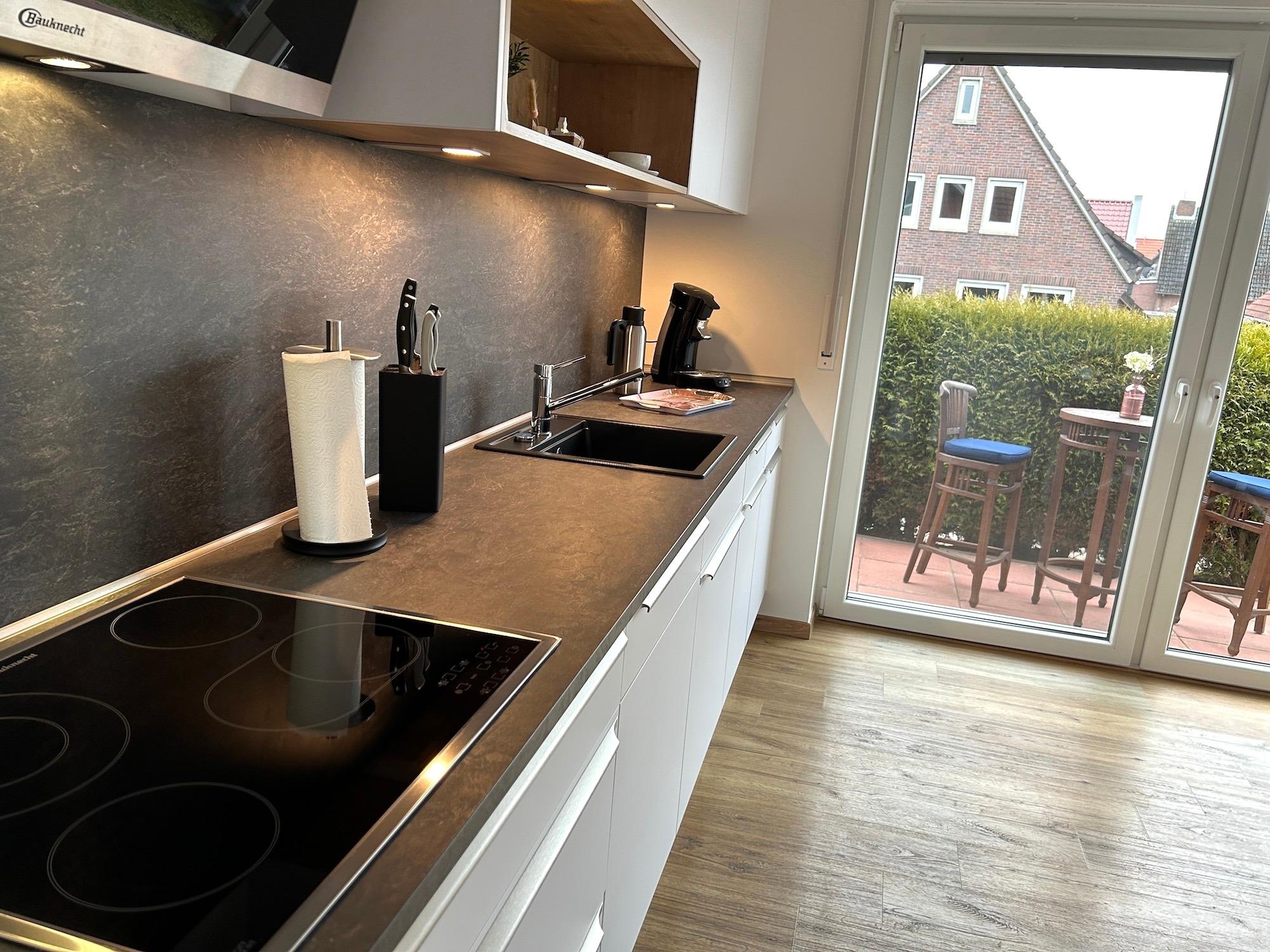 In der komplett ausgestatteten Küche mit Ceran-Kochfeld, Backofen, Microwelle, Geschirrspüler befindet sich auch der Essbereich mit 4 Stühlen und einem Esstisch. Aus der Küche gelangen Sie direkt auf eine kleinere Terrasse. Dort können Sie prima den ersten Kaffee oder Tee des Tages genießen.