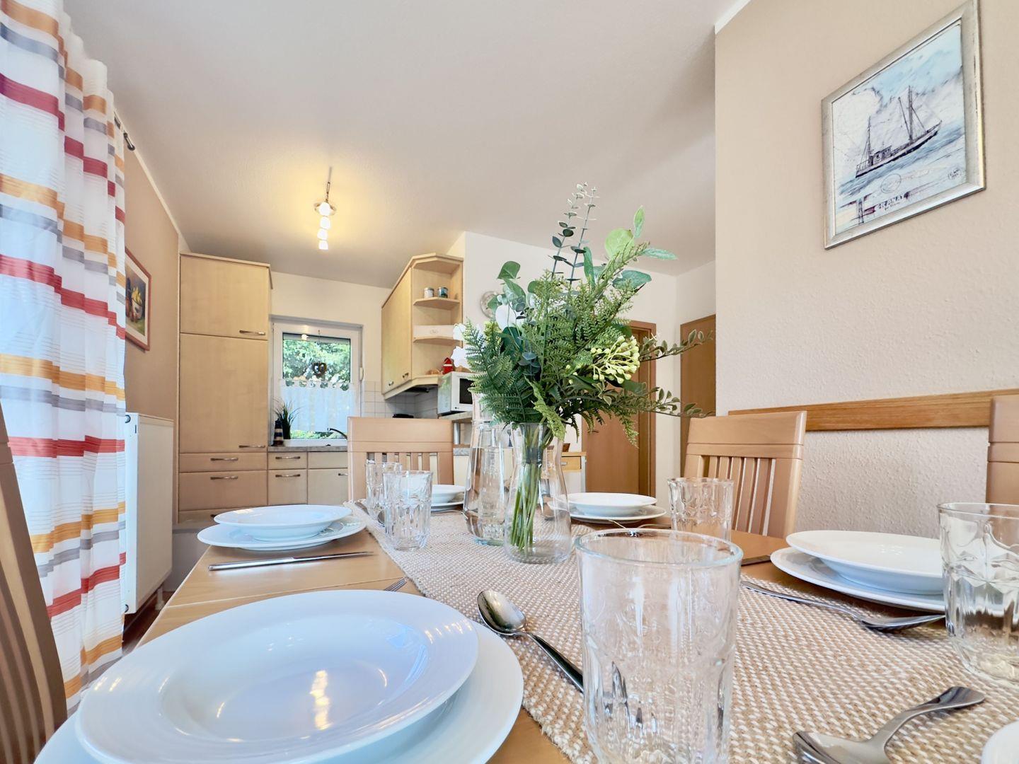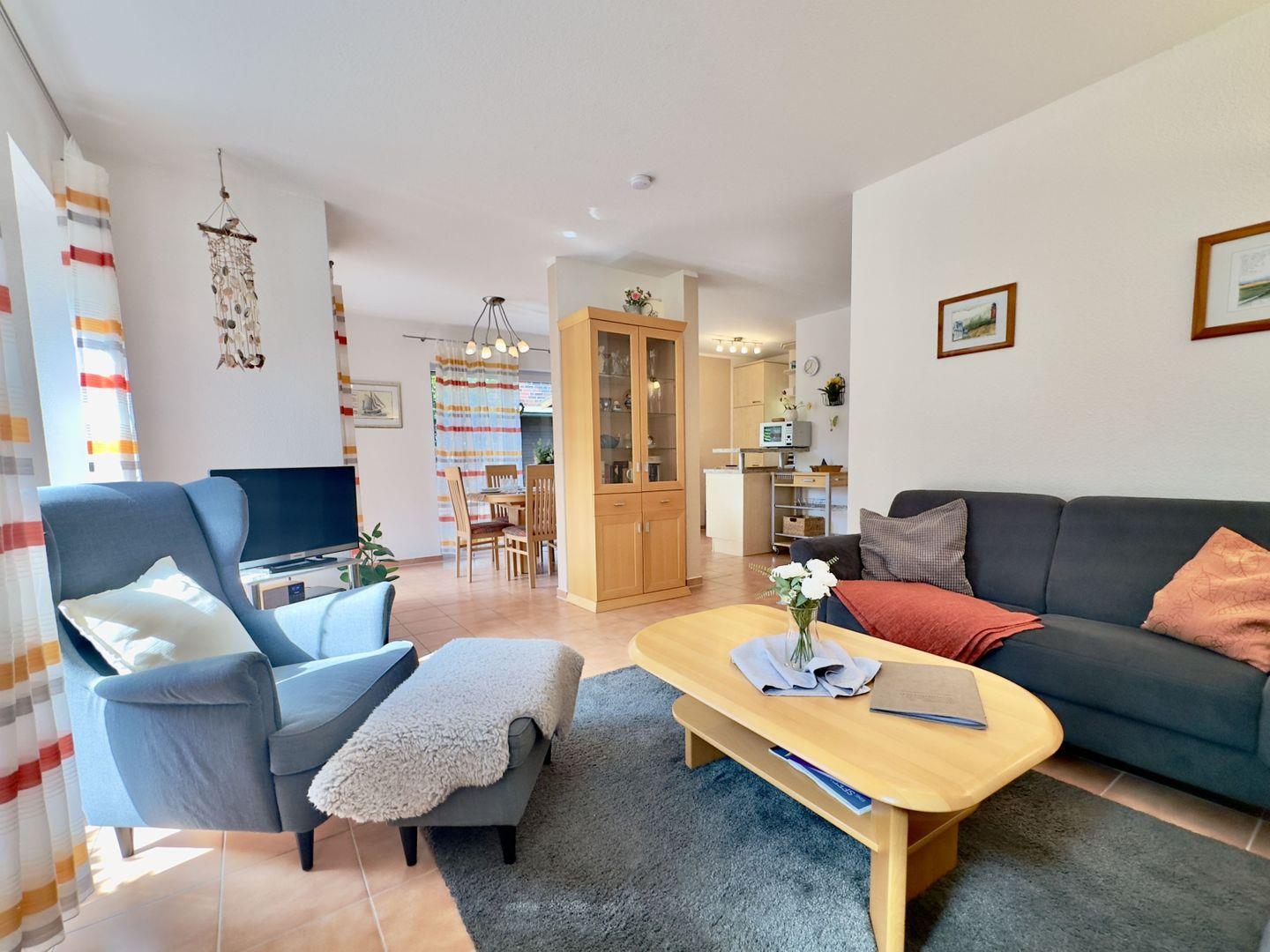 Über den hübschen Hauseingang erreichen Sie den lichtdurchfluteten und freundlichen Wohnbereich, die Küche ist offengehalten und mit einer Einbauküche inklusive Mikrowelle ausgestattet. Der zentrale Punkt auf dieser Ebene wird der große Esstisch mit sechs Stühlen sein. Hier kann neben den Mahlzeiten die Geselligkeit gelebt werden. Im hinteren Bereich, zur Terrasse gelegen, steht eine gemütliche Sofaecke und ein Ohrensessel mit Fernseher zur Verfügung. Ein Gäste-WC ist ebenfalls im Erdgeschoss vorhanden.