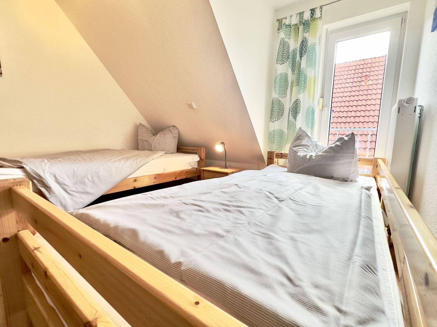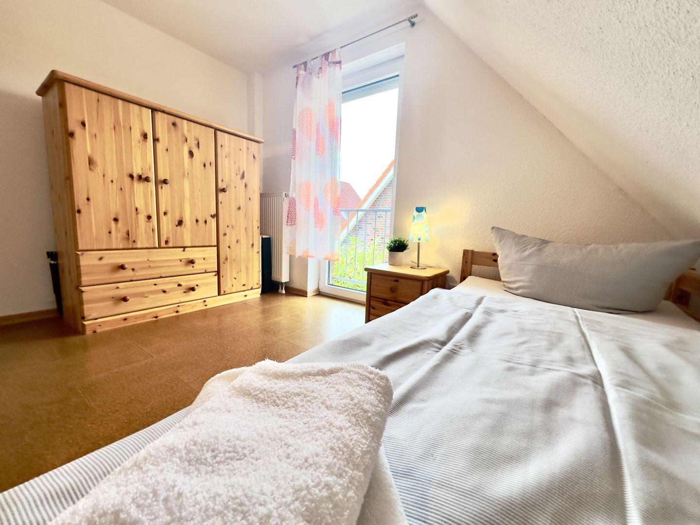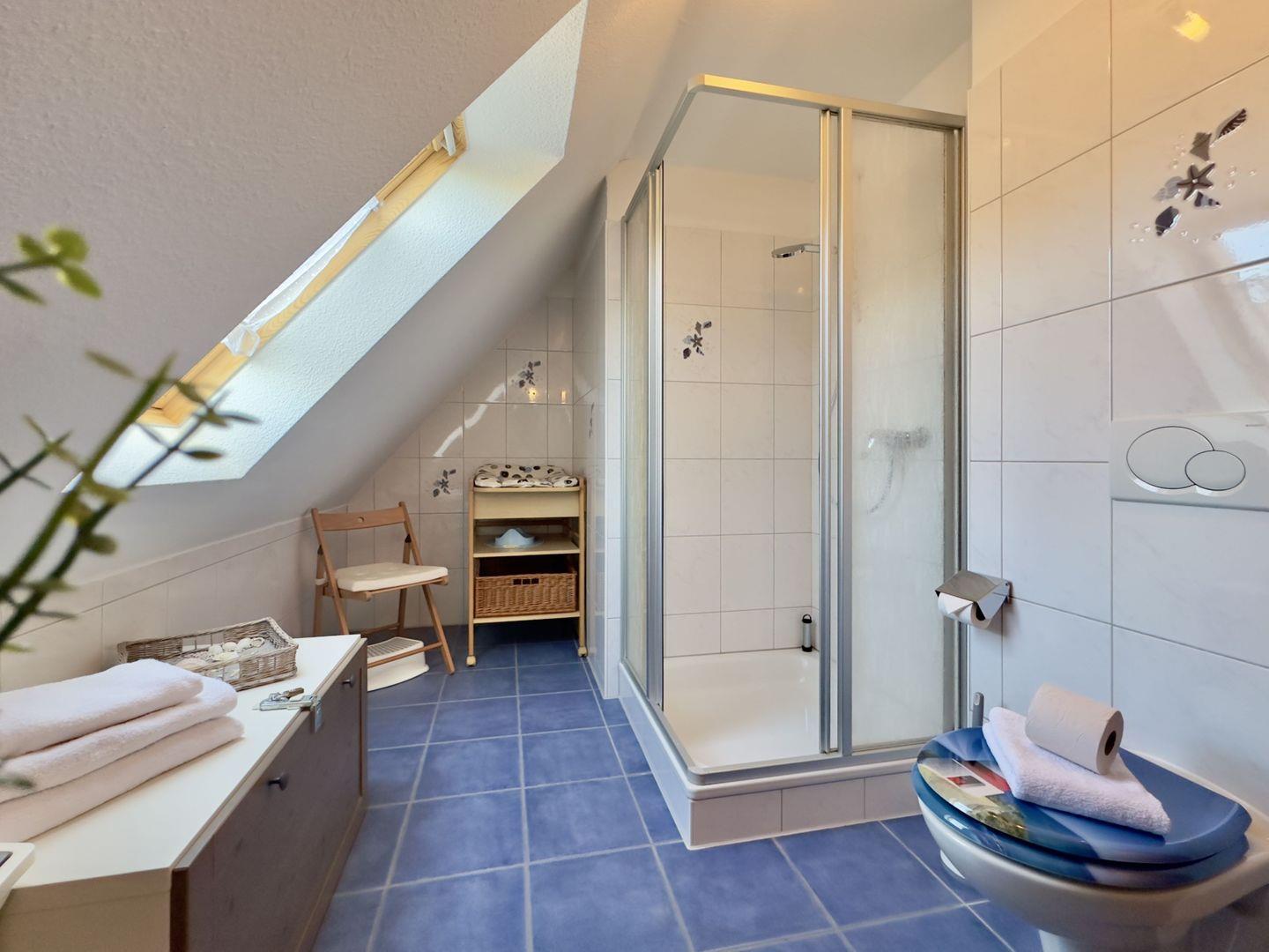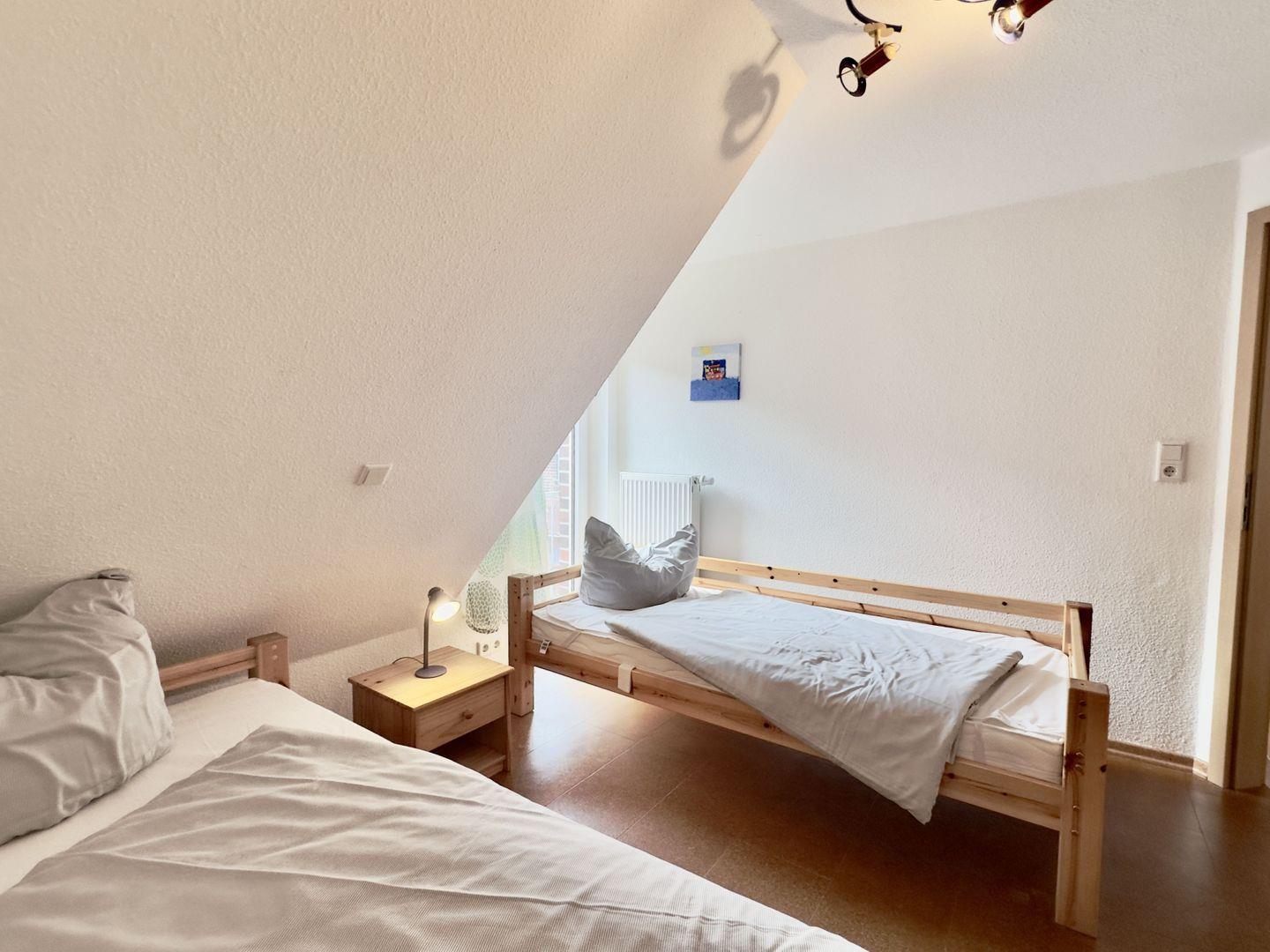 Über die helle und freundliche Holztreppe erreichen Sie die erste Etage. Dort befinden sich die 3 Schlafräumen, das große Bad mit Dusche und einem Wickeltisch. Das große Elternschlafzimmer verfügt über ein großes Doppeltbett und einen geräumigen Kleiderschrank. Die zwei Kinderschlafräume bieten mit Ihrer Größe und Ihren Einzelbetten ausreichend Flexibilität für unterschiedliche Schlafmöglichkeiten. Eines der Kinderschlafräume ist aufgrund der dort liegenden Dachbodentreppe nicht für Kleinkinder geeignet. In diesem Schlafraum befindet sich ein Einzelbett und eine Kommode. Der zweite Kinderschlafraum verfügt über zwei Einzelbetten und einen Kleiderschrank.