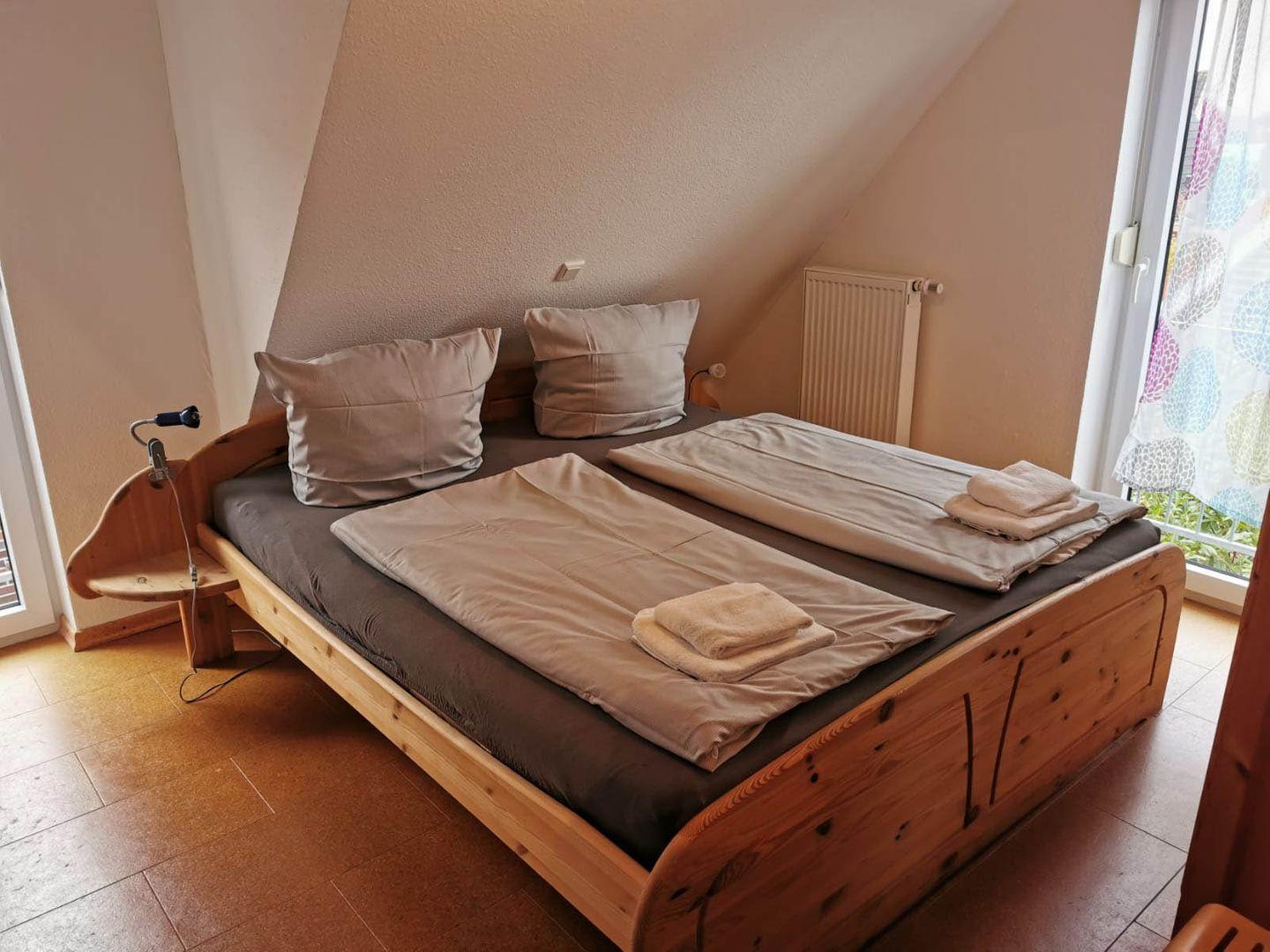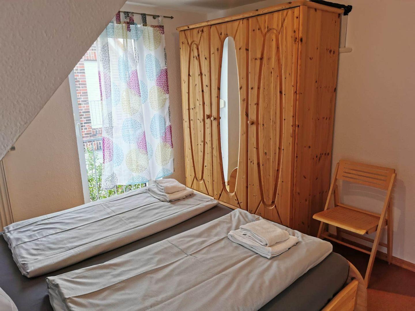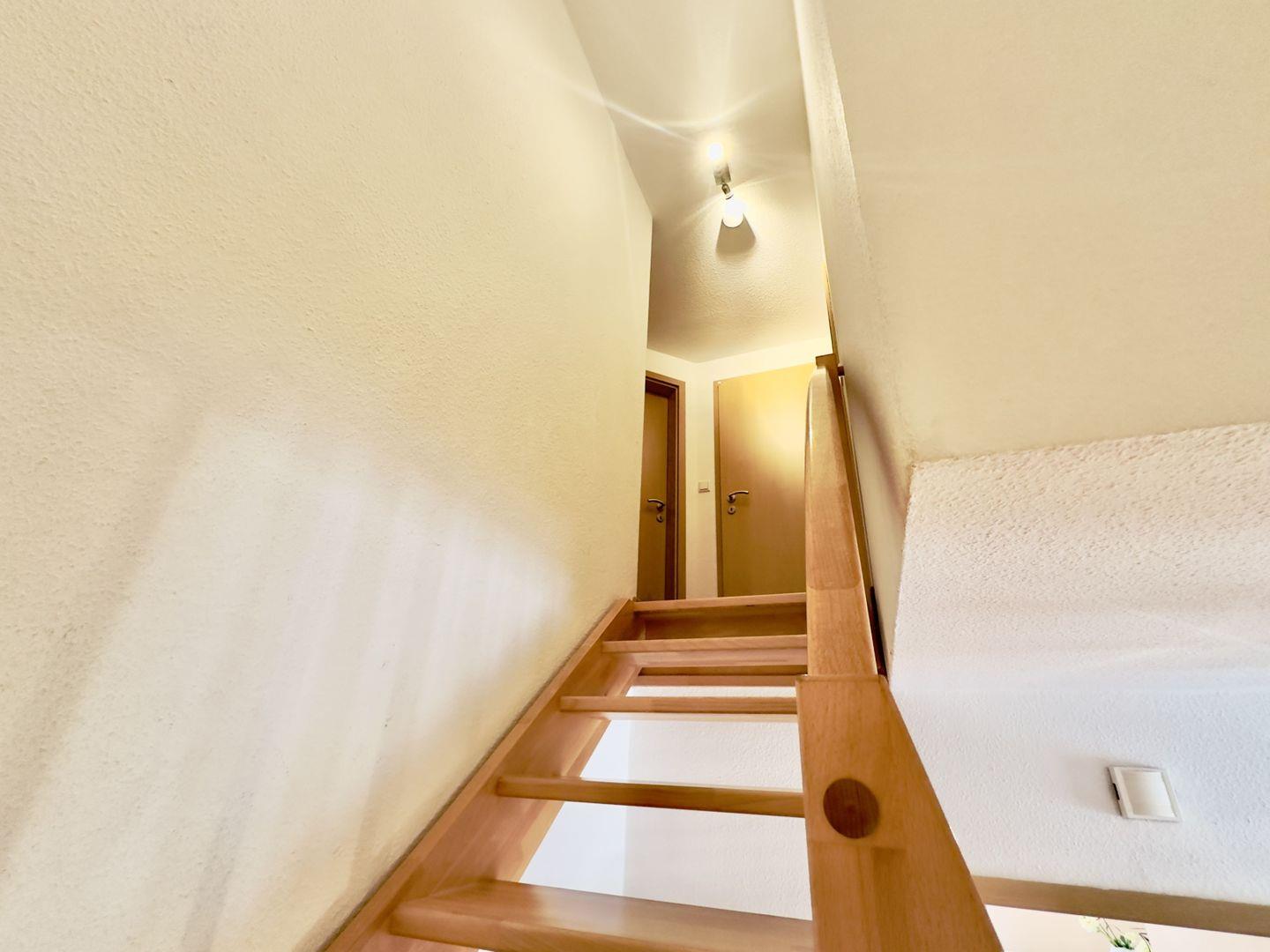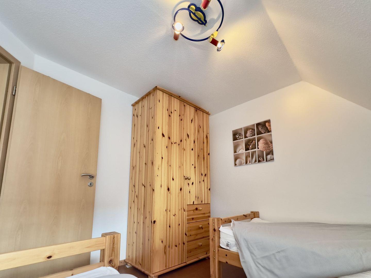 Über die helle und freundliche Holztreppe erreichen Sie die erste Etage. Dort befinden sich die 3 Schlafräumen, das große Bad mit Dusche und einem Wickeltisch. Das große Elternschlafzimmer verfügt über ein großes Doppeltbett und einen geräumigen Kleiderschrank. Die zwei Kinderschlafräume bieten mit Ihrer Größe und Ihren Einzelbetten ausreichend Flexibilität für unterschiedliche Schlafmöglichkeiten. Eines der Kinderschlafräume ist aufgrund der dort liegenden Dachbodentreppe nicht für Kleinkinder geeignet. In diesem Schlafraum befindet sich ein Einzelbett und eine Kommode. Der zweite Kinderschlafraum verfügt über zwei Einzelbetten und einen Kleiderschrank.