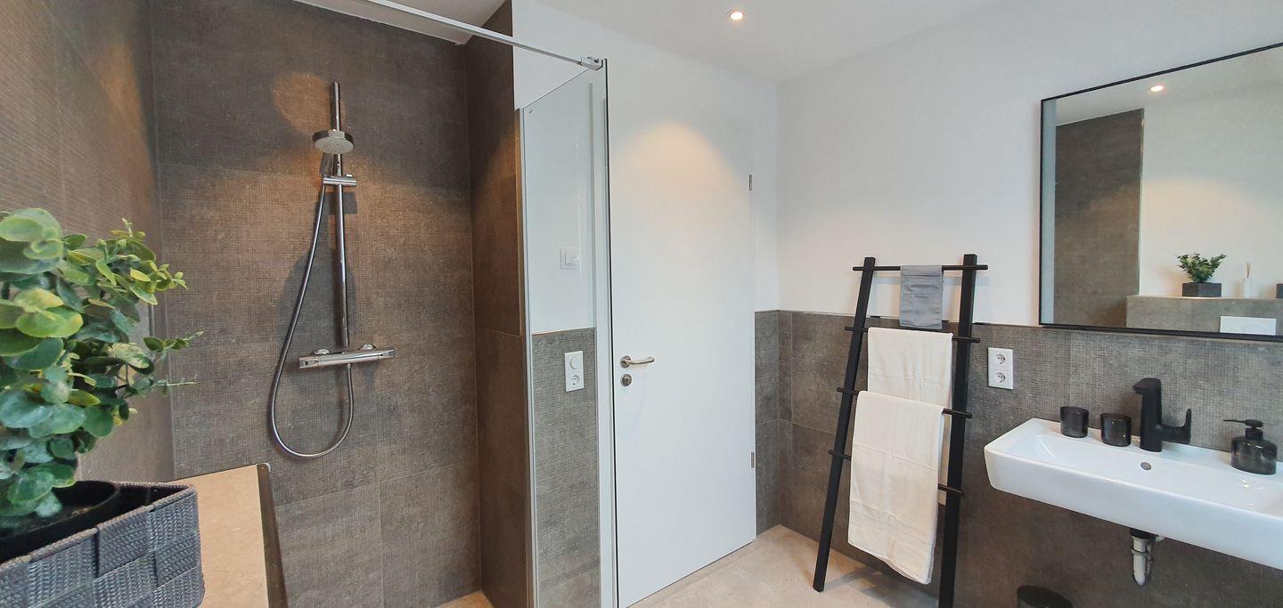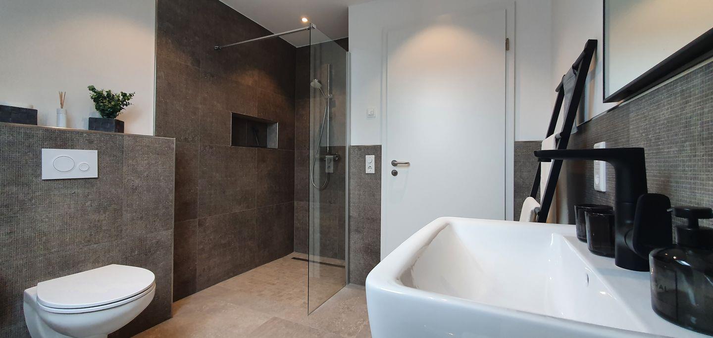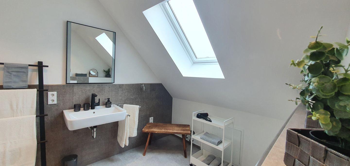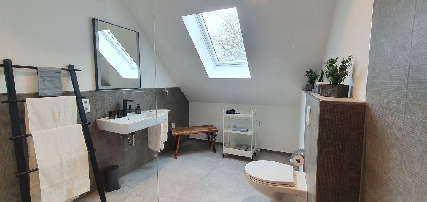 Das sehr stylische, schlichte, moderne neue Bad mit hochwertigen italienischen Designerfliesen hat eine große offene Dusche, ein dimmbares Licht und ein großes Dachfenster, so dass Sie bestimmt ein paar erholsame Wellnessmomente dort verleben werden.