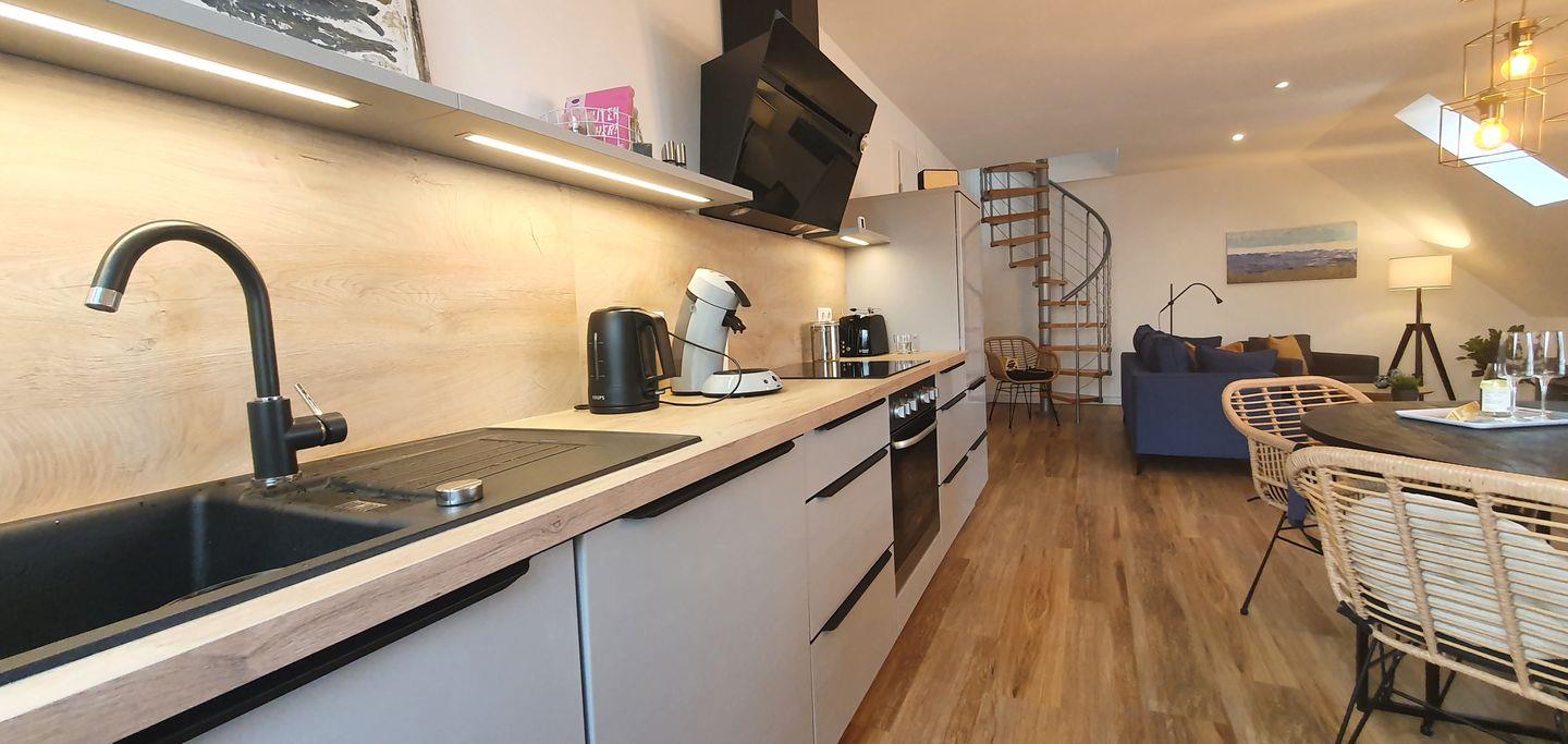 Eine sehr chice und exklusiv ausgestattete hochwertige offene Wohnküche mit Blick auf die Berdumer Mühle lässt beim Kochen keine Wünsche offen. Mit dem Internetradio sind Sie jederzeit bestens informiert.