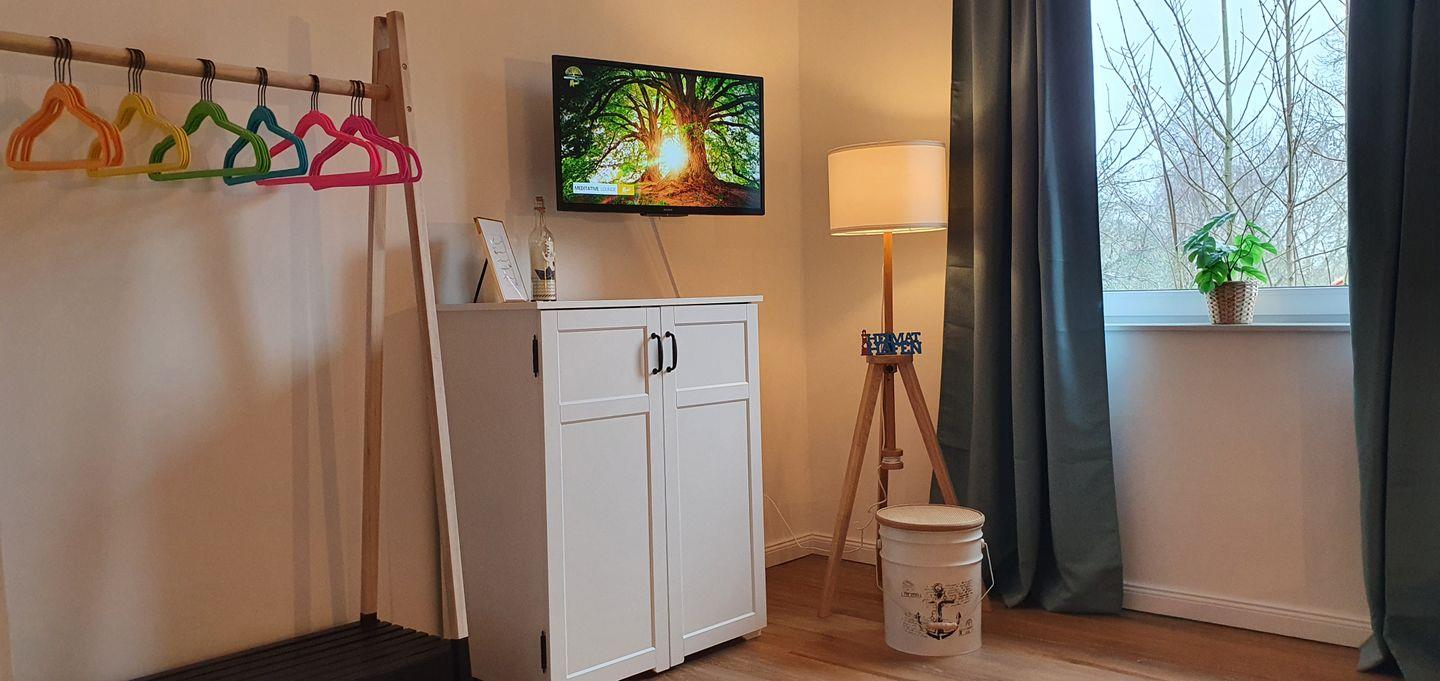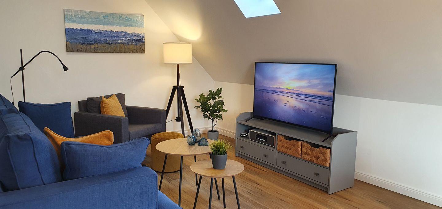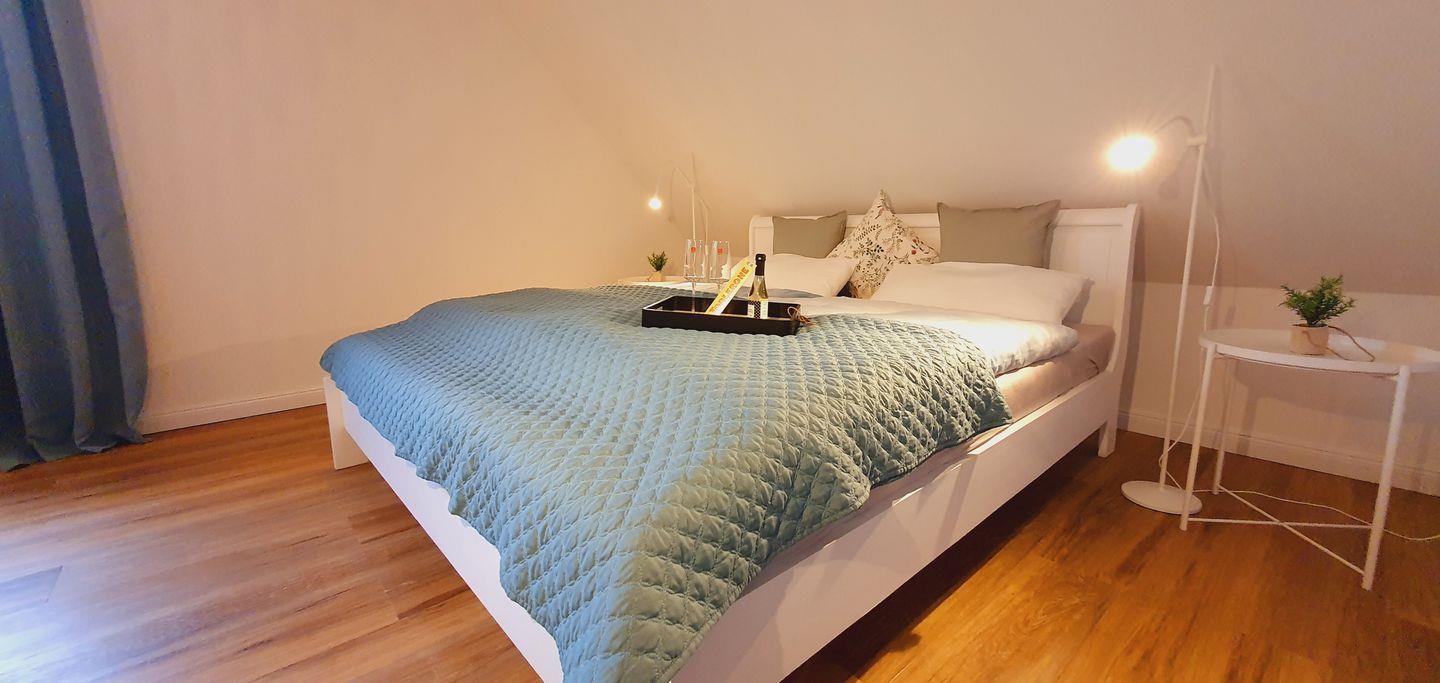 Sie bekommen drei Schlafzimmer für 2-5 Personen. Ein kleines gemütliches Schlafzimmer mit einem ausziehbaren Bett, ein großes Schlafzimmer mit einem großen Doppelbett (180x200cm) und ein weiteres Highlight, ein großes bequemes Bett (180x200cm) oben auf dem Dachboden runden die besonders schöne Wohnung ab. Im großen Schlafzimmer finden Sie ein zweites hochwertiges TV-Gerät von Sony vor.