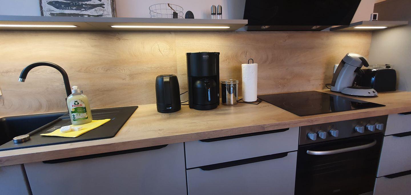 Neben einer Senseo-Pad-Maschine, einer Krups Filterkaffeemaschine befindet sich neben vielen weiteren namhaften Elektrogeräten außerdem eine Spülmaschine in der modernen Küche.