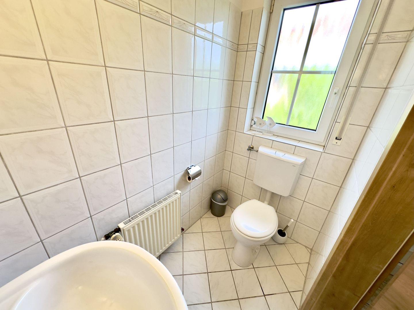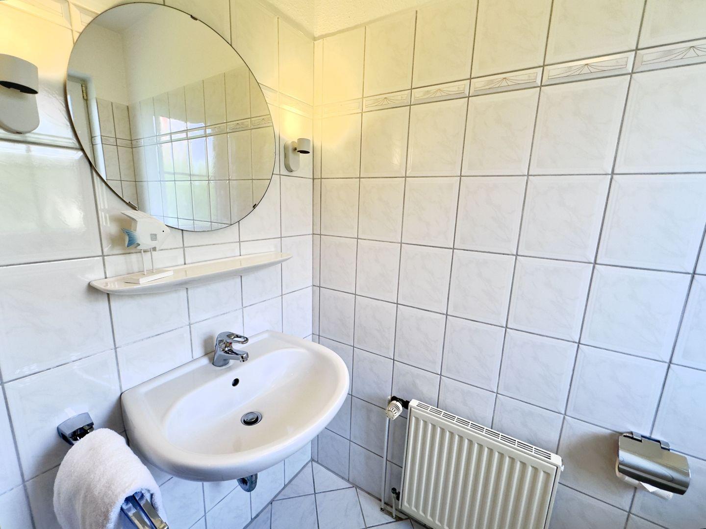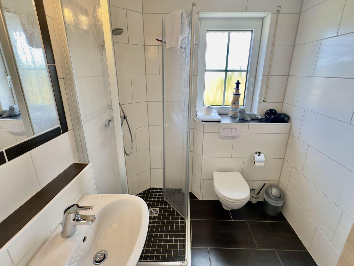 Das helle Badezimmer in der ersten Etage verfügt über eine ebenerdige Dusche, ein Waschbecken und ein WC.