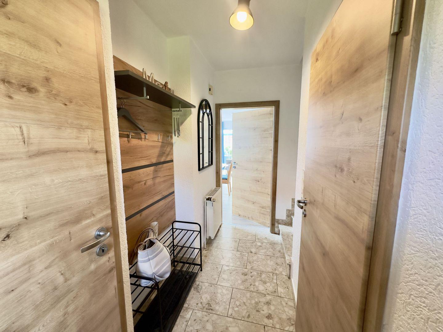 Beim Betreten des Hauses gelangen Sie über einen geräumigen Eingangsbereich zu einem Gäste-WC und dem Wohnraum.