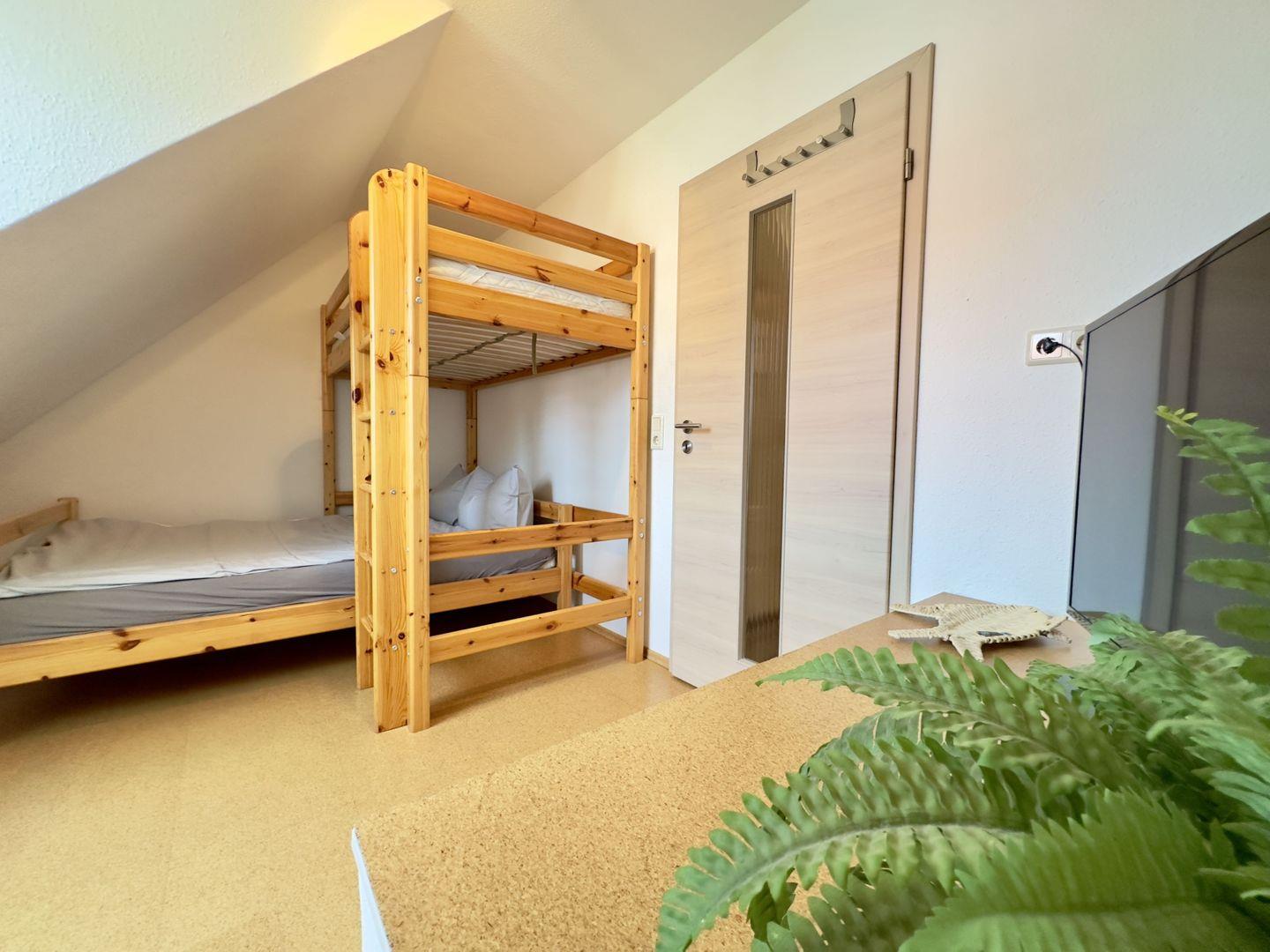 Das zweite Schlafzimmer ist mit einem Etagenbett ausgestattet, das Platz für zwei Personen im unteren Bereich bietet und ein Hochbett für ein Kind im oberen Bereich hat.