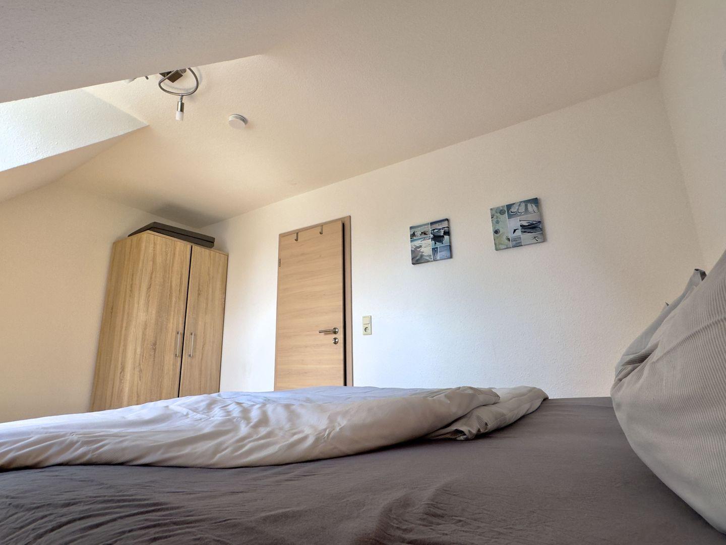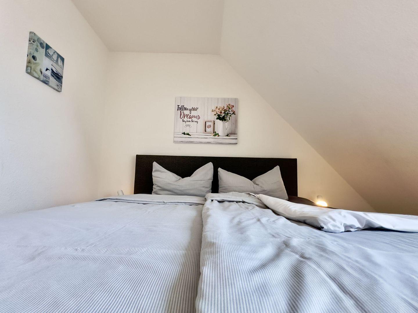 Das erste große Schlafzimmer verfügt über ein komfortables Boxspringbett und einen geräumigen Kleiderschrank.