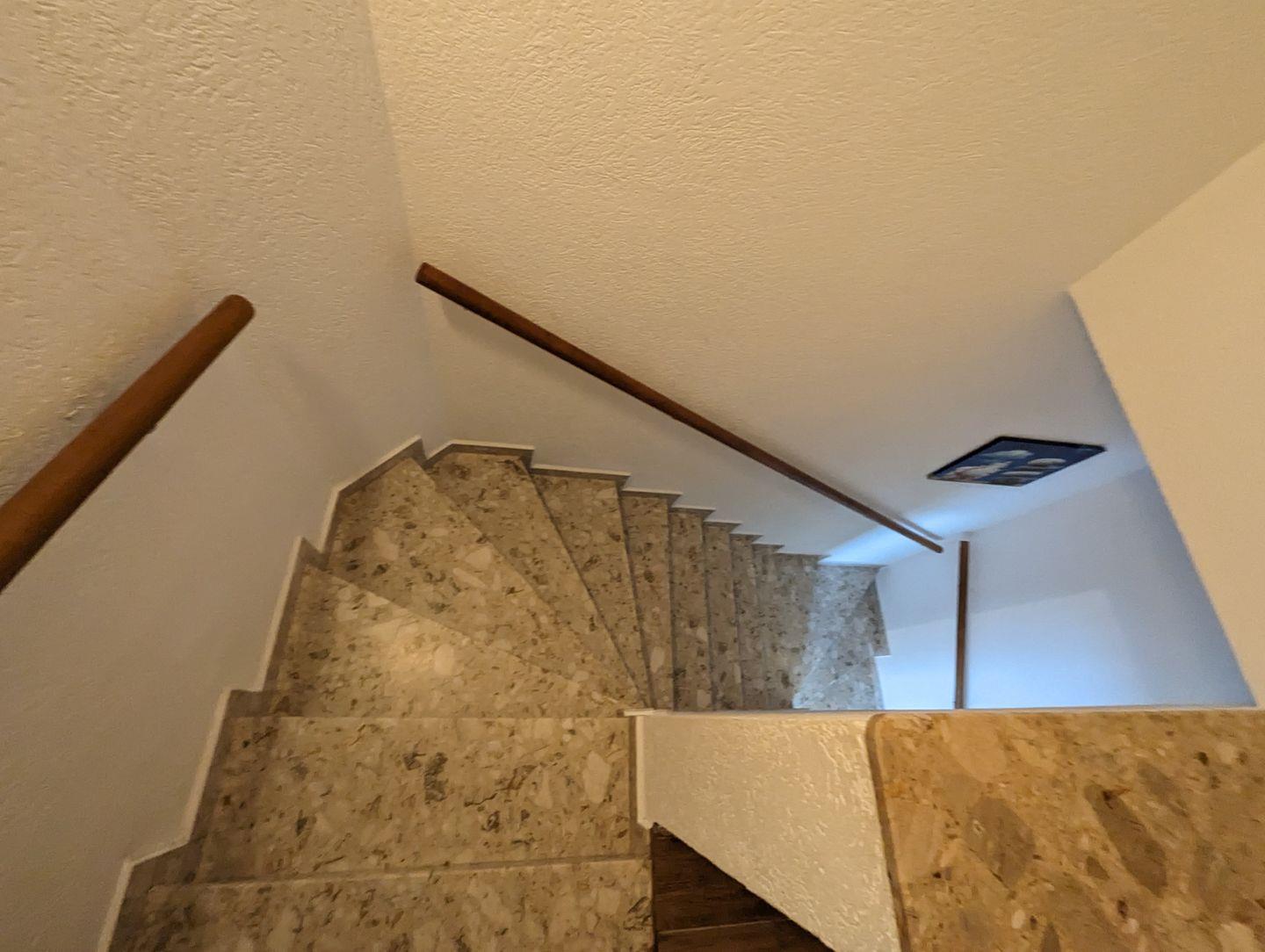 Über eine Marmortreppe gelangen Sie in die erste Etage, wo sich zwei Schlafzimmer befinden.