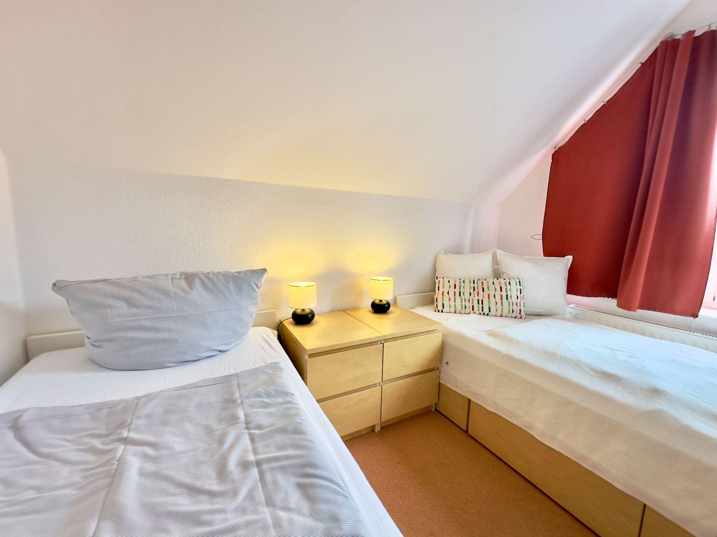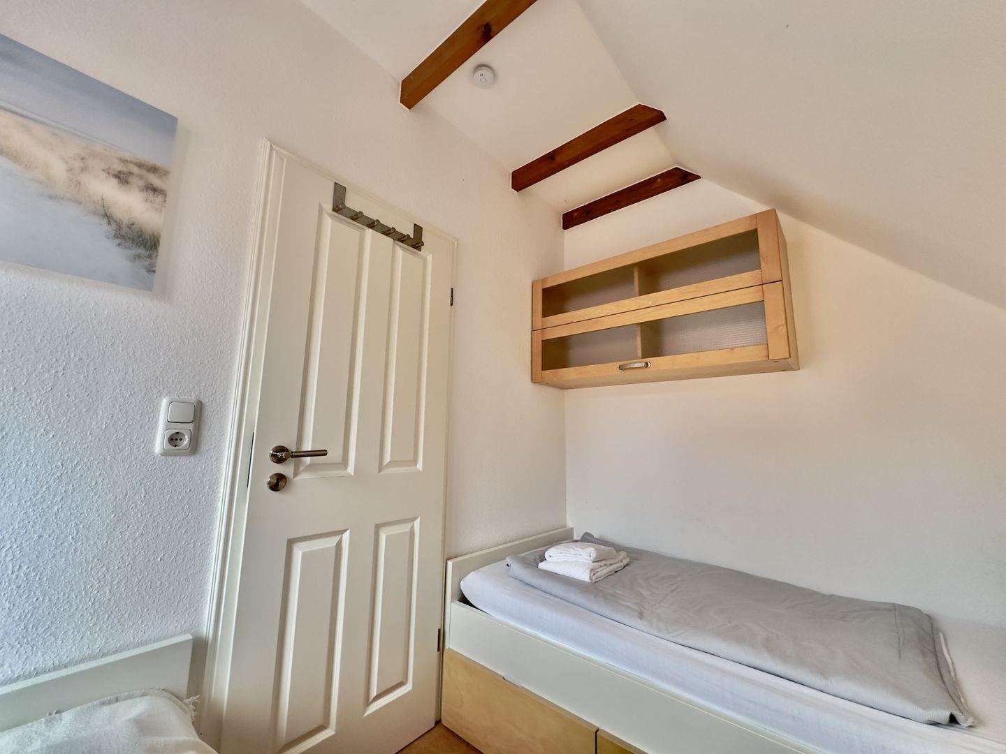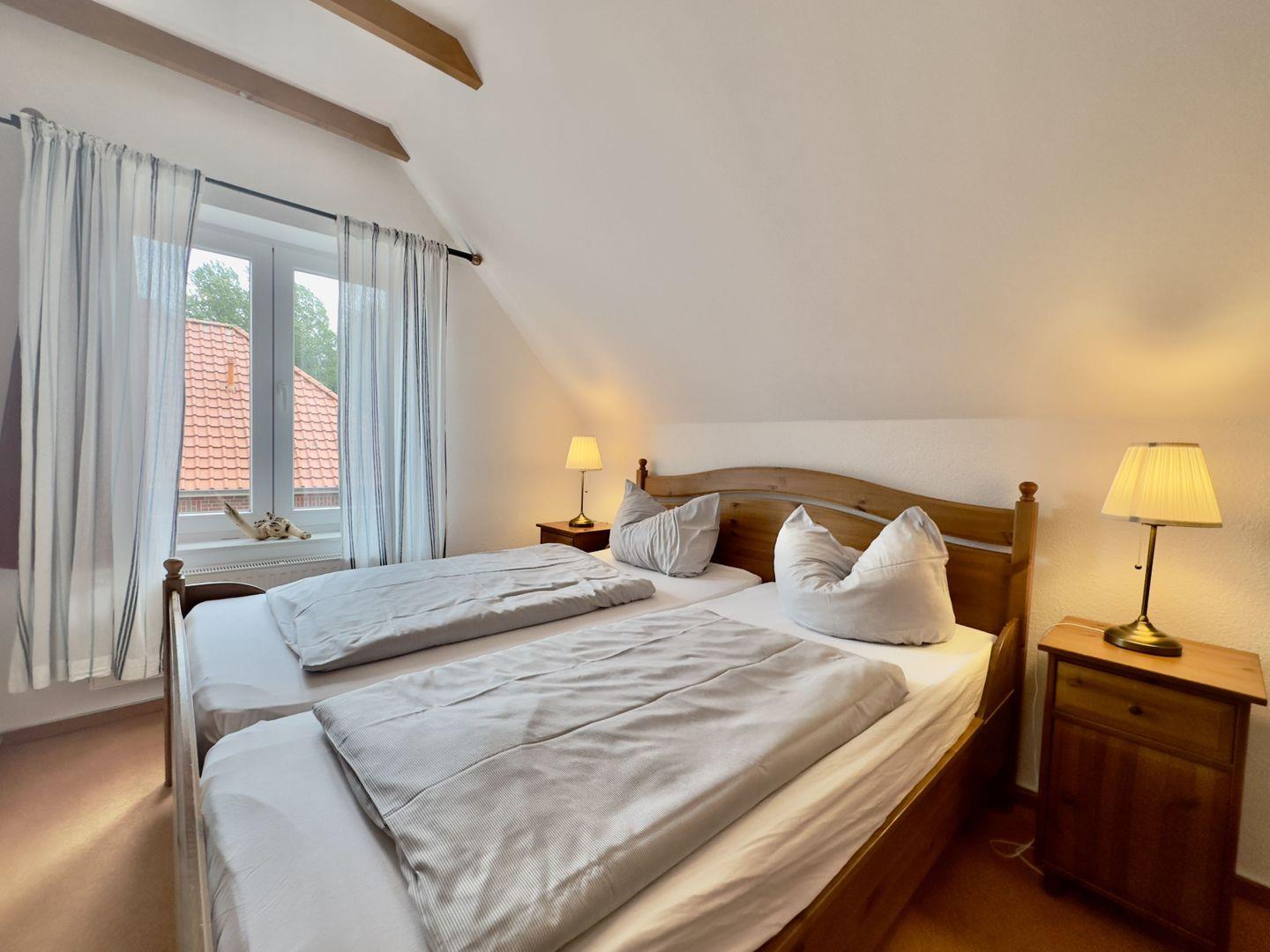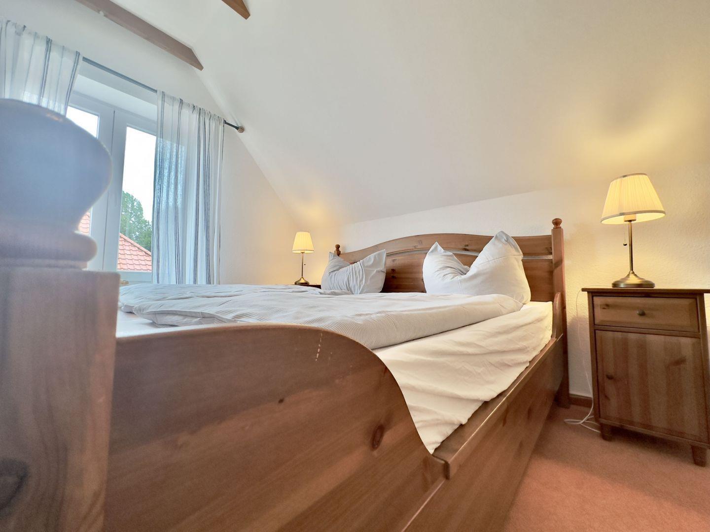 Das Schlafzimmer, ausgelegt mit Teppichboden, strahlt eine behagliche Atmosphäre aus, ergänzt durch die warmen Holzmöbel. Ein Doppelbett und ein großer Kleiderschrank stehen zur Verfügung, um den Aufenthalt angenehm zu gestalten. Das zweite Schlafzimmer verfügt über zwei Einzelbetten mit Schubladen darunter und einem Hängeschrank für die Kleidungsaufbewahrung.