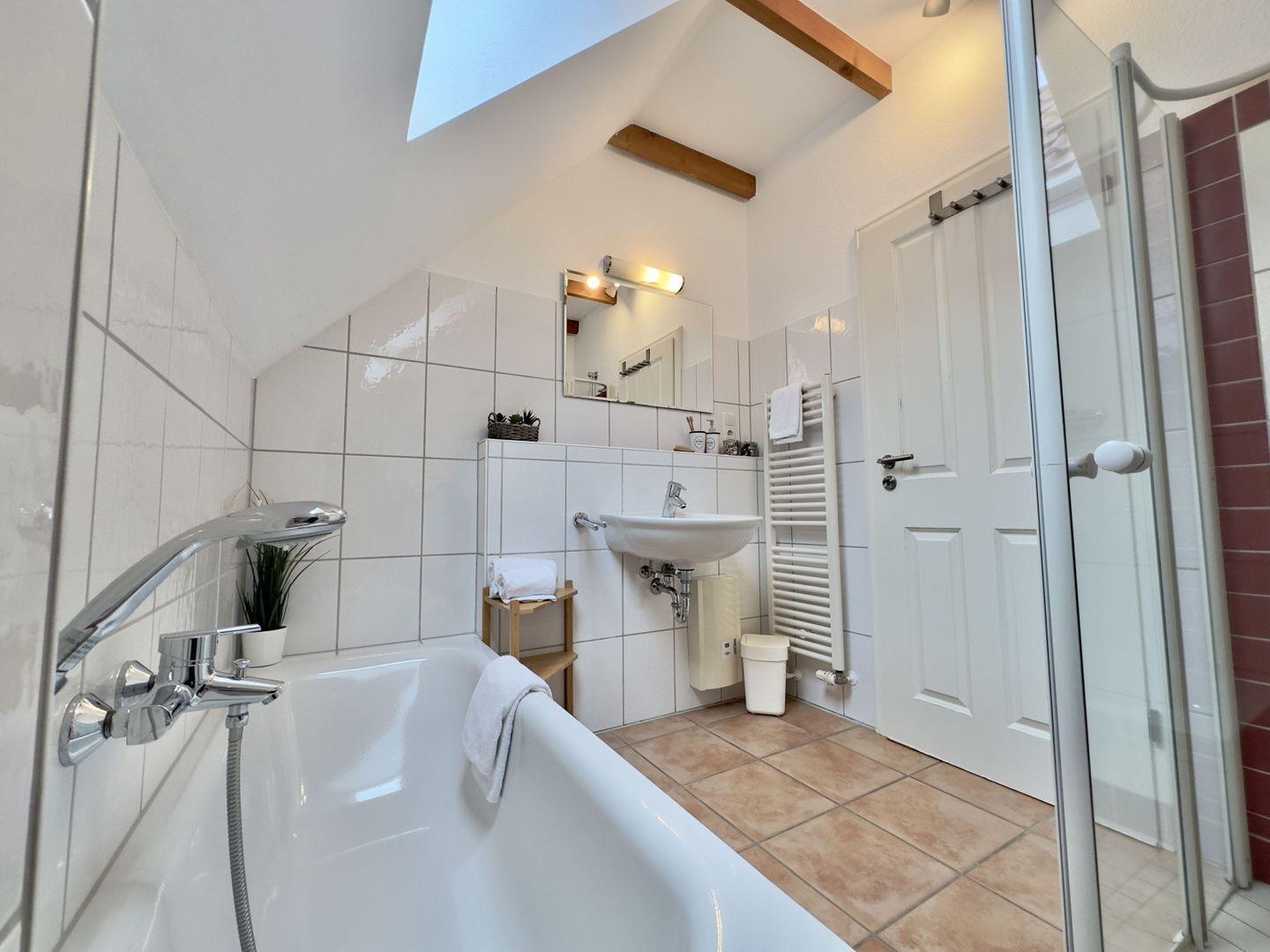 Das hell geflieste Badezimmer bietet mit Badewanne, Dusche und einem Fenster viel Komfort und Raum. Ein großer Wandspiegel vervollständigt die Ausstattung dieses Badezimmers.
