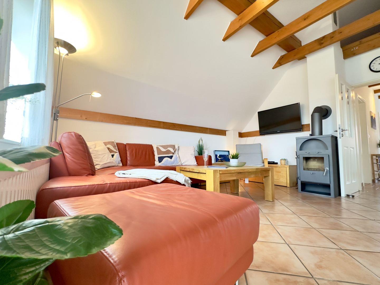 Das Wohnzimmer ist besonders beeindruckend mit seinen hohen Decken und den natürlichen Holzbalken, die eine charmante Atmosphäre schaffen. Die großzügige Fensterfront lässt viel Tageslicht herein und verleiht der Ferienunterkunft ein helles und einladendes Ambiente. Eine gemütliche Sofaecke lädt zu entspannten Abenden vor dem Kamin ein.