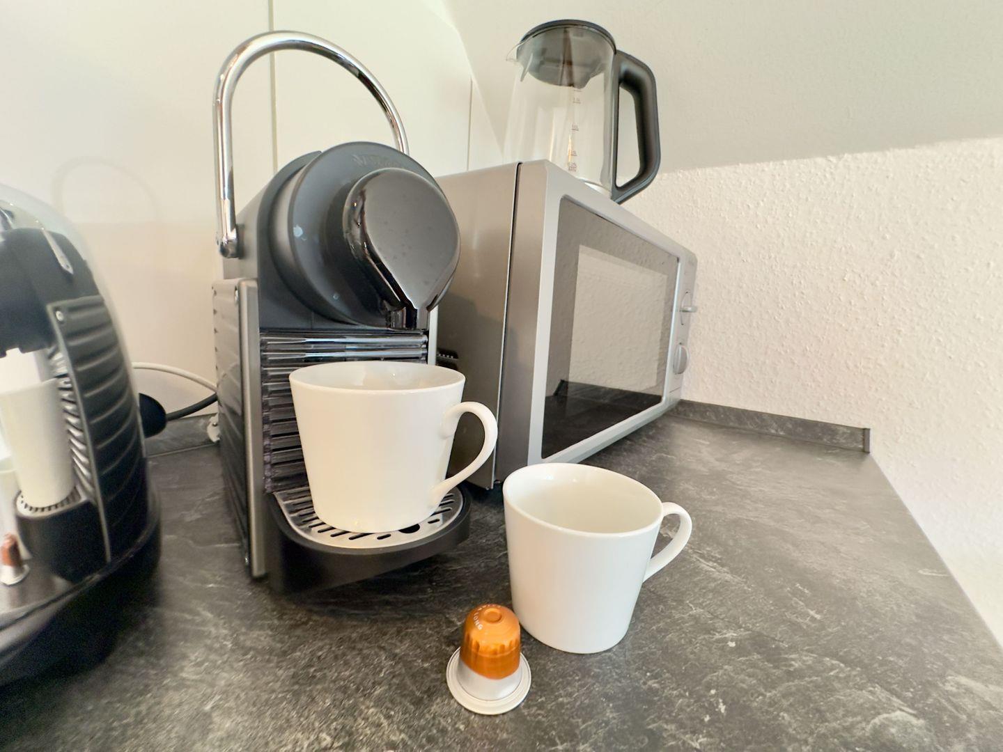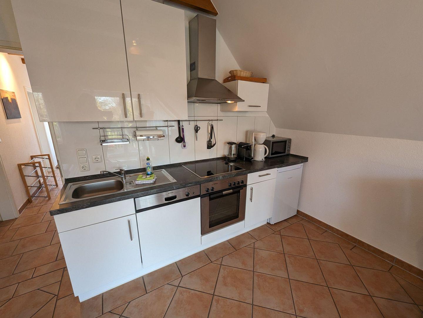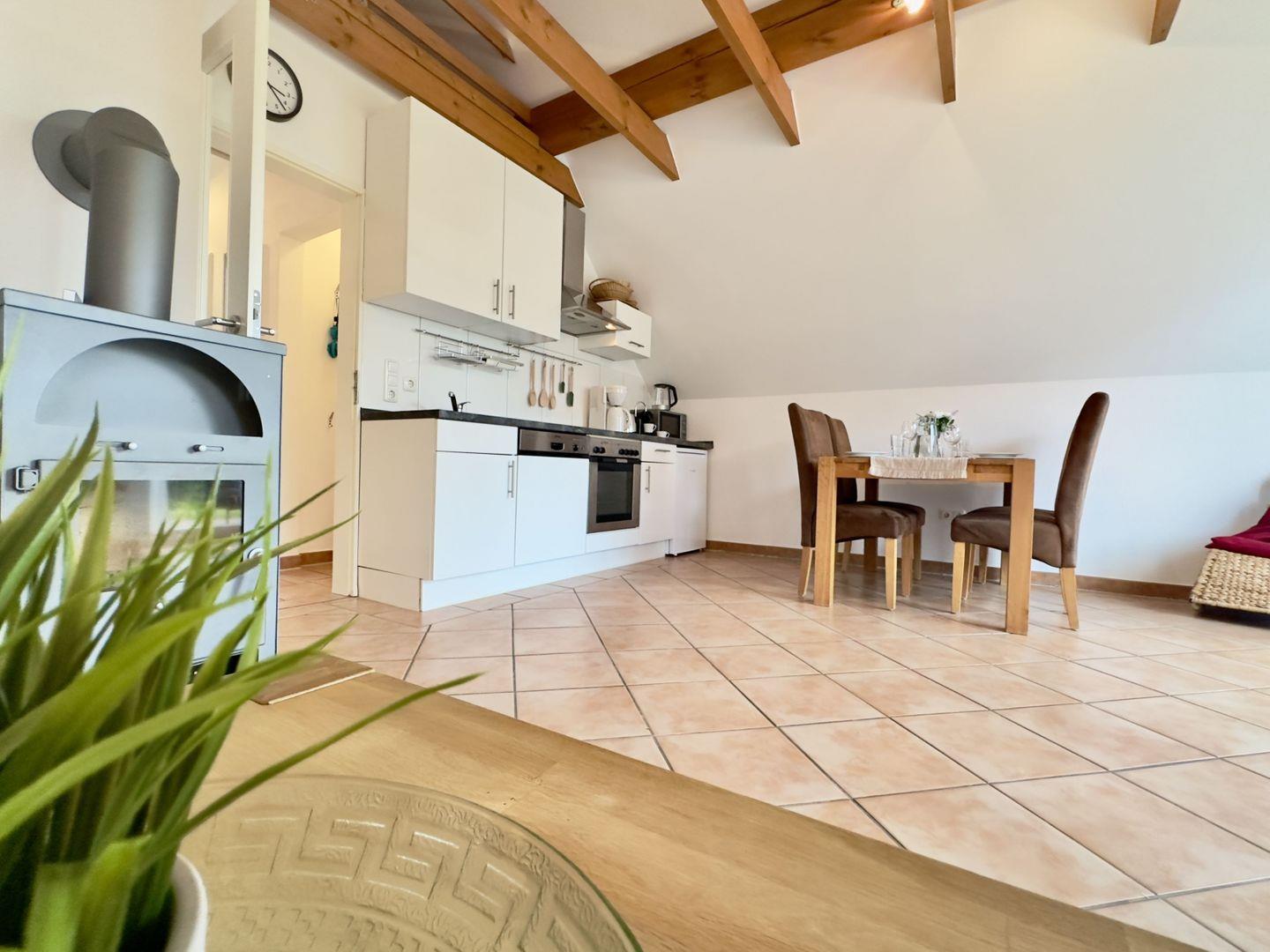 Die offene Wohnküche ist direkt mit dem Esszimmer im Wohnbereich verbunden und bietet alles, was man für die Selbstverpflegung im Urlaub benötigt. Der geräumige Esstisch bietet einen herrlichen Blick auf den Balkon und ausreichend Platz für gesellige Mahlzeiten sowie Spieleabende.