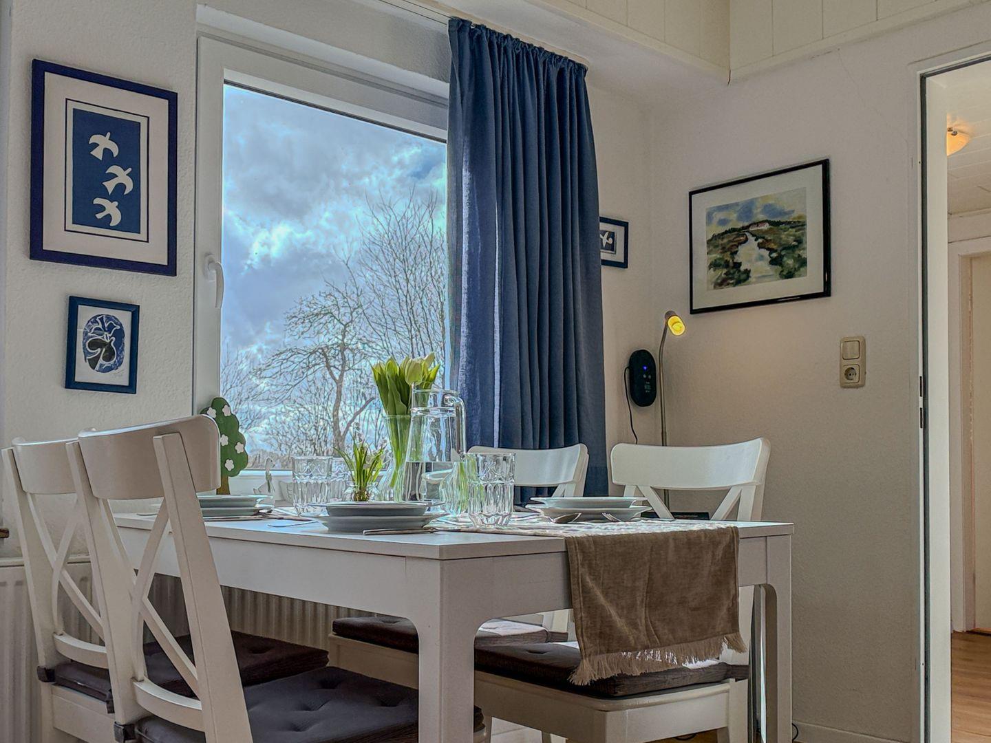 Die Wohnküche, durchflutet von natürlichem Licht, ist nicht nur funktional, sondern auch ein Ort des Genusses. Hier treffen modernste Annehmlichkeiten wie Geschirrspüler, Kühlschrank, 4-Platten-Kochfeld, Kaffeemaschine und Mikrowelle auf einen gemütlichen Essbereich mit Sofa, Tisch und Stühlen. Der Blick aus dem Fenster offenbart einen idyllischen Garten, der zur Erkundung einlädt.