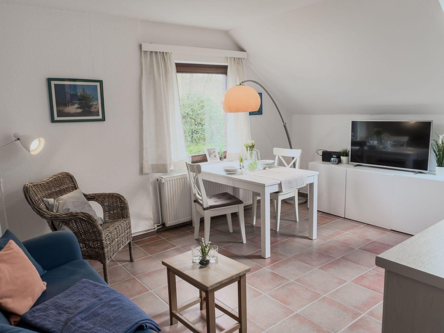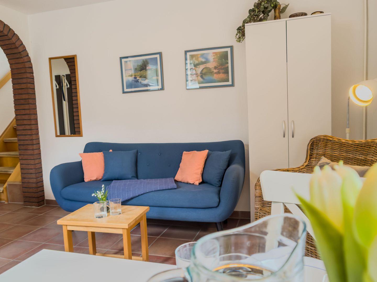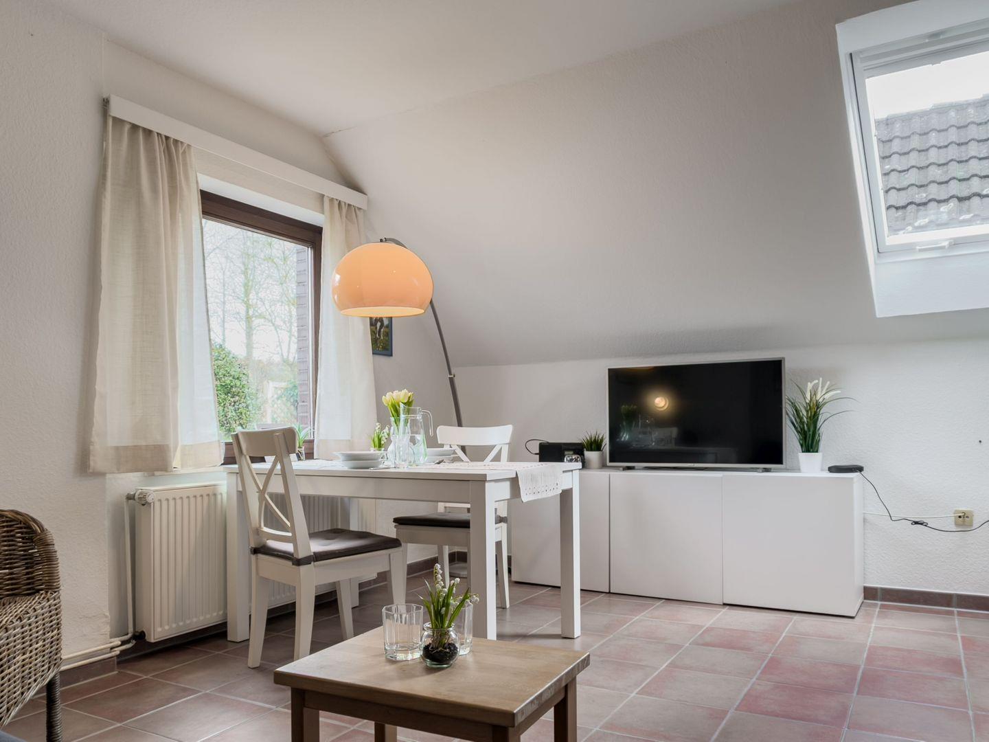 Im Erdgeschoss finden Sie den einladenden Wohnbereich mit einer gemütlichen Küchenzeile, die perfekt ausgestattet ist, um Ihre eigenen Mahlzeiten zuzubereiten. Hier können Sie gemeinsame Abende mit der Familie oder Freunden verbringen, während das Sofa und der Esstisch für gesellige Stunden sorgen. Zwei Fenster sorgen für viel Tageslicht, und eines davon bietet Ihnen den wunderbaren Deichblick, der das ganze Ambiente noch besonderer macht.