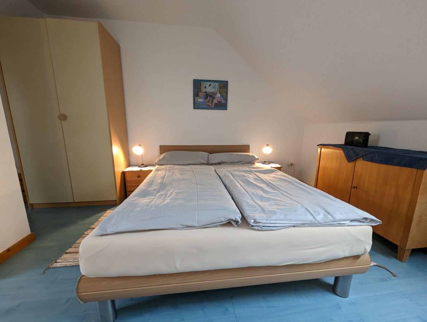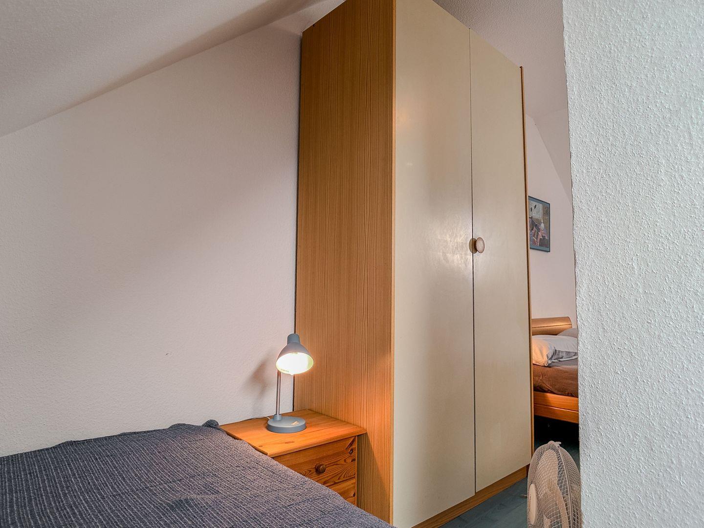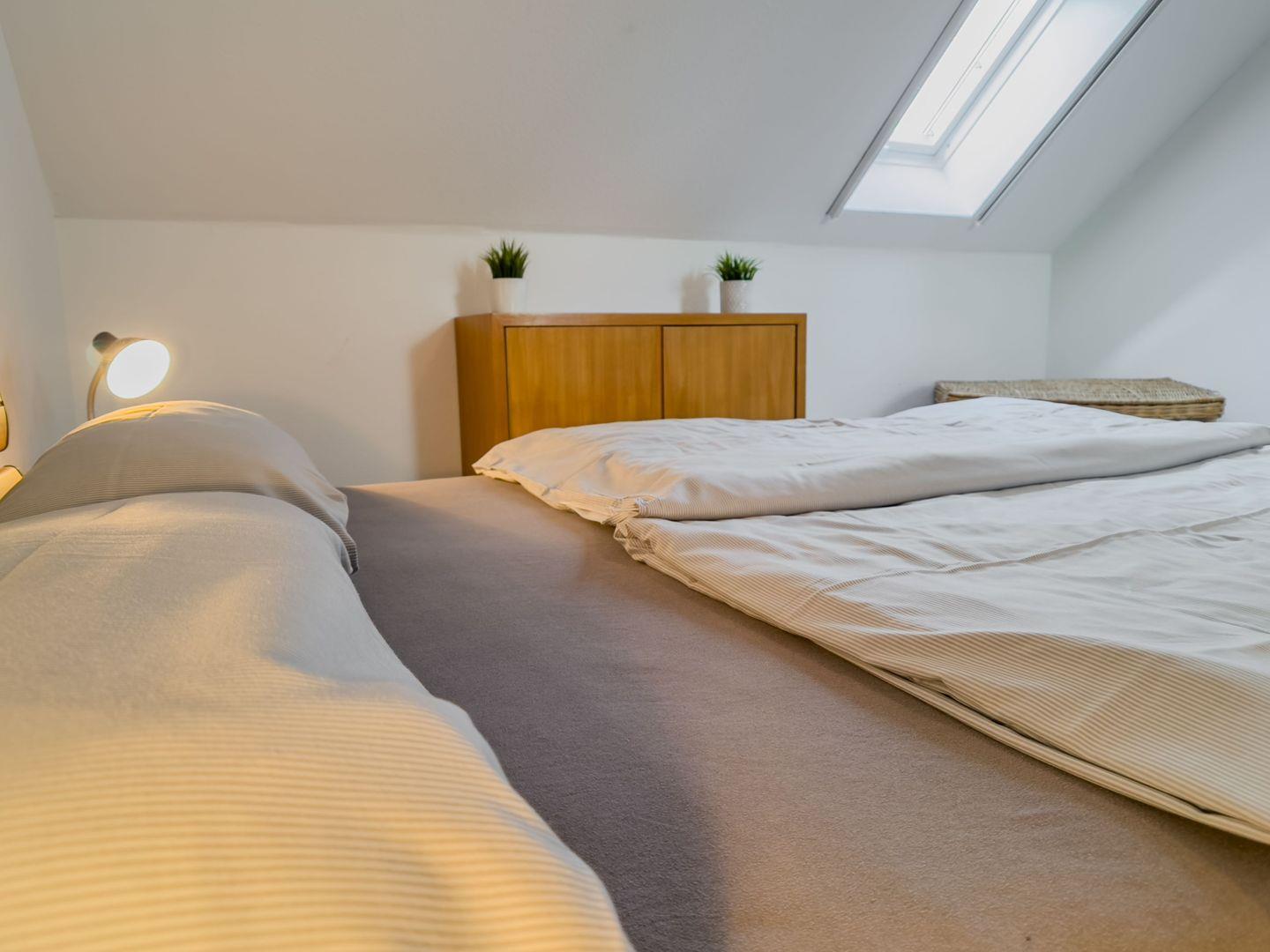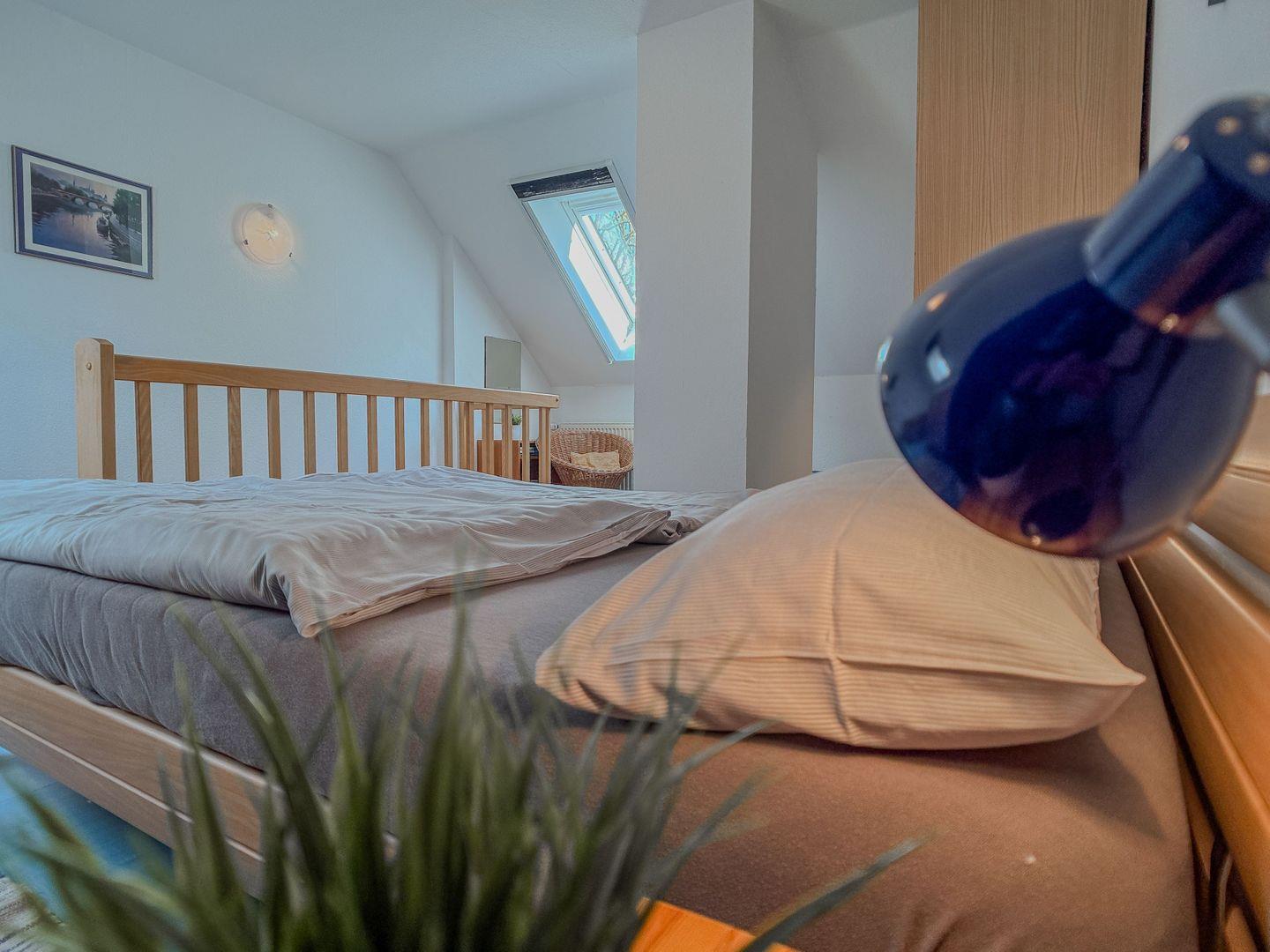 Über eine Holztreppe gelangen Sie in die Schlafgalerie im Dachgeschoss. Diese bietet mit einem 90 cm und einem 140 cm breiten Bett ausreichend Platz für erholsame Nächte. Ein Kleiderschrank und kleine Möbelstücke sorgen für eine angenehme Atmosphäre.