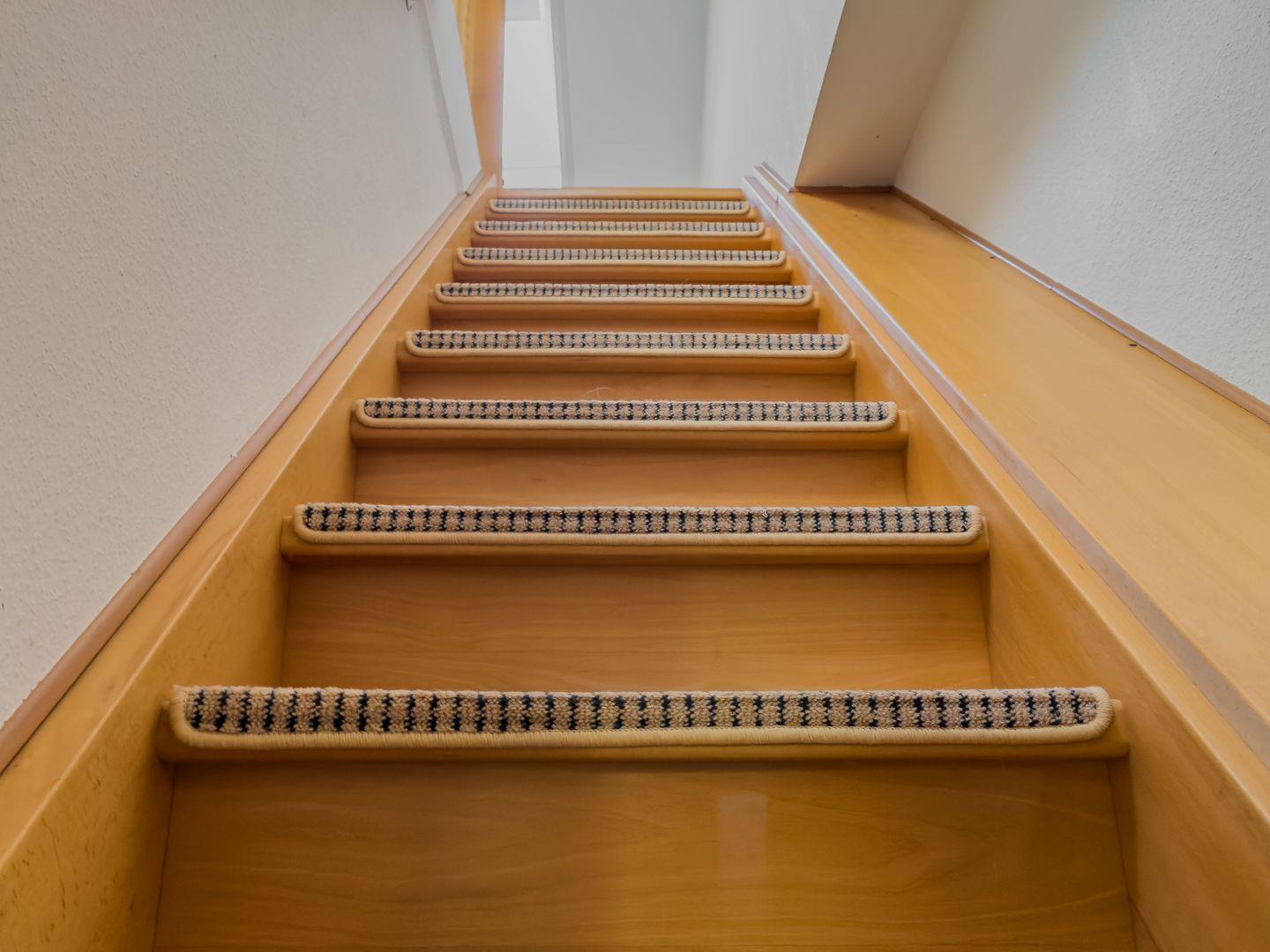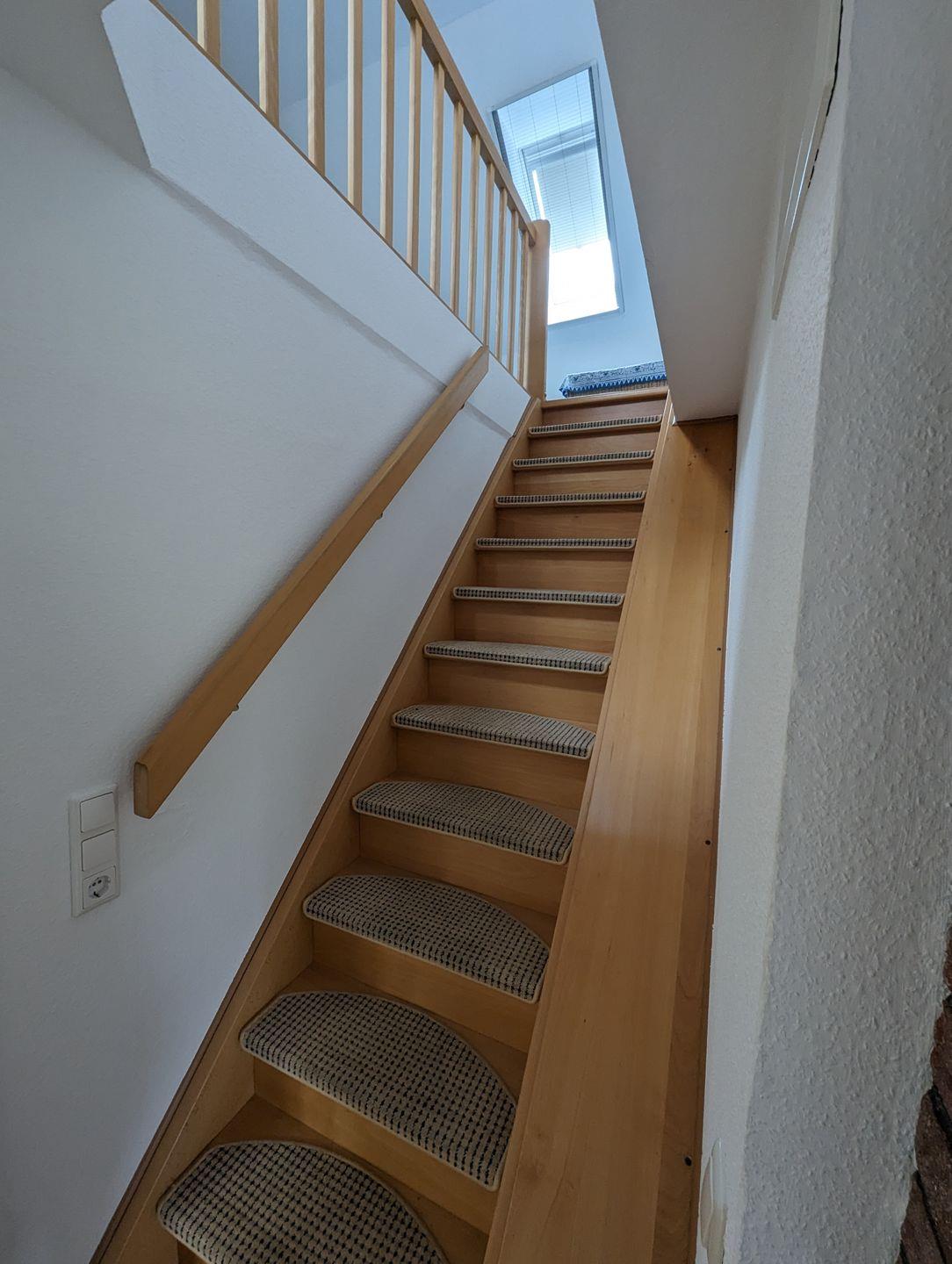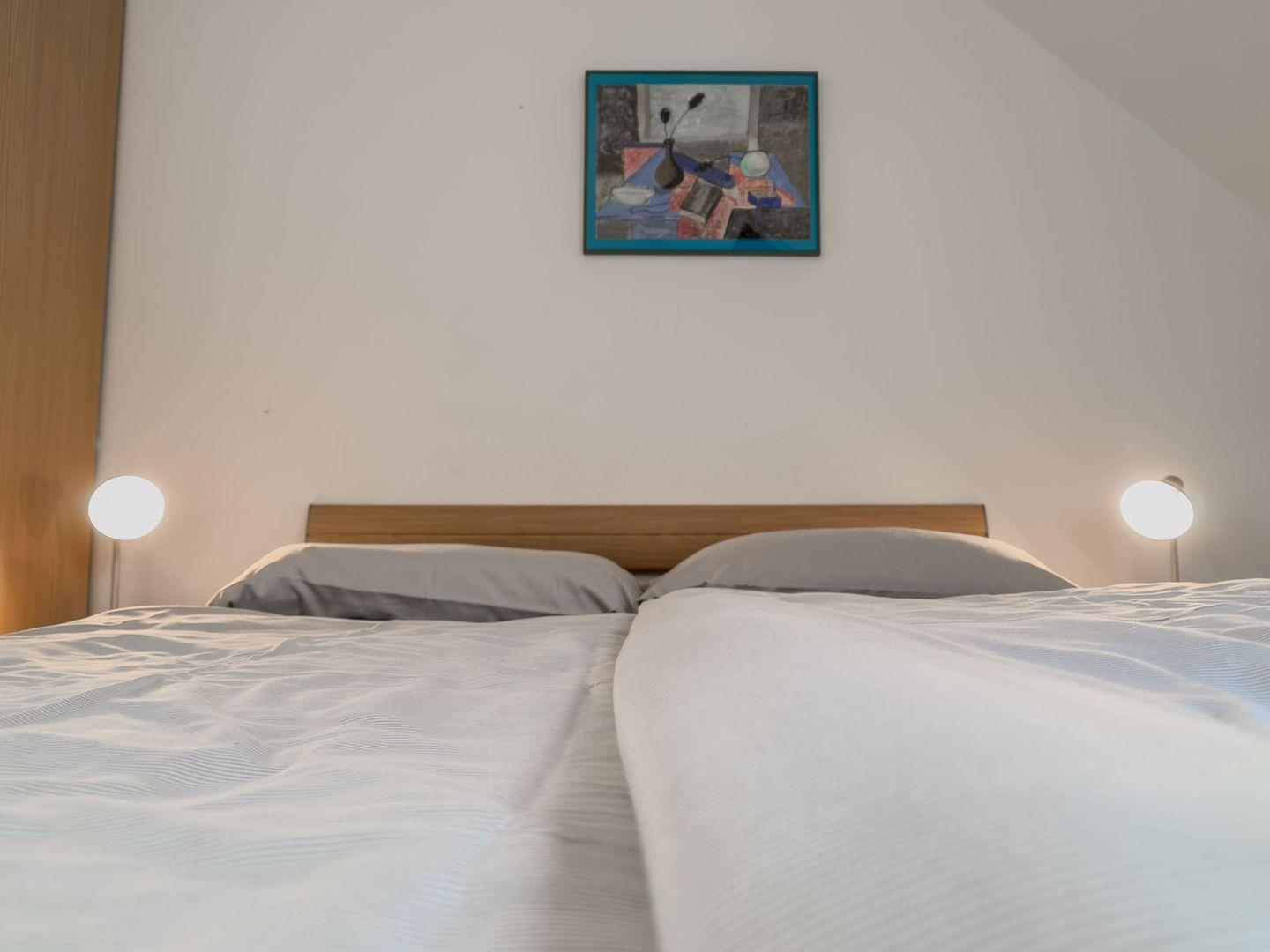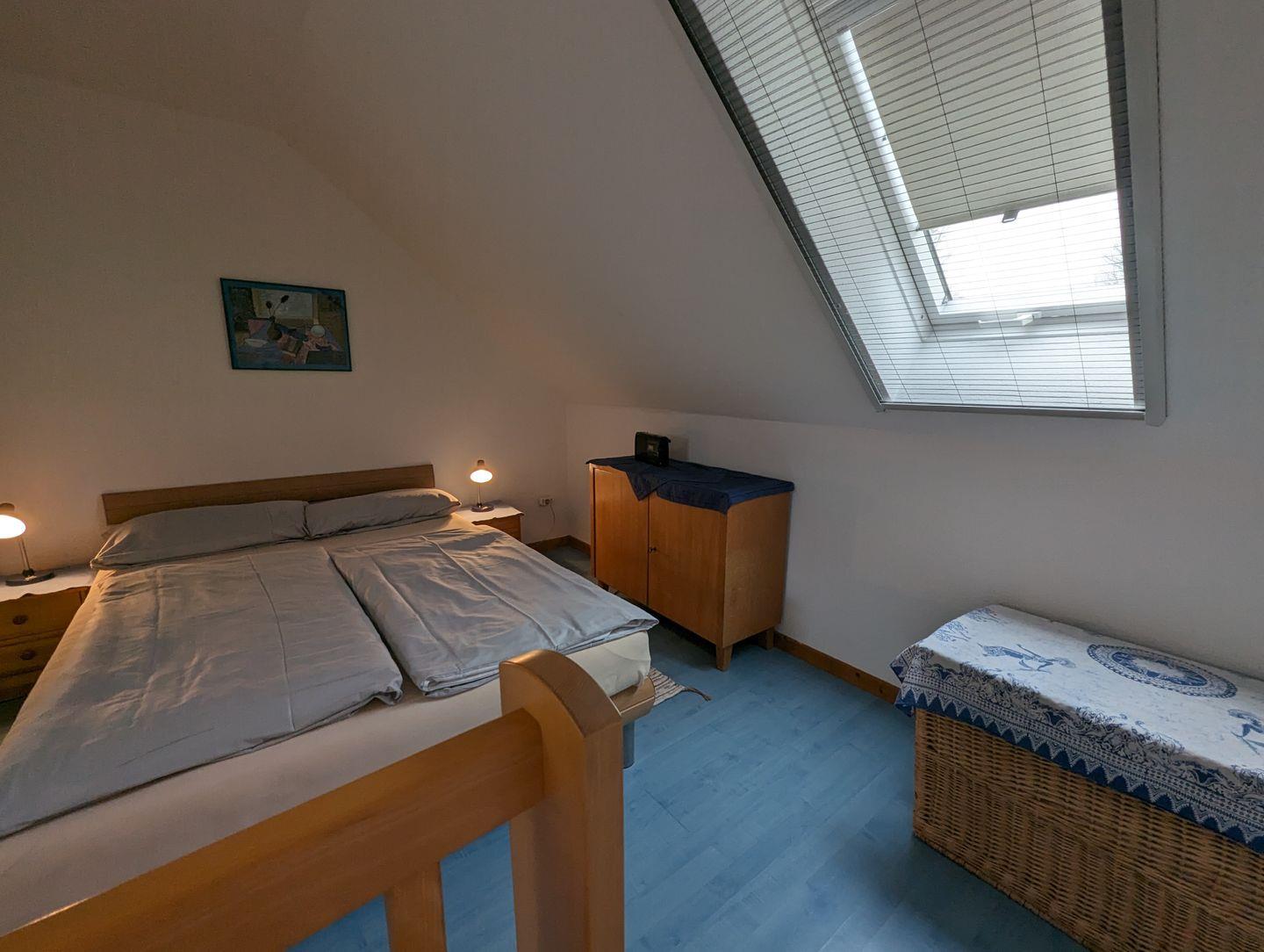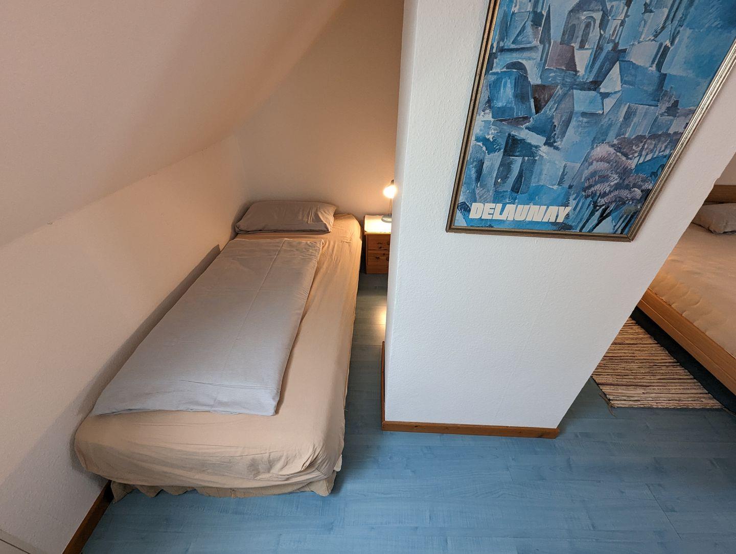Über eine Holztreppe gelangen Sie in die Schlafgalerie im Dachgeschoss. Diese bietet mit einem 90 cm und einem 140 cm breiten Bett ausreichend Platz für erholsame Nächte. Ein Kleiderschrank und kleine Möbelstücke sorgen für eine angenehme Atmosphäre.