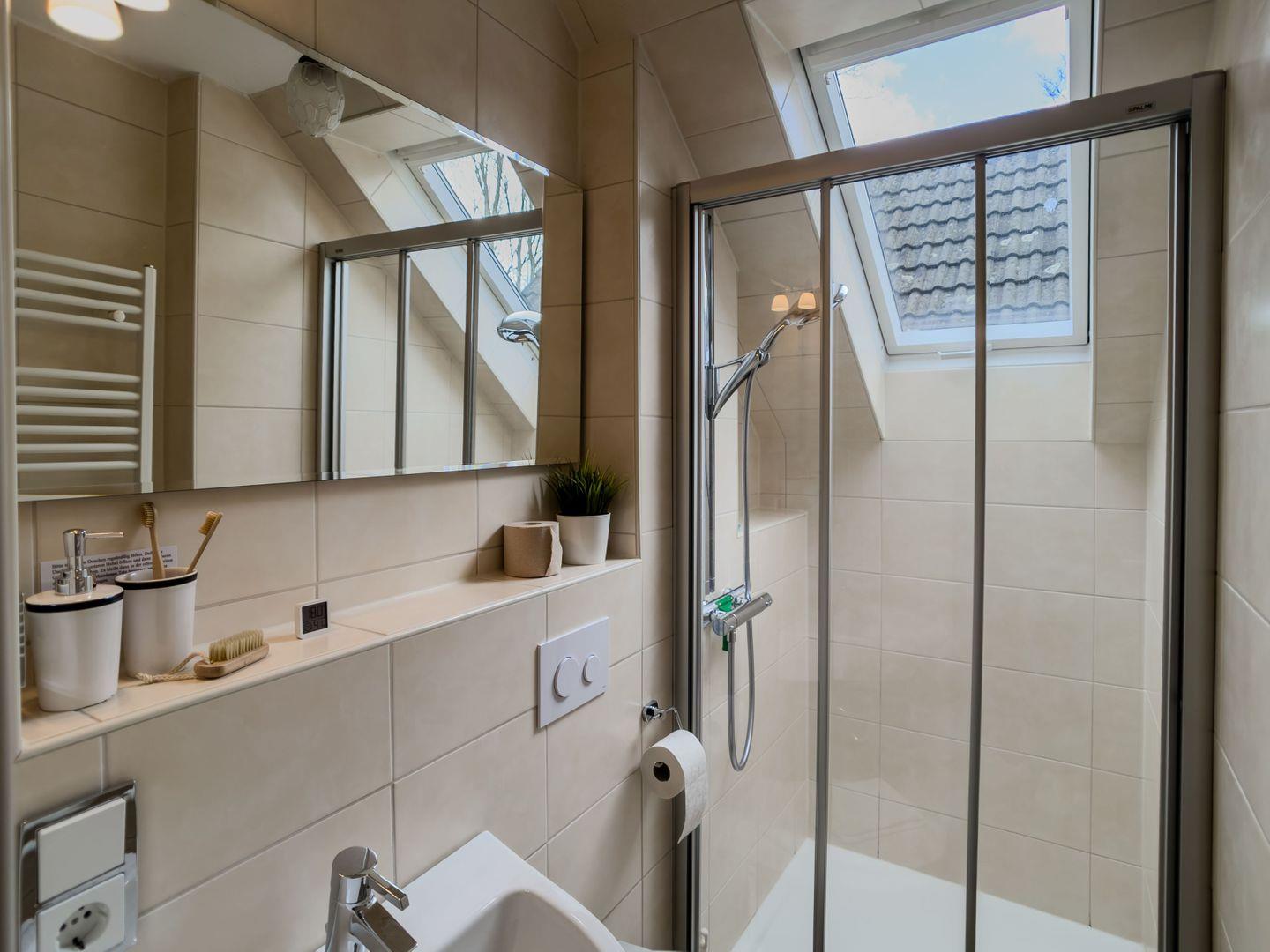 Das helle, freundliche Badezimmer im Erdgeschoss ist großzügig gestaltet und bietet Ihnen ausreichend Platz, um sich frisch zu machen. Hier können Sie den Tag in Ruhe beginnen oder ausklingen lassen.