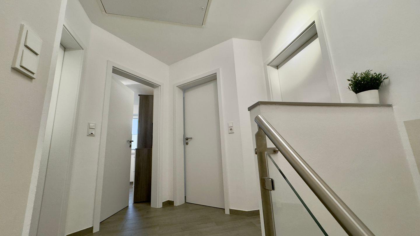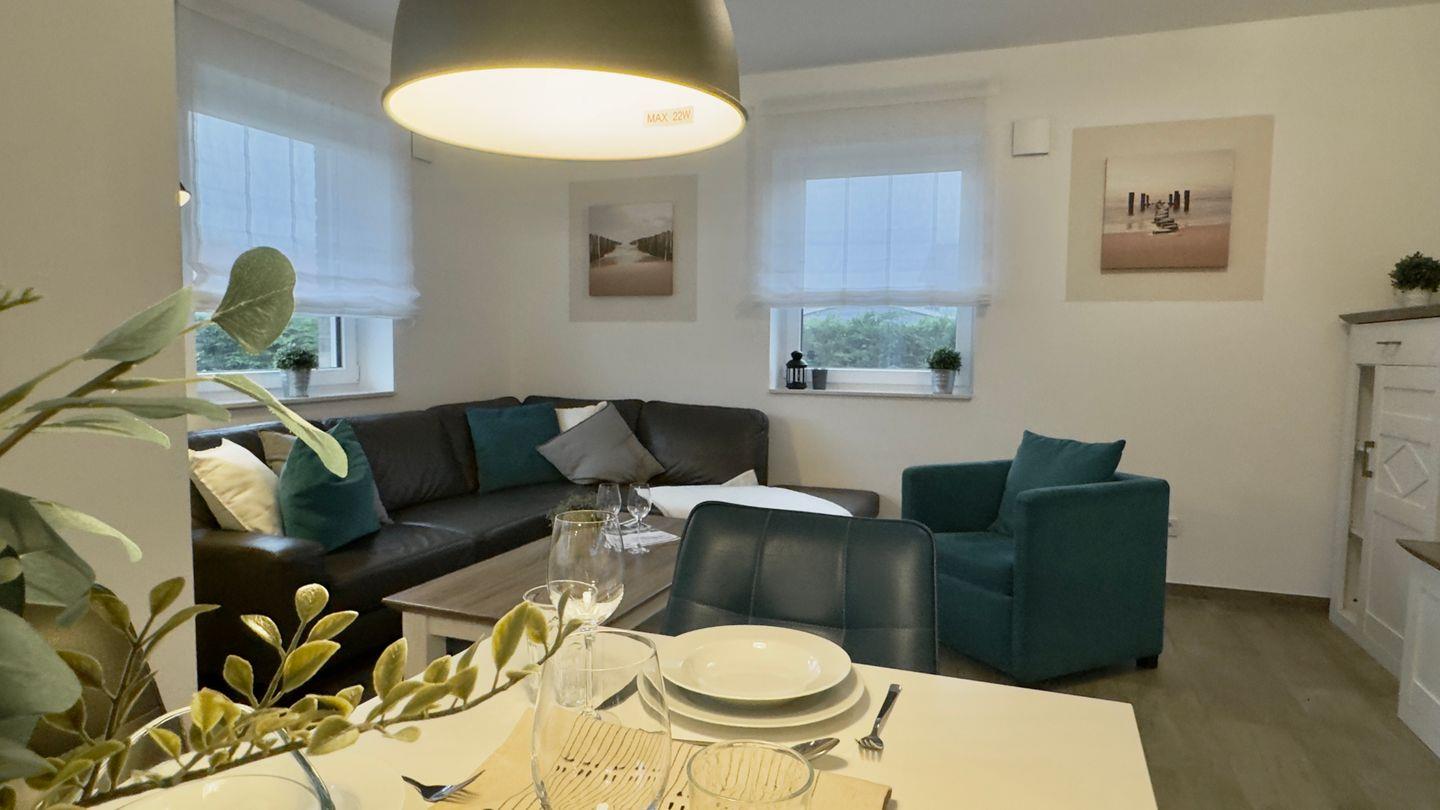 Bereits beim Betreten des Hauses empfangen Sie warme Naturtöne, die für ein wohliges Ambiente sorgen. Der einladende Flur mit Garderobe und Schuhschrank bietet genügend Stauraum für Jacken und Gepäck. Das angrenzende, lichtdurchflutete Wohnzimmer mit gemütlichem Sofa lädt zum Entspannen ein, während der Essbereich ausreichend Platz für gemeinsame Mahlzeiten oder Spieleabende bietet.