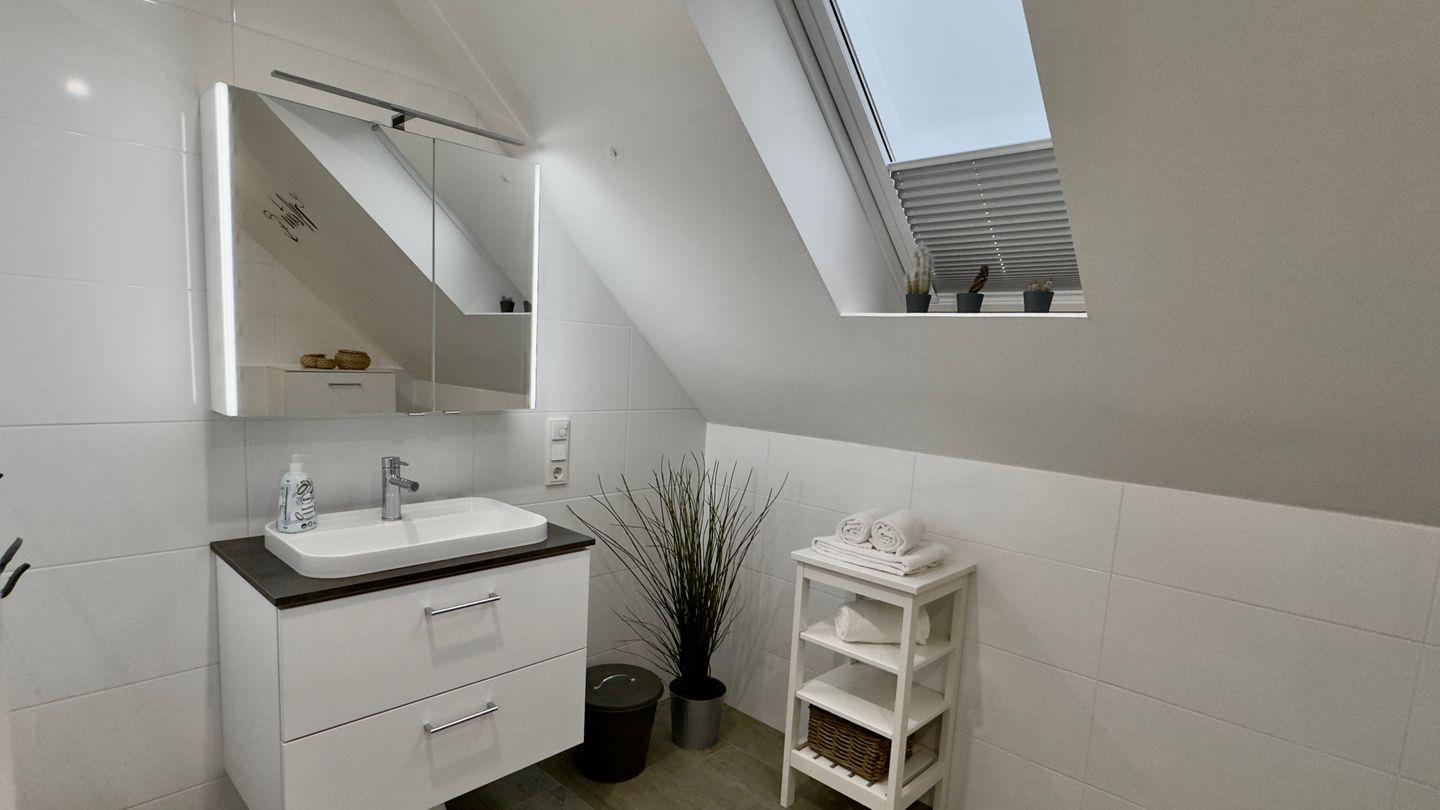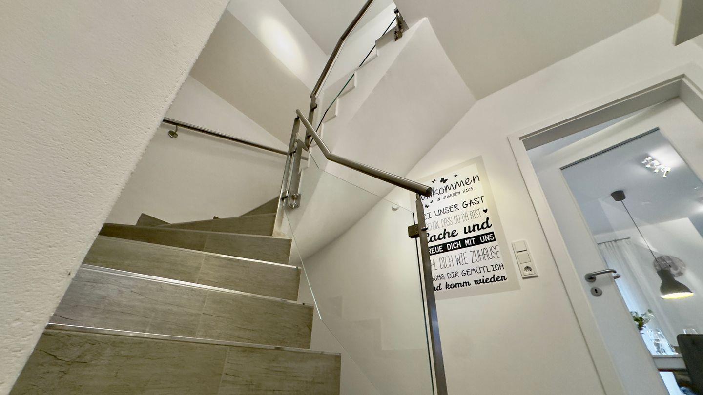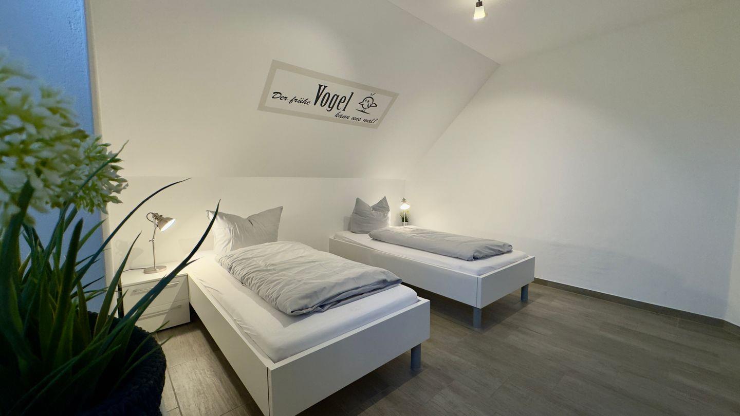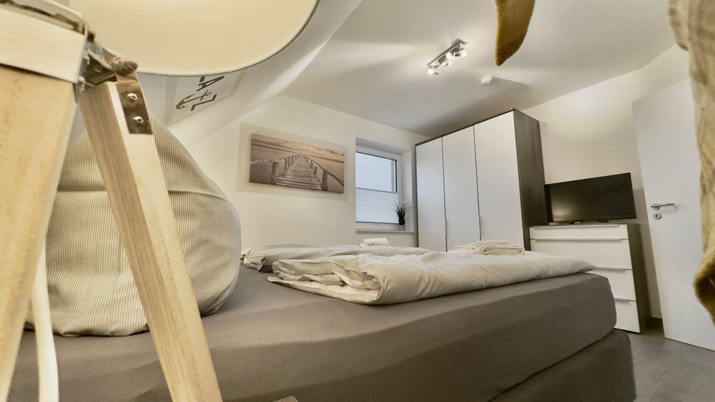 Über die massive Steintreppe gelangen Sie ins Obergeschoss. Hier erwarten Sie zwei weitere Schlafzimmer: eines mit einem komfortablen Boxspringbett (2x2 m), das andere mit zwei Einzelbetten – perfekt für Kinder oder weitere Gäste. Auch auf dieser Etage steht Ihnen ein modernes Tageslichtbad mit ebenerdiger Dusche zur Verfügung.